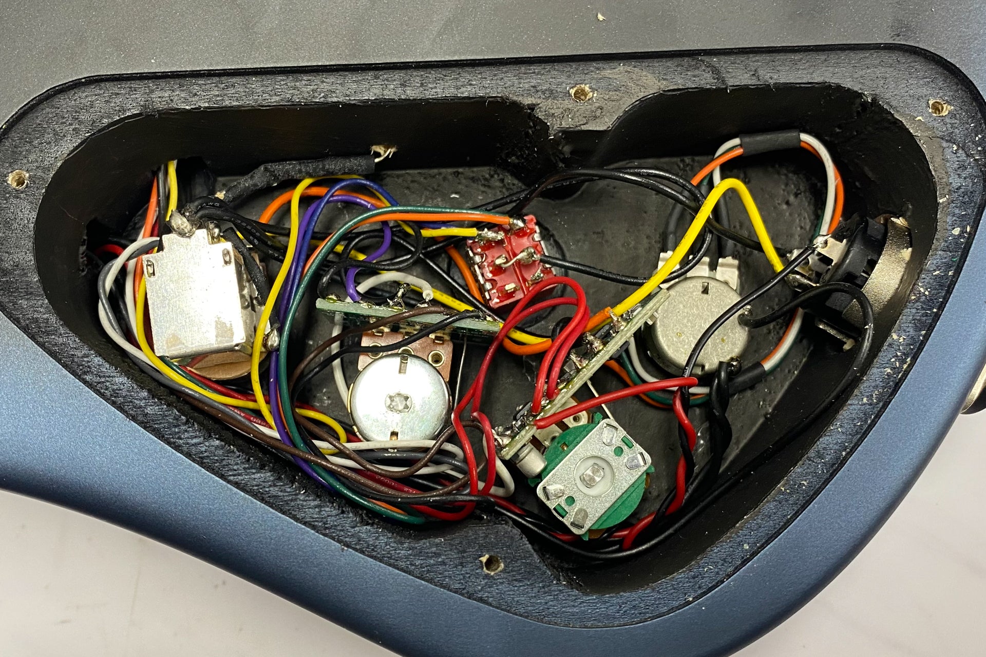 Controls: Master volume (pull-single coil mode), balancer, treble/bass, middle, 3-way voice select switch