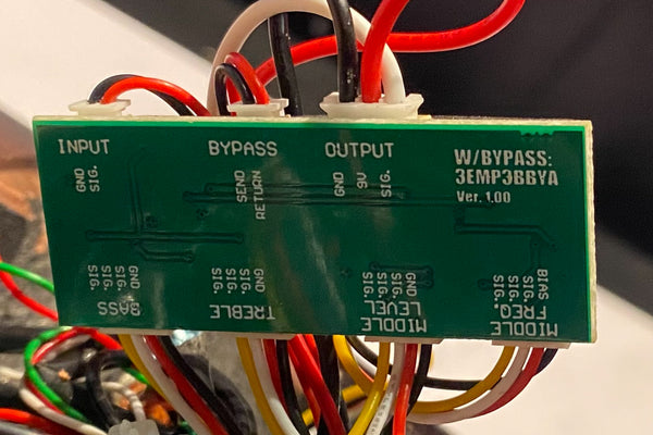 Controls: Master volume, balancer, active/passive switch, bass, middle, treble, and middle frequency switches