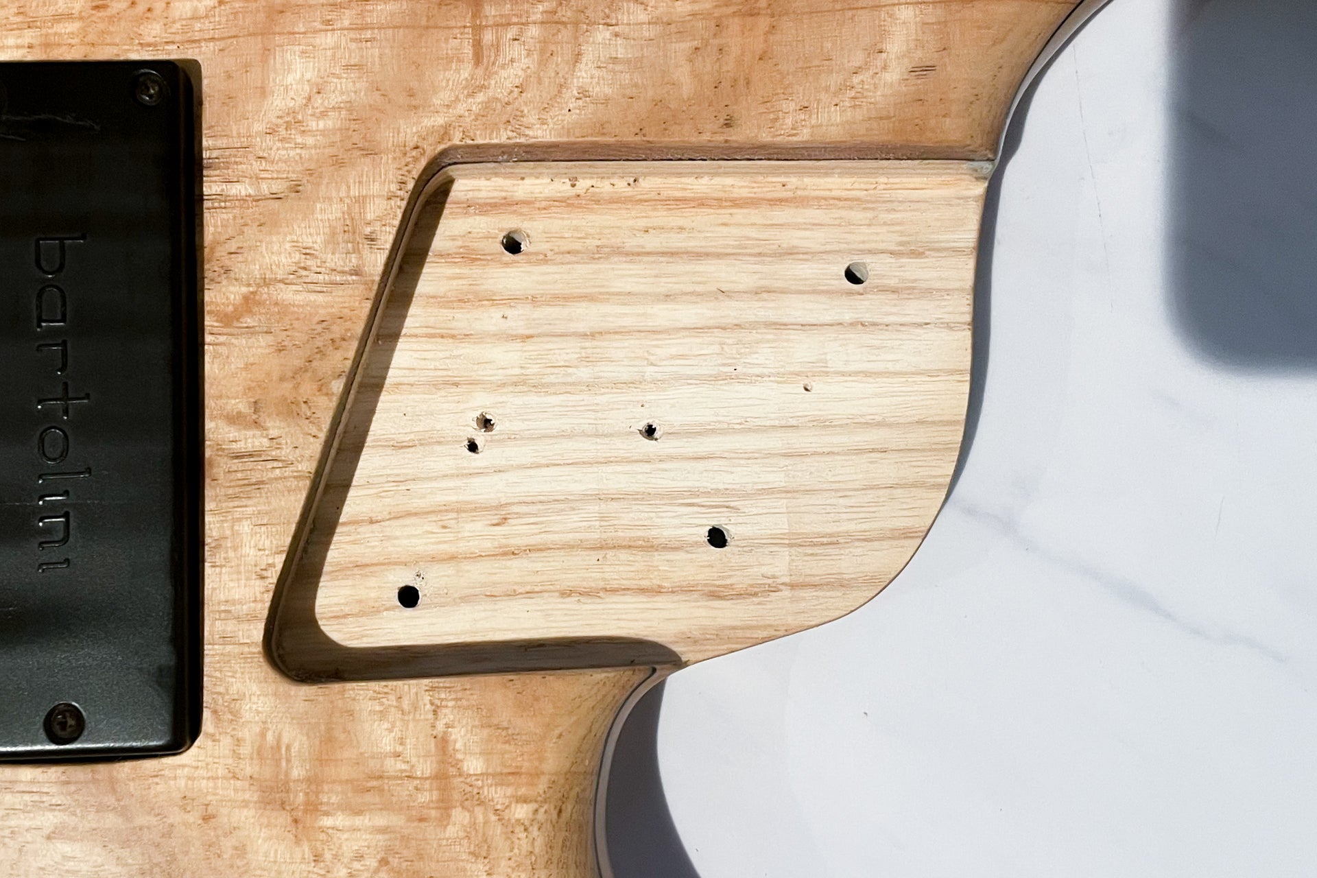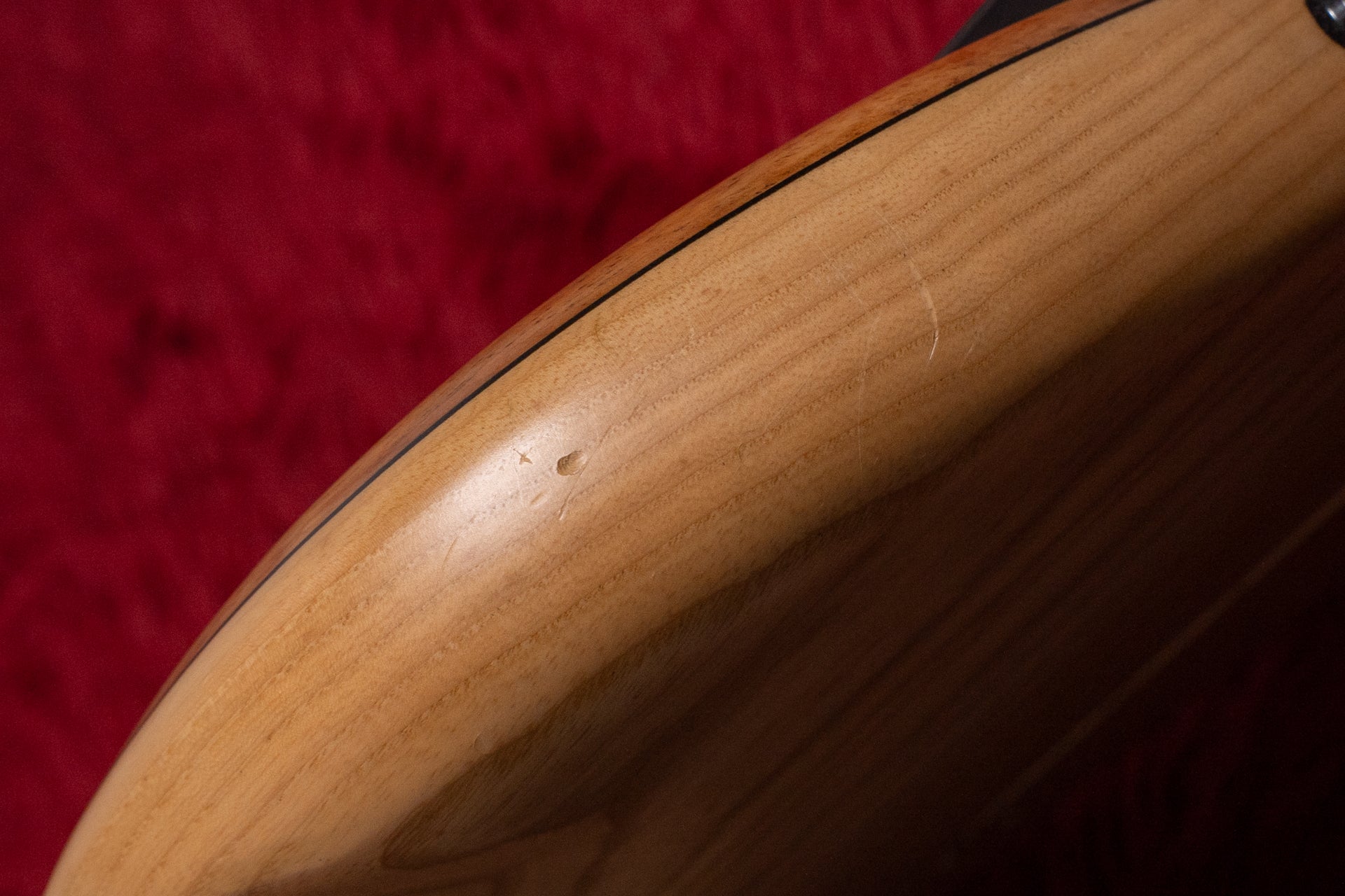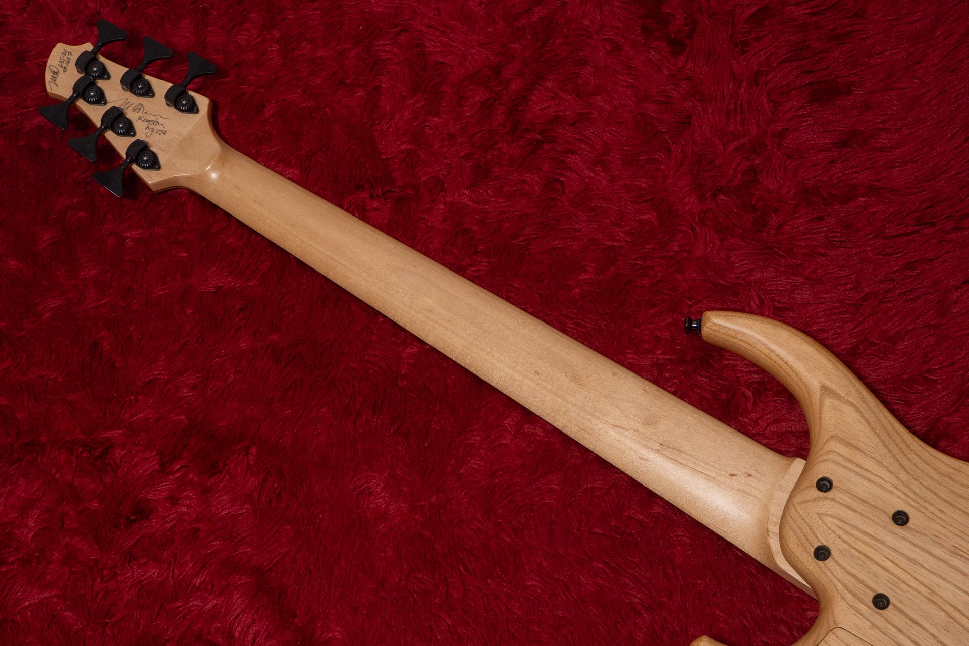 The body back is ash, the neck is maple, and the fingerboard is ebony.
