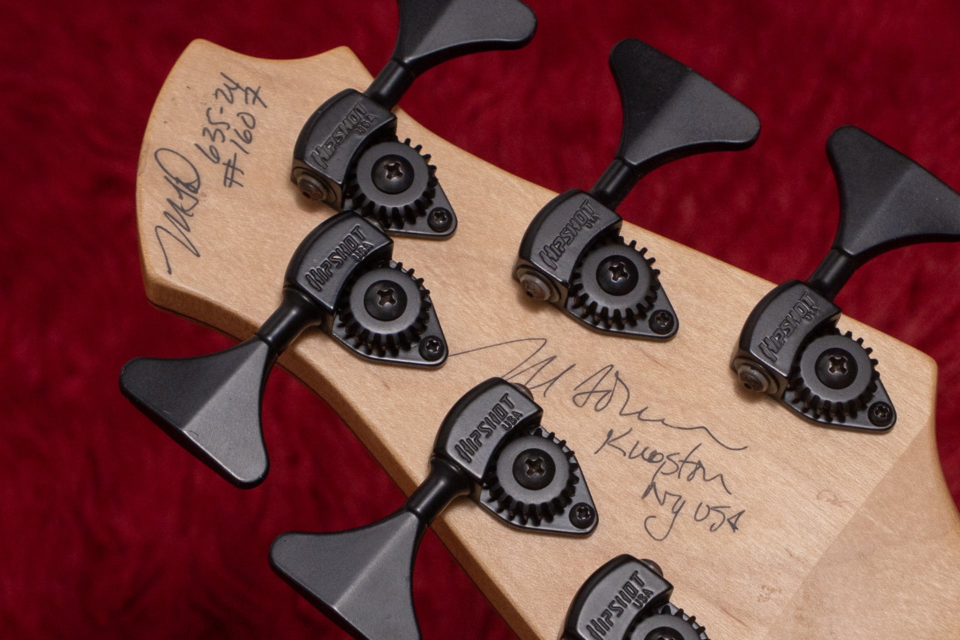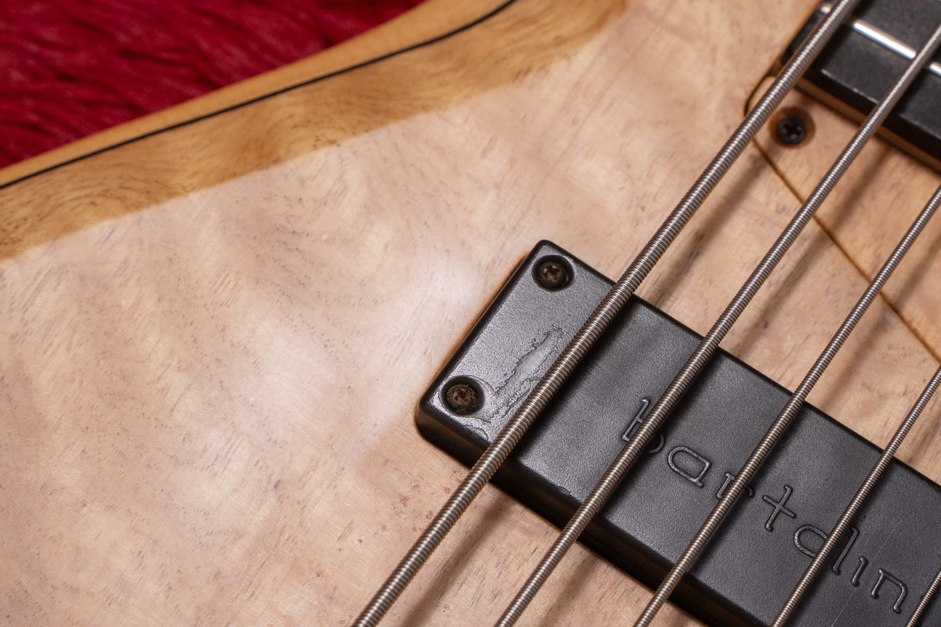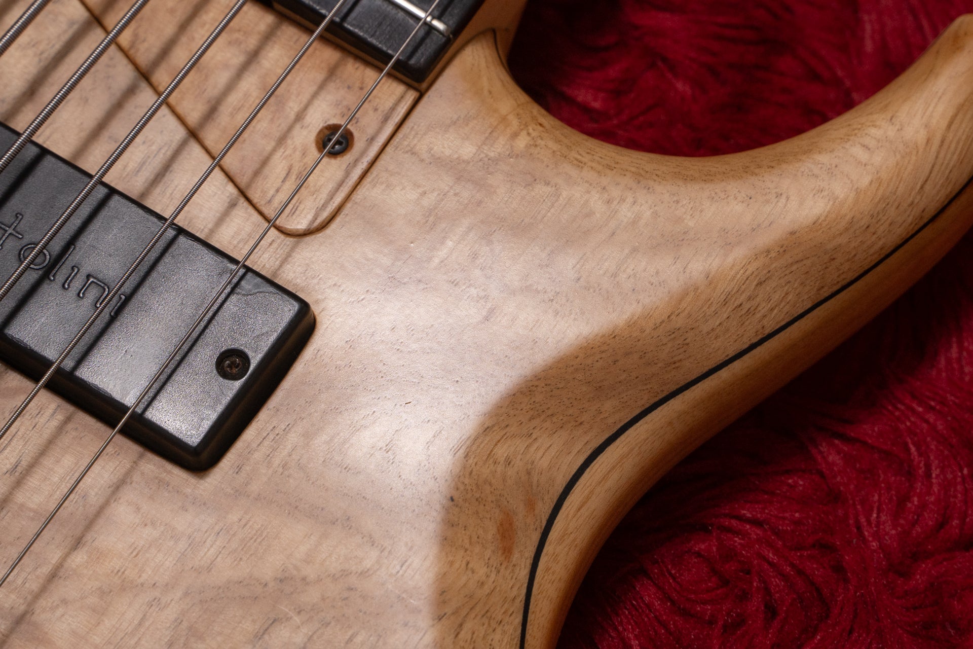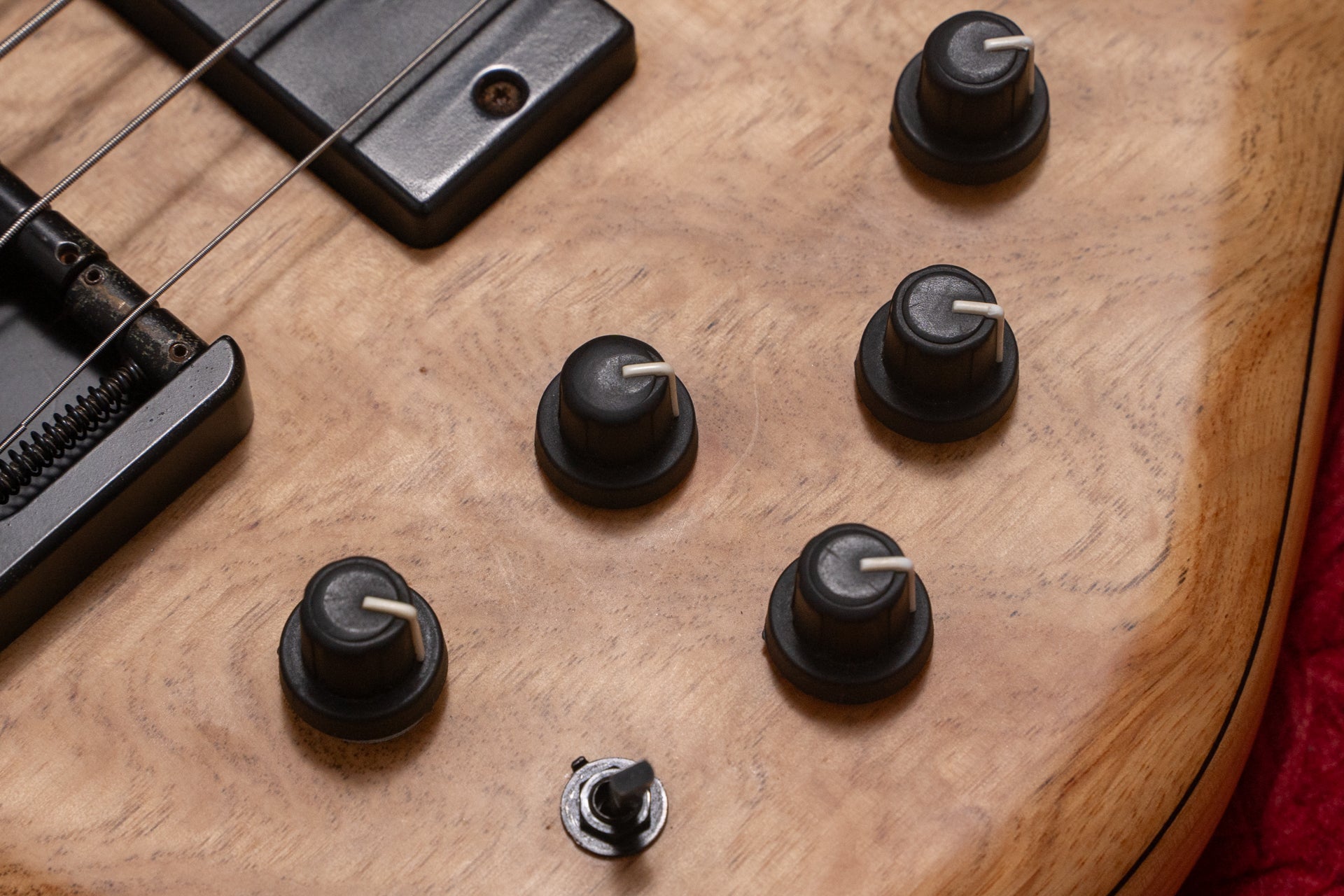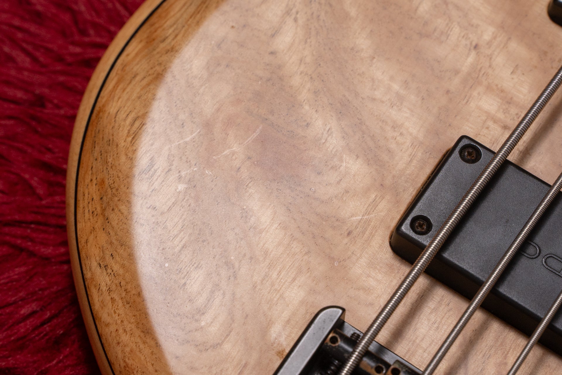 The guitar has been modified from fretless to fretted. Because the preamp has been replaced with an Aguilar OBP-2, one knob has been replaced with a dummy knob and the switch has been modified to a mute switch.