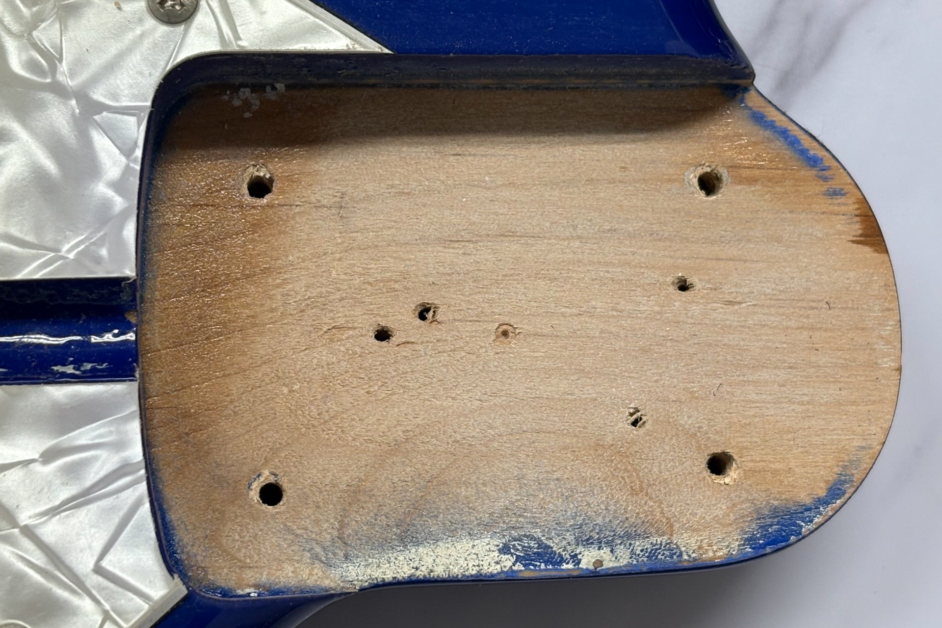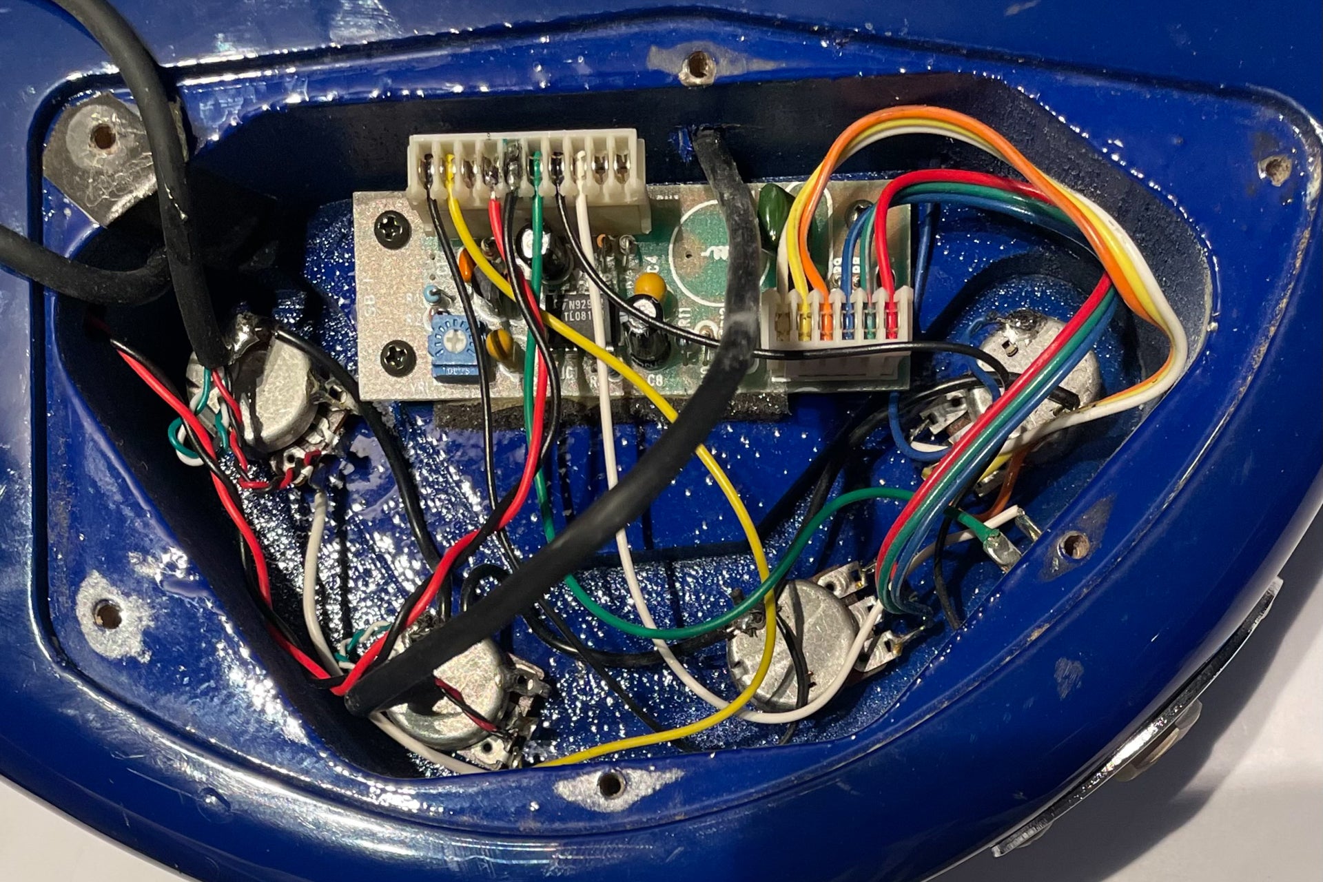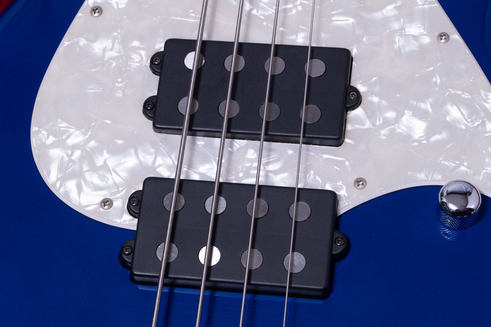 Controls: Neck PU volume, Bridge PU volume, Treble, Bass, Preamp gain (inside cavity)