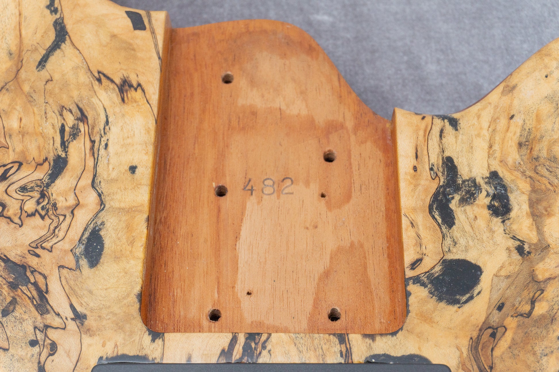 The body back is likely Mahogany, while the top features beautifully figured Spalted Maple.