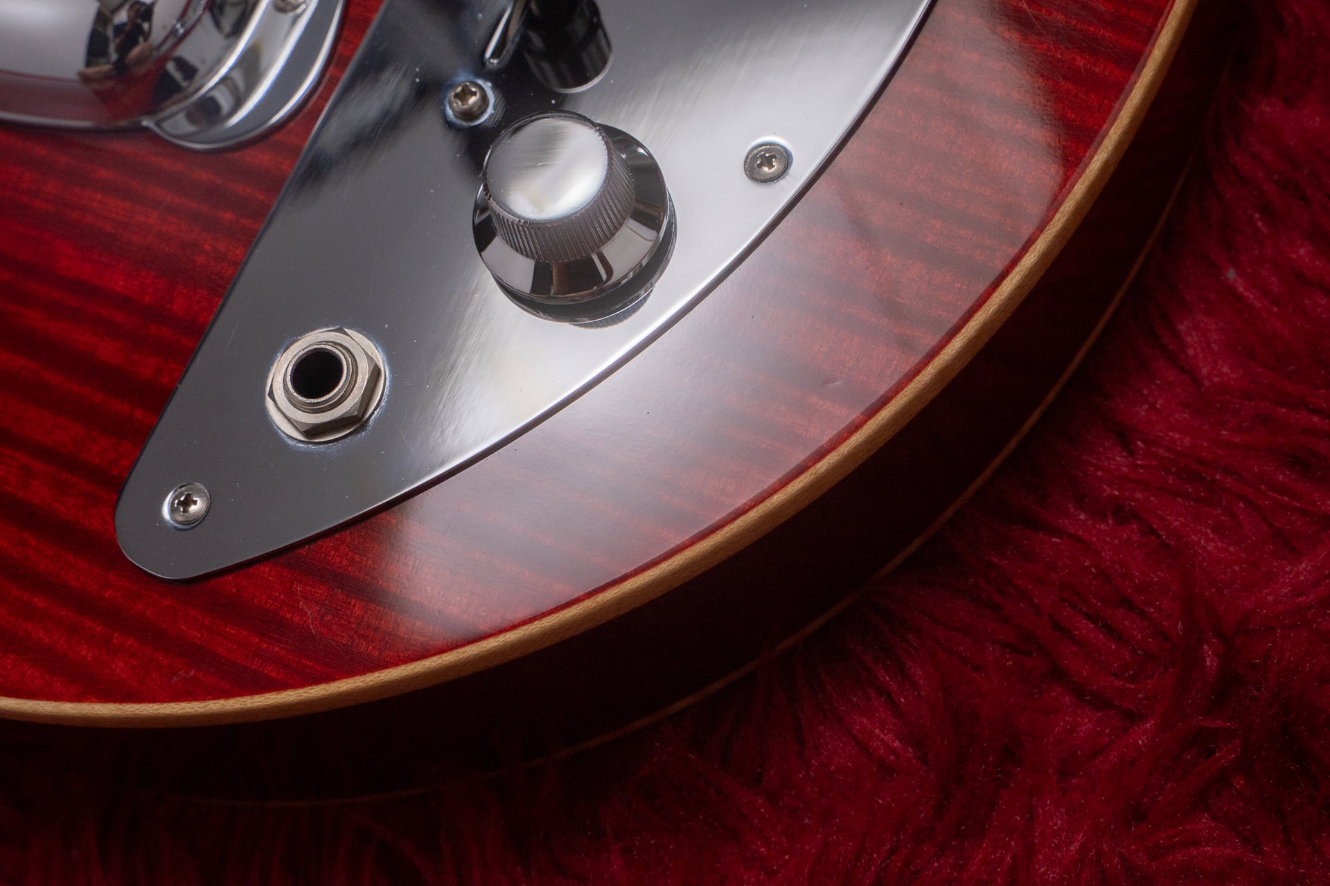 The body top is made of flame maple, the back is mahogany, and the fingerboard is rosewood.