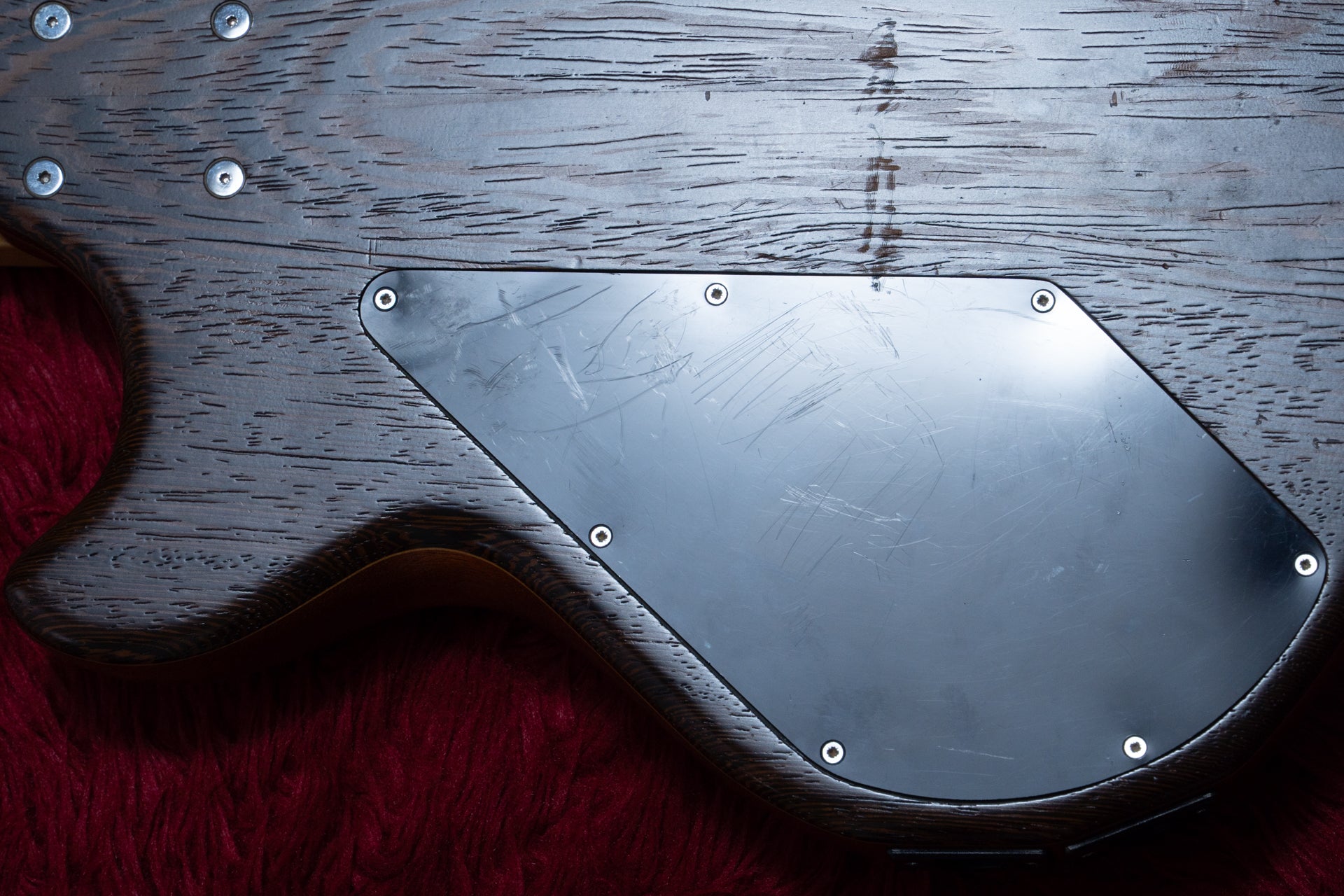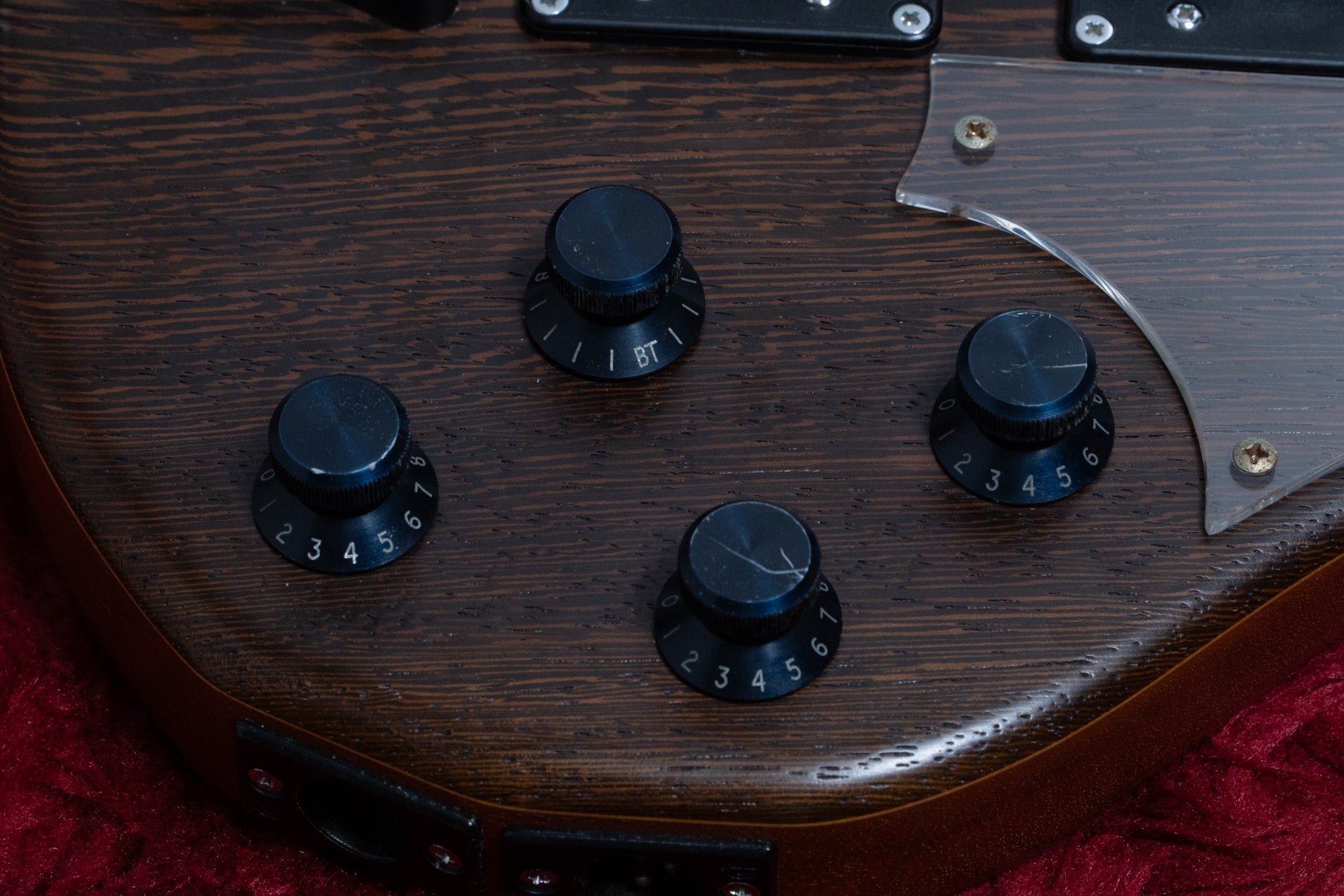 Controls: Master volume (when pulled - pick attack mode), balancer, neck PU tone (when pulled - boosts frequencies around the cut by 10db), bridge PU tone (when pulled - boosts frequencies around the cut by 10db) Cavity neck PU low cut trim, bridge PU low cut trim, pick attack trim (treble boost), gain trim