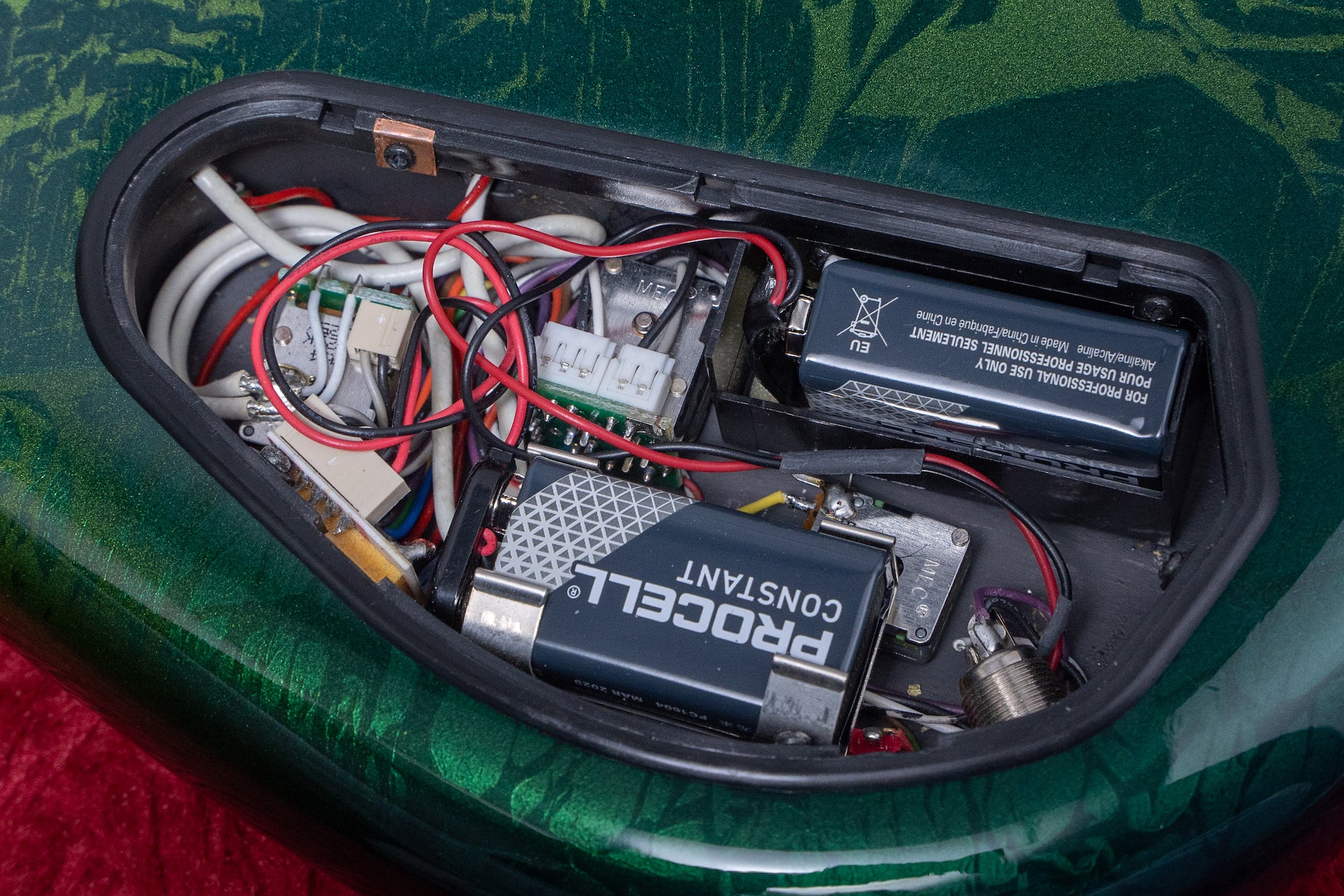 In addition, the fingerboard inlays have LEDs built in and glow.