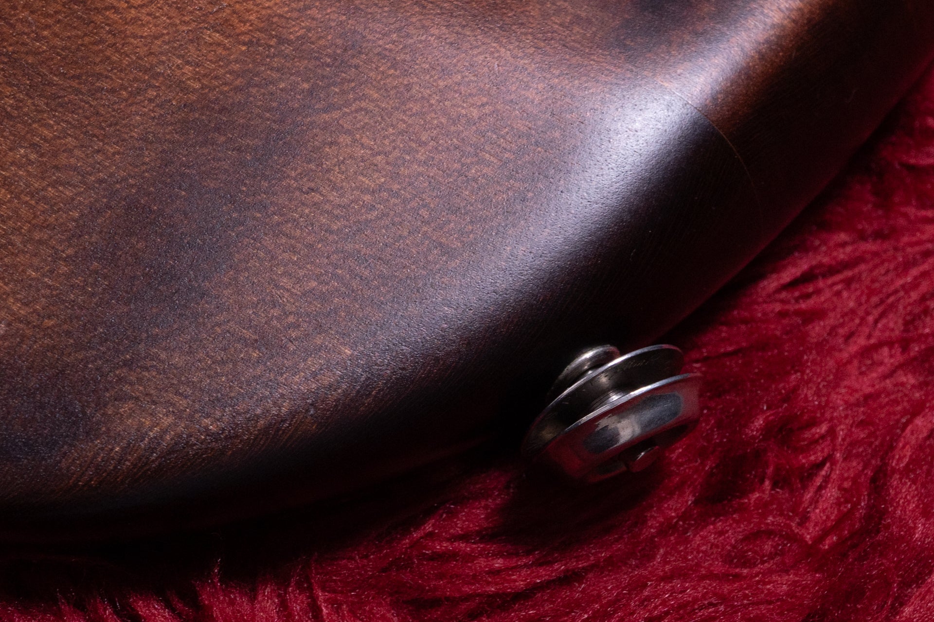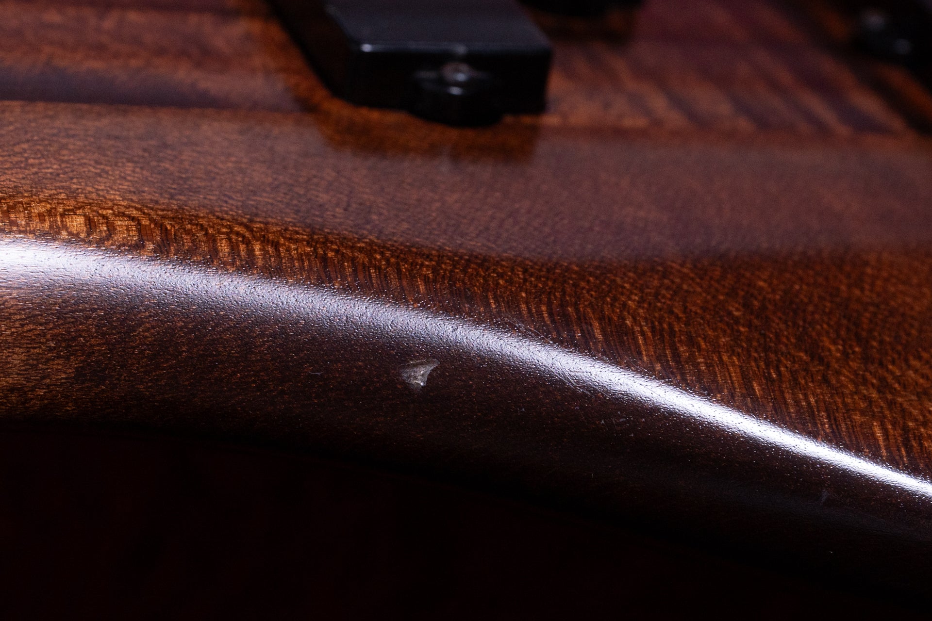 The body and paint show scratches and dents overall, and there are occasional scratches on the back of the body that appear to have been caused by the buckle.
