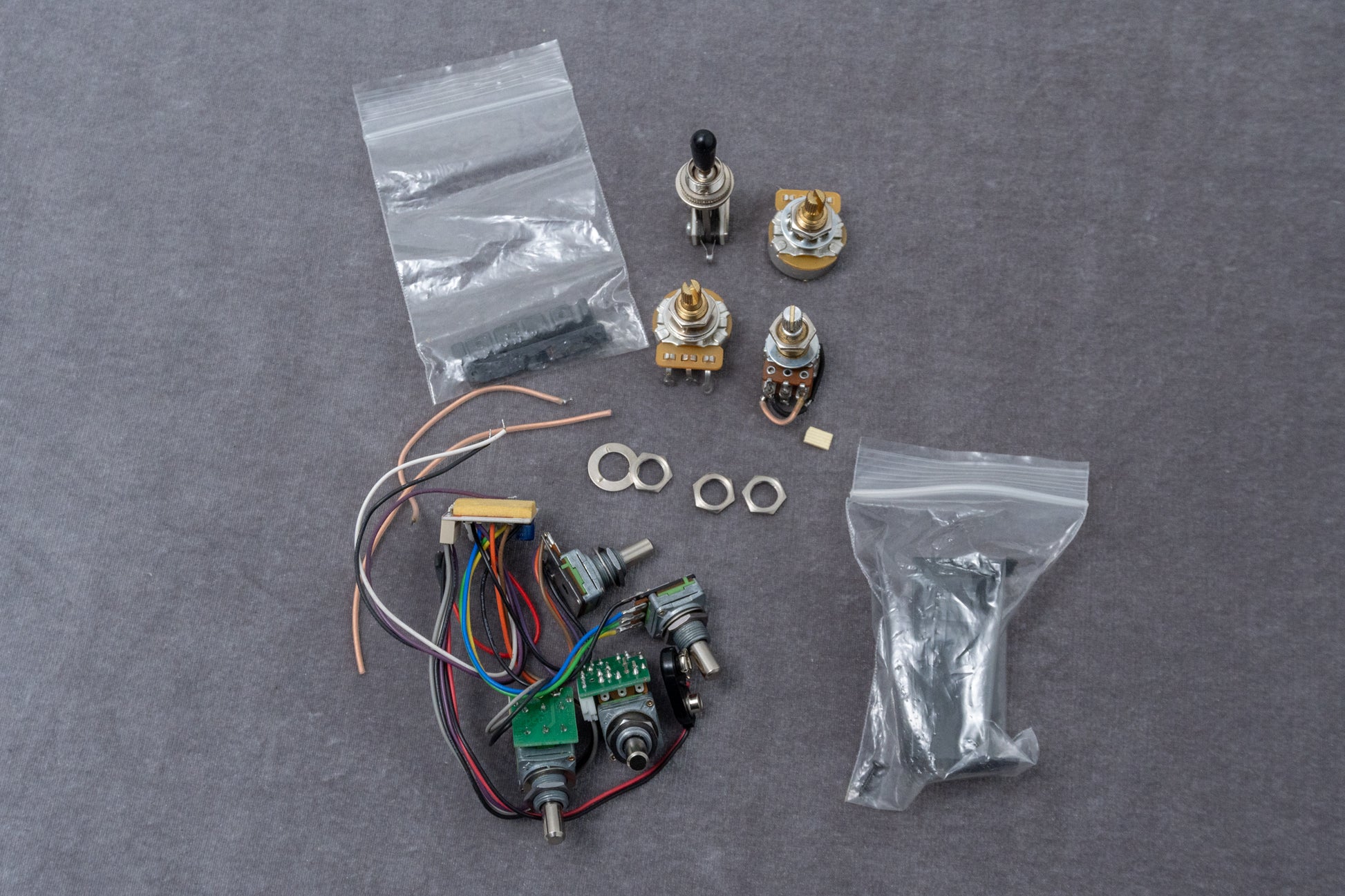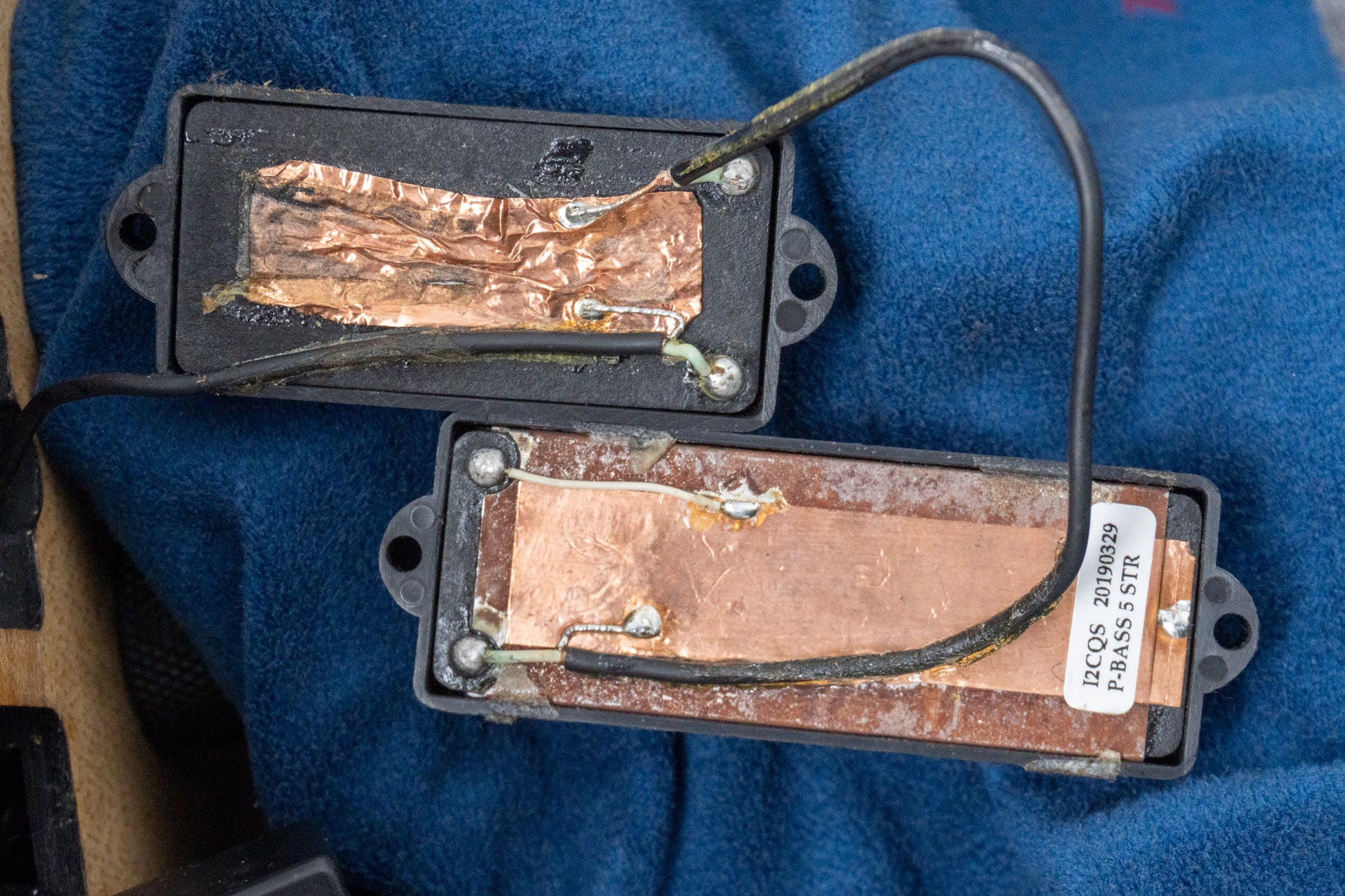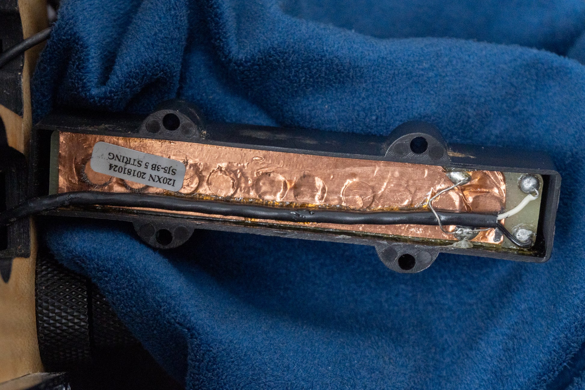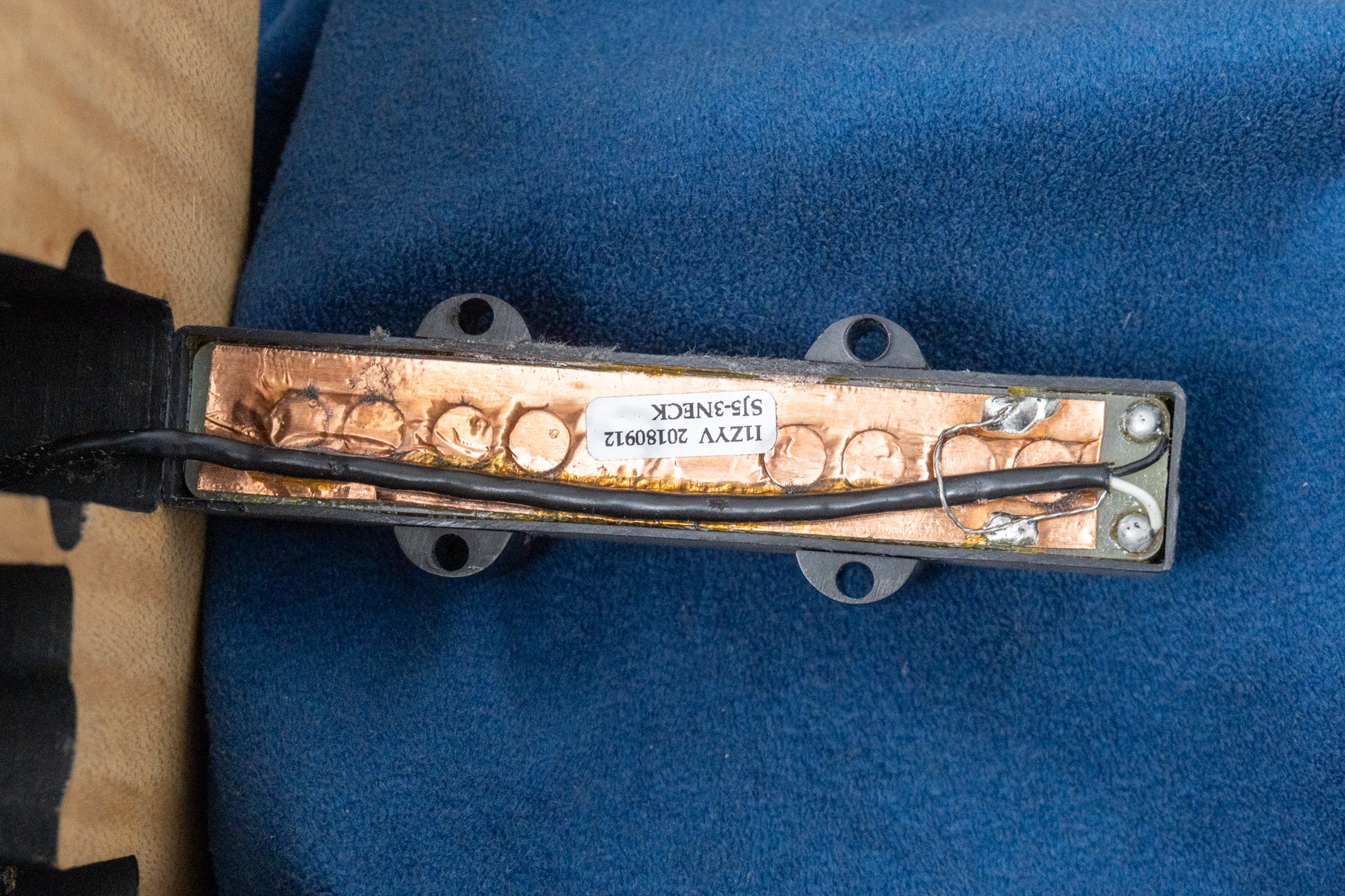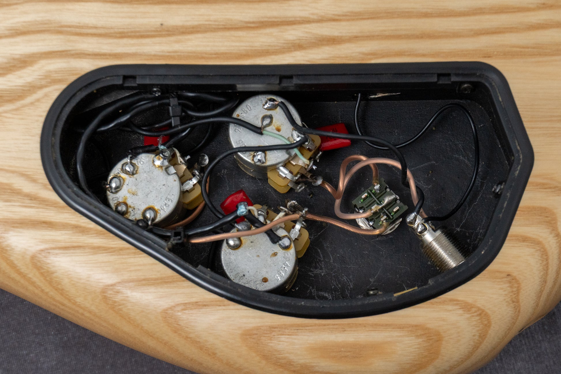The body and finish have been newly routed to accommodate the added center pickup. Furthermore, the bridge pickup has been relocated. The original bridge pickup routing was filled and then newly routed.