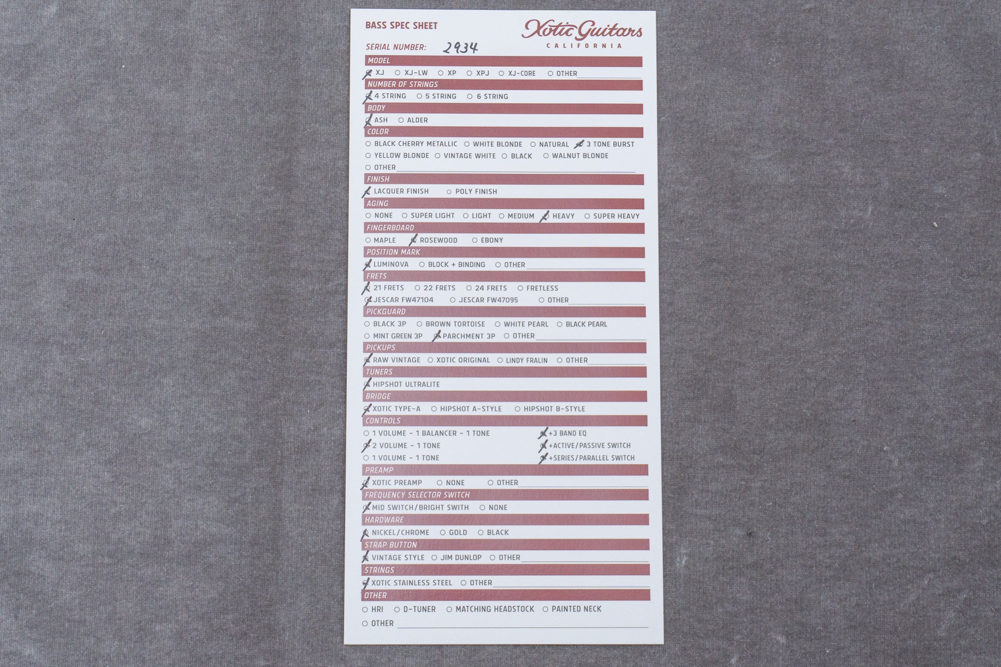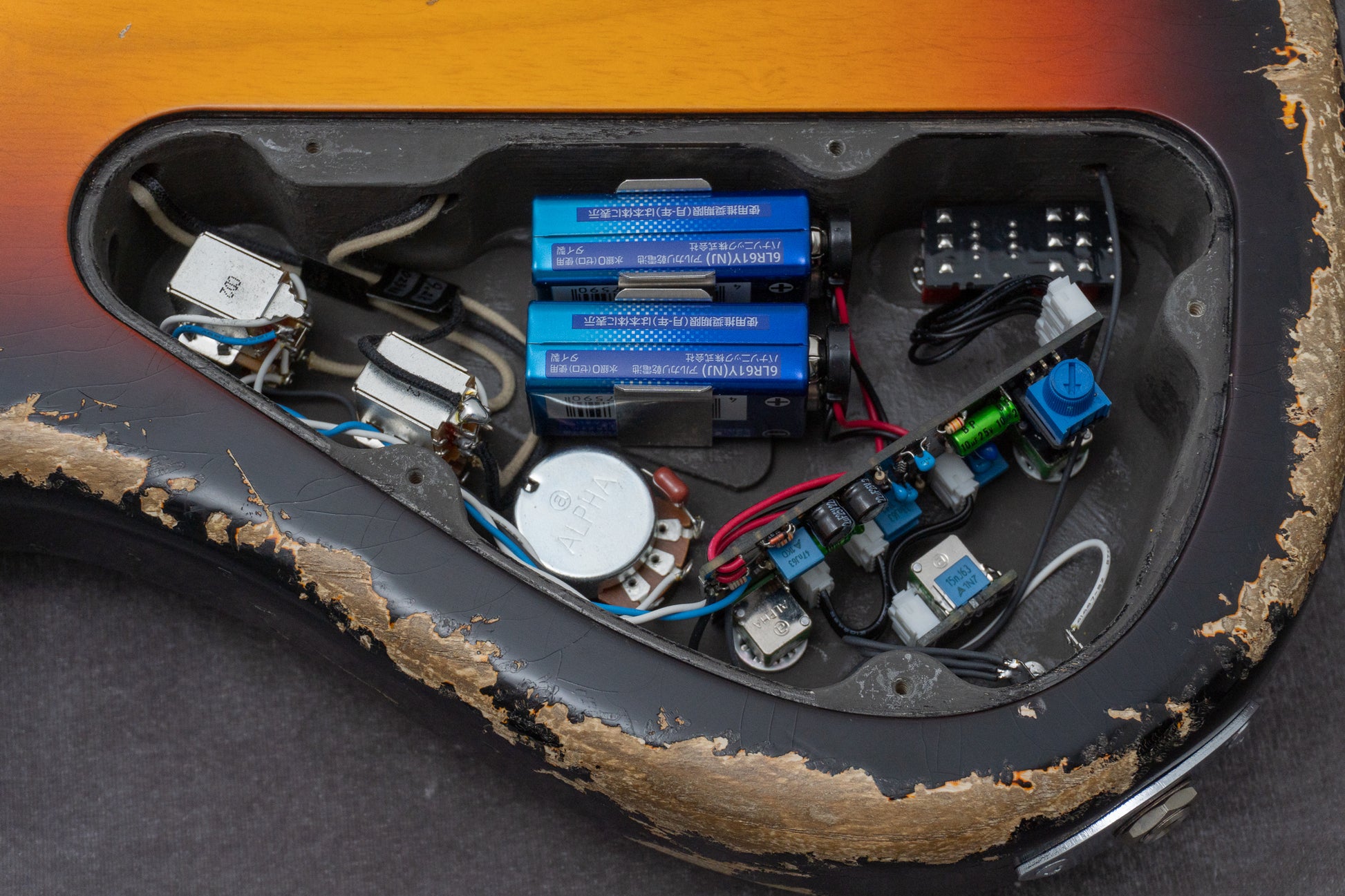 Controls: Neck PU volume (active/passive switch), bridge PU volume (series/parallel switch), tone, bass, mid, treble, mid frequency switch, treble frequency switch, preamp gain (inside the cavity)