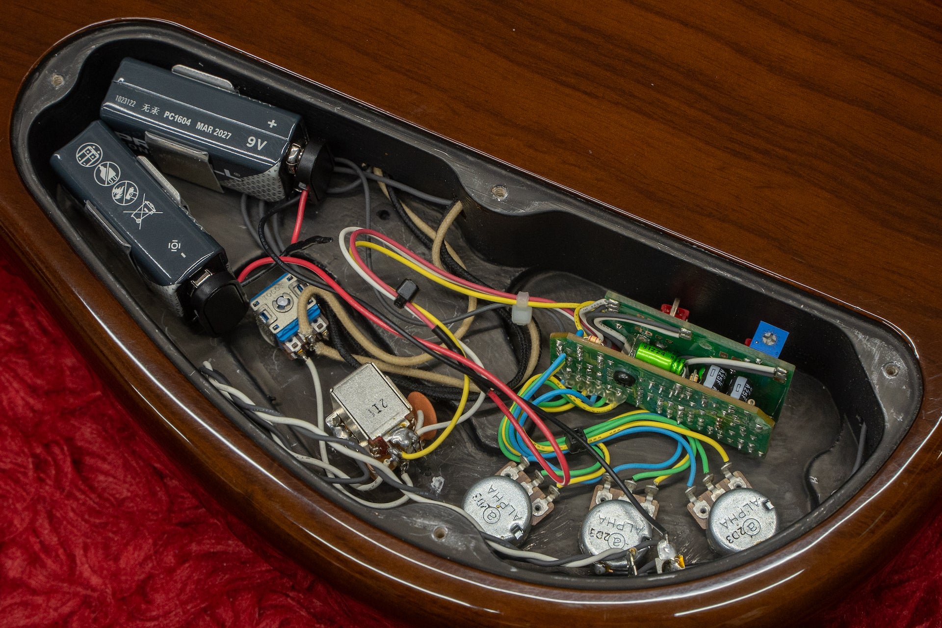 Controls: neck volume/bridge volume, master tone - push/pull (active/passive), bass, middle, treble, middle frequency switch, treble frequency switch, preamp gain (in cavity).