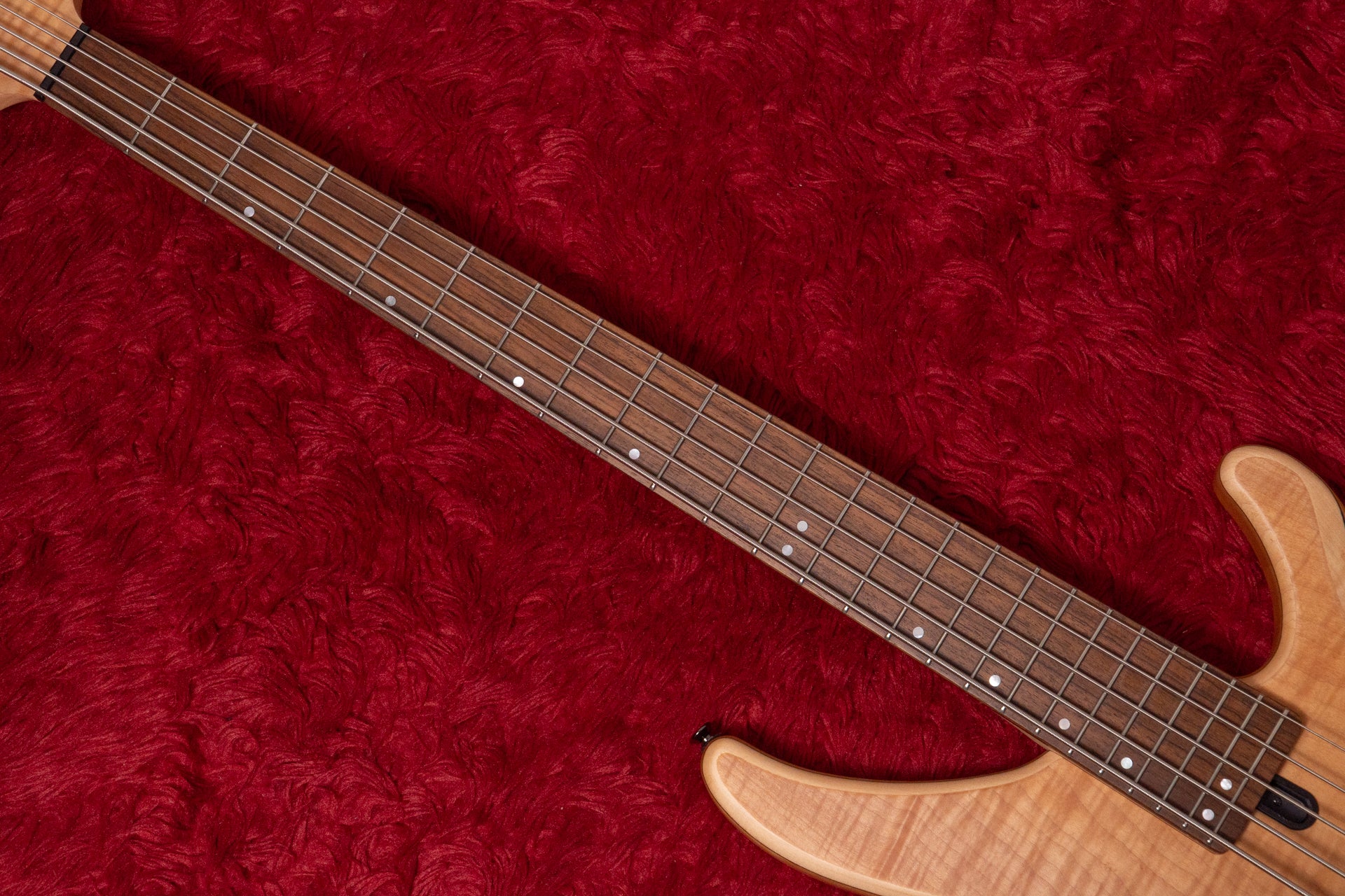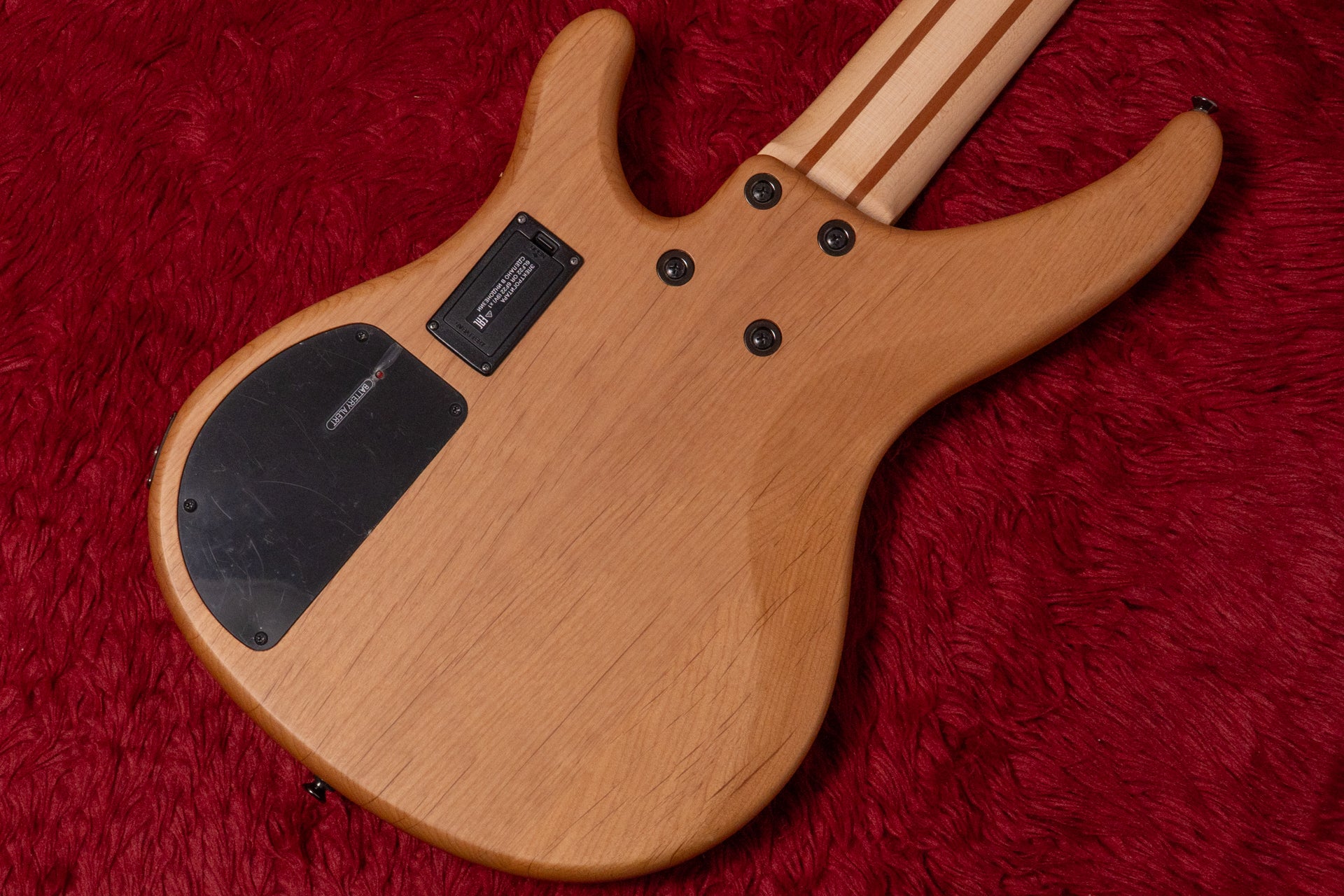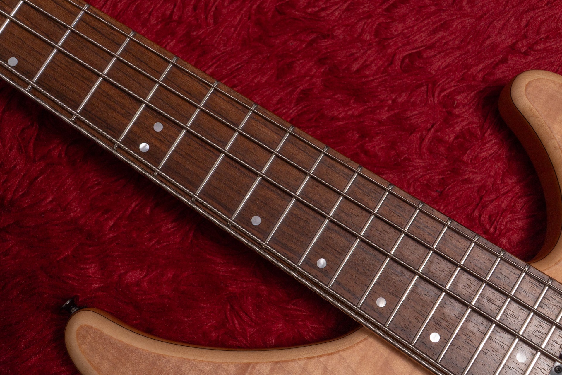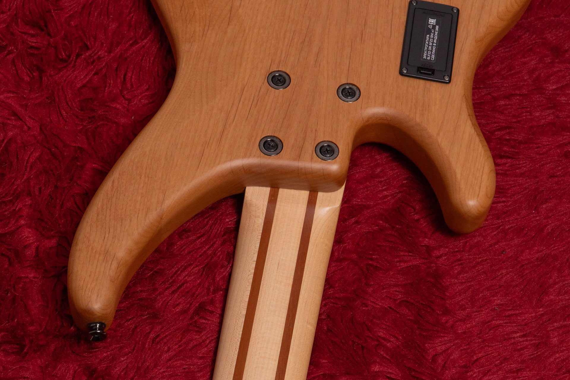 The neck is a five-piece design made of maple and mahogany, and the fingerboard is rosewood.