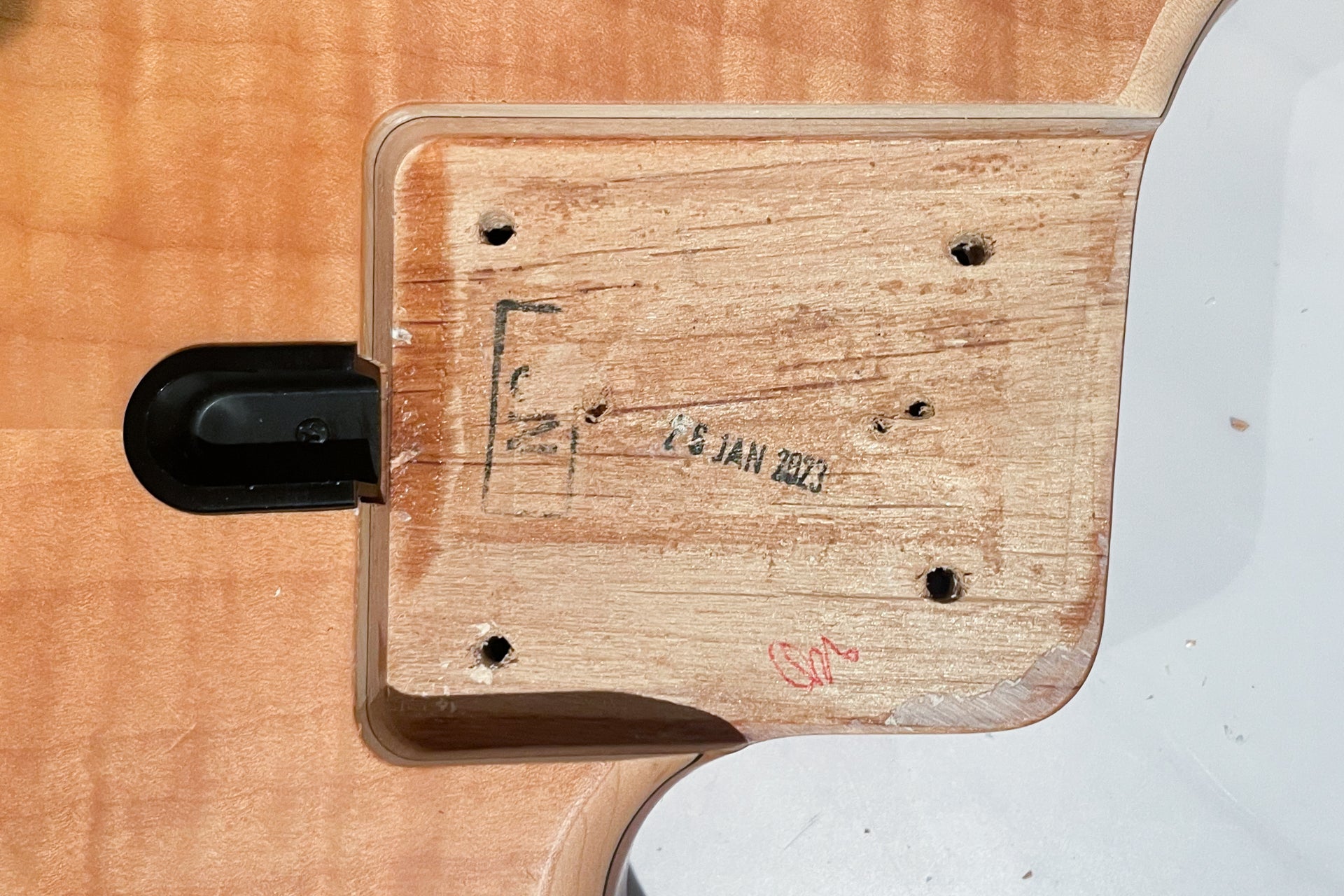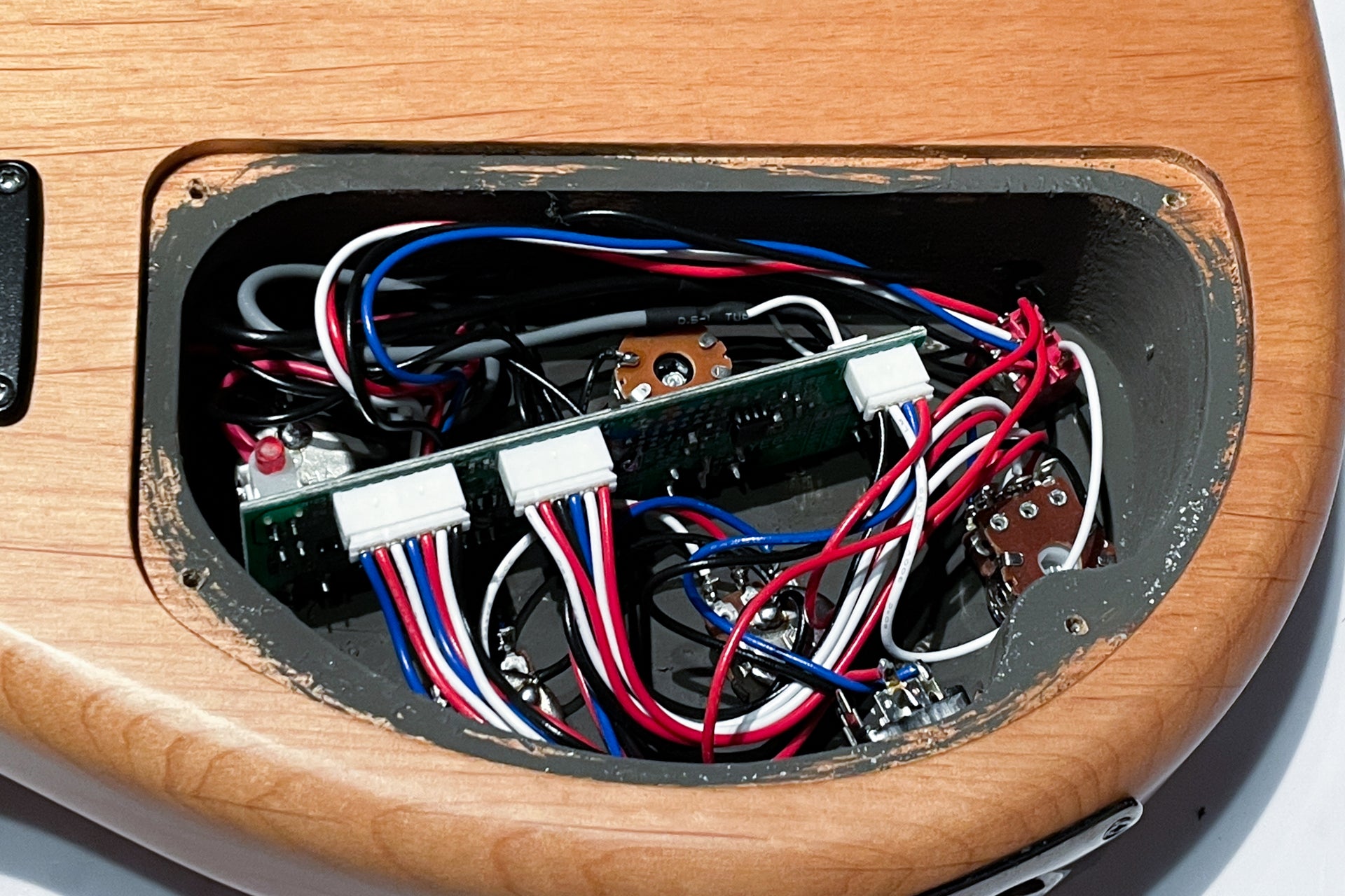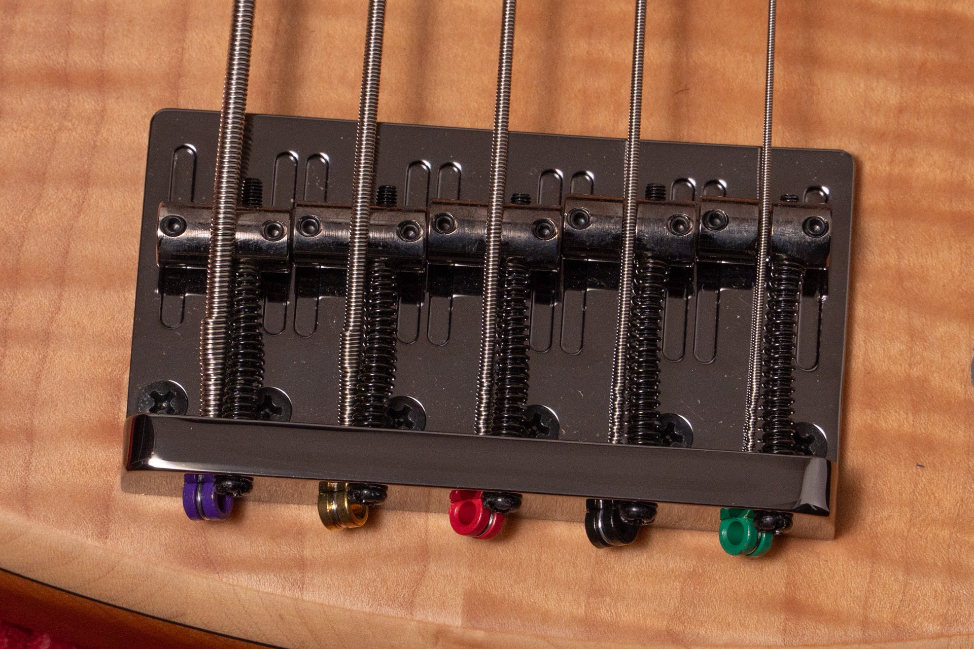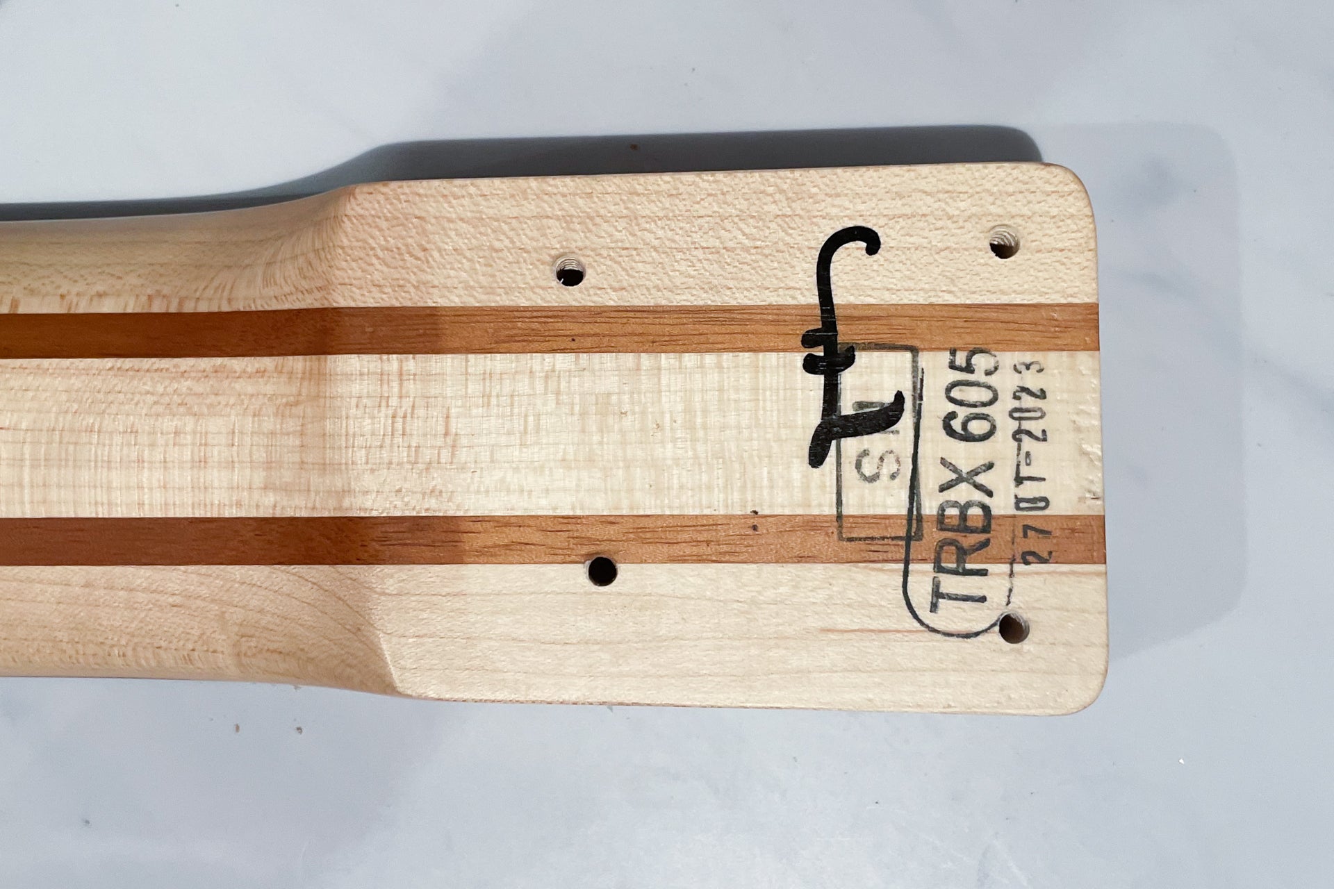 The neck is a five-piece design made of maple and mahogany, and the fingerboard is rosewood.
