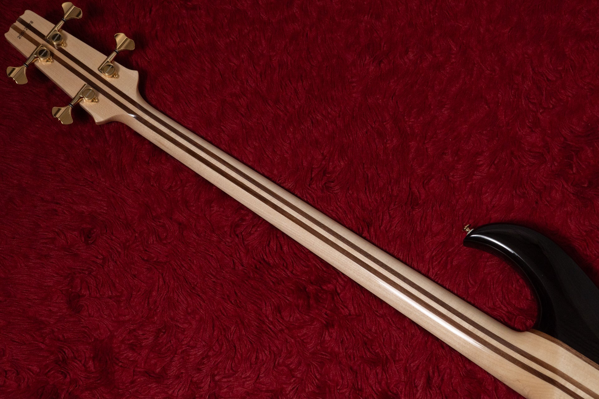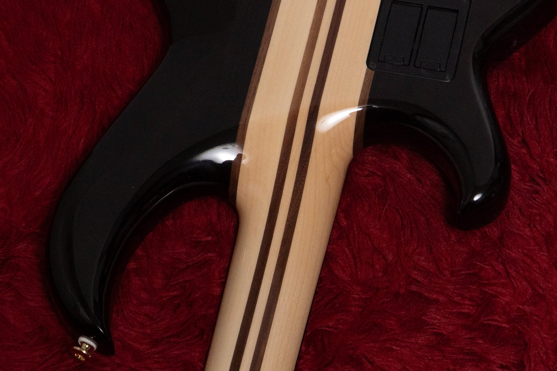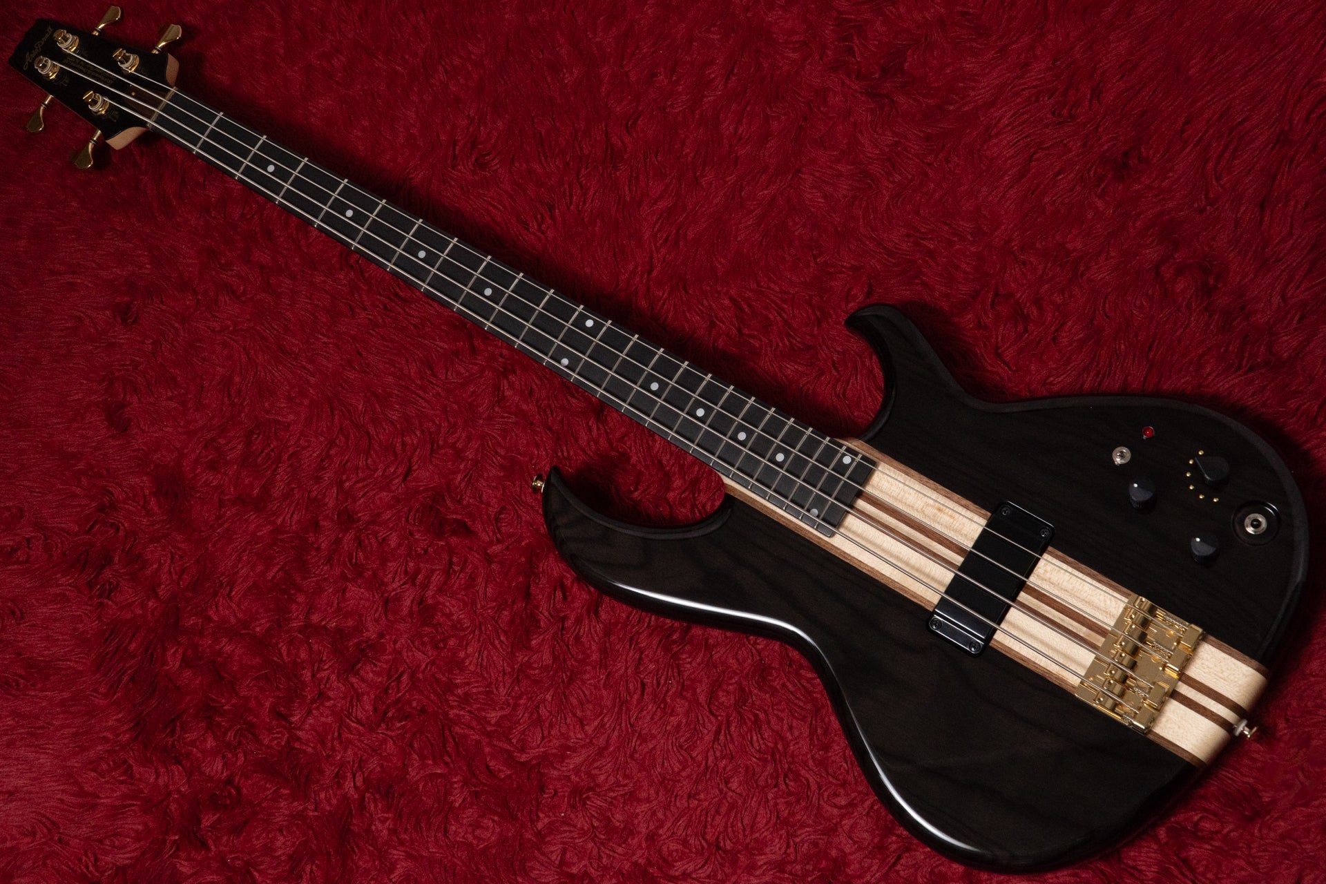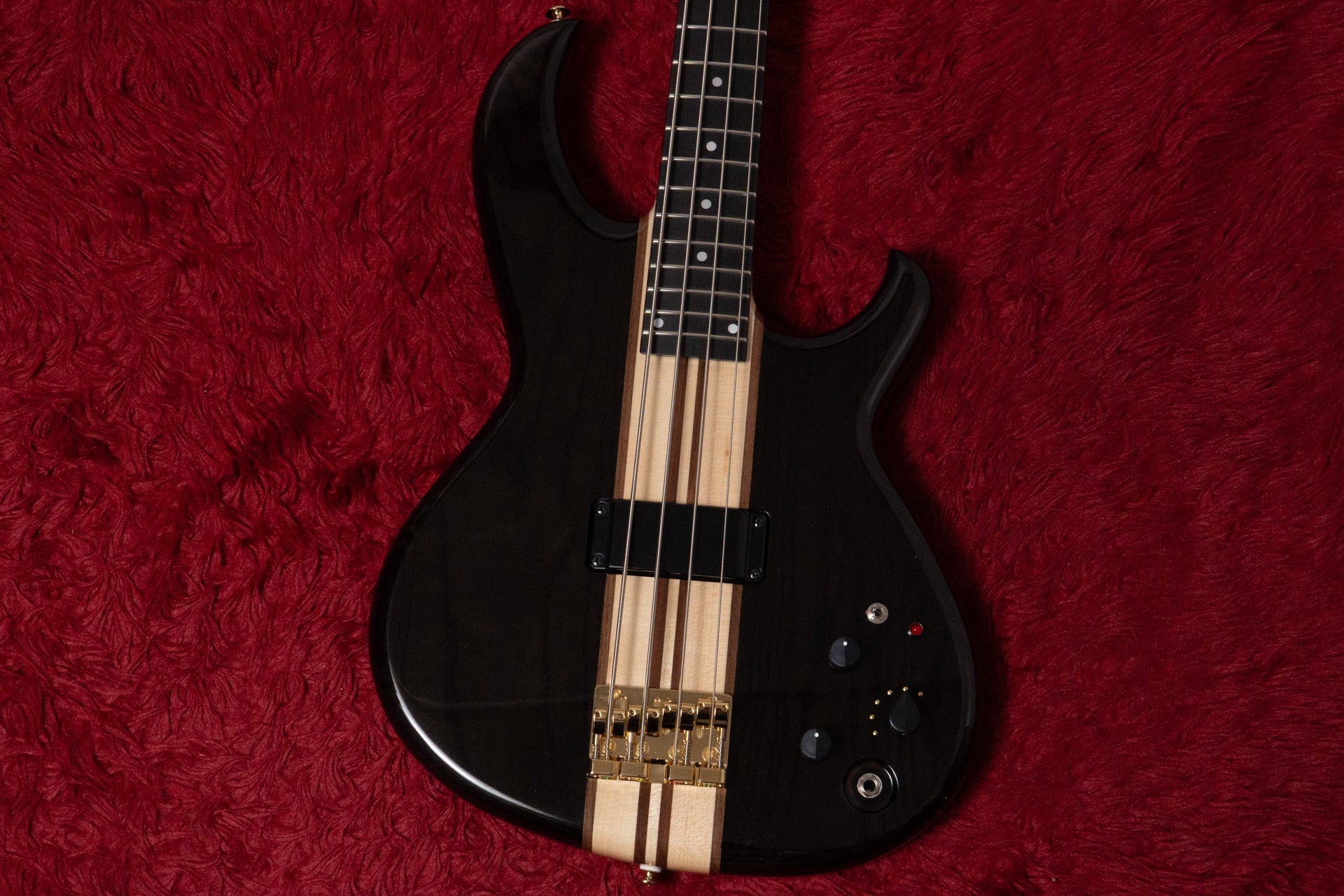 The guitar features neck-through construction and a 7-piece laminated maple and walnut neck.