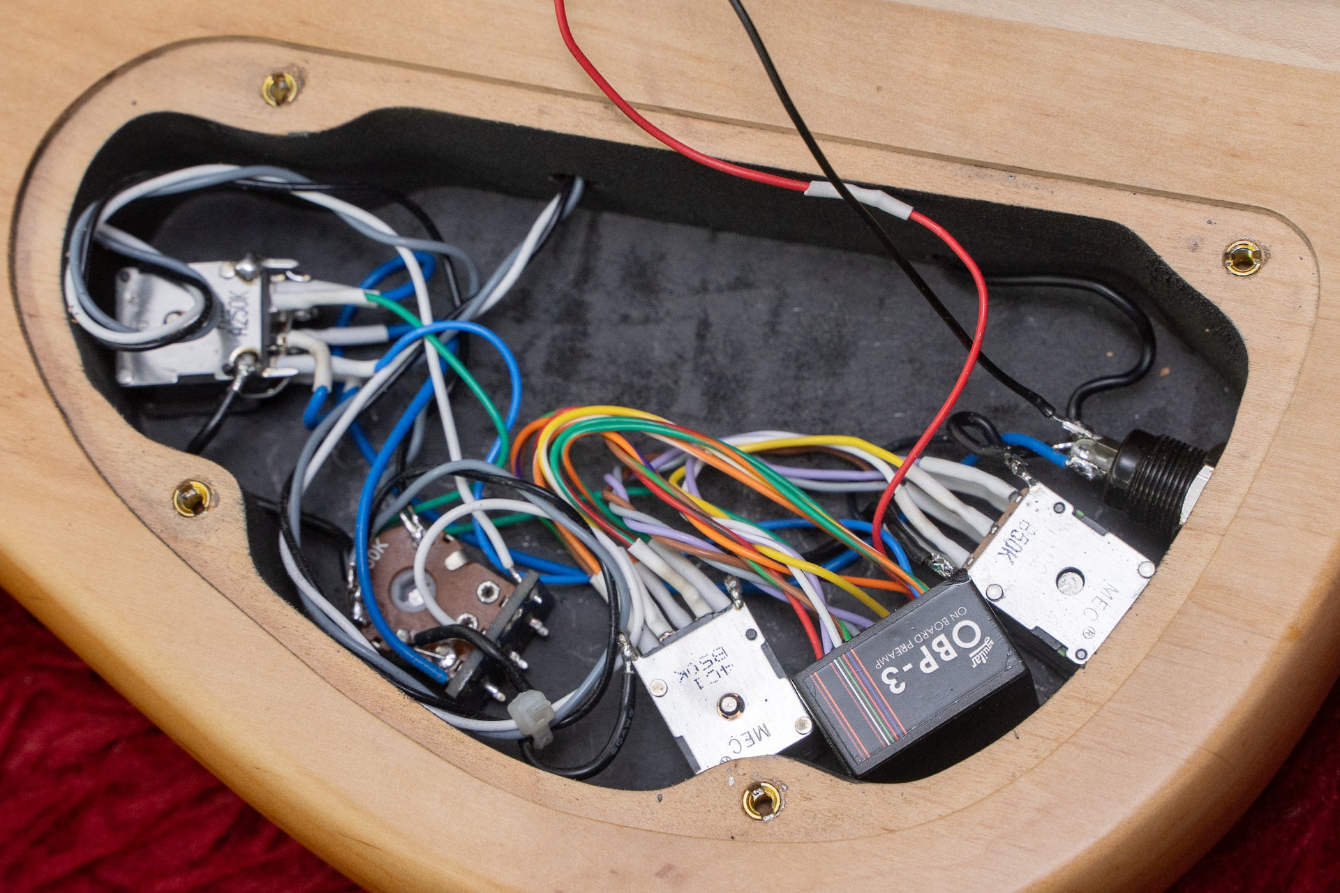 The pickup is an Aguilar dual coil type, and the preamp is the same Aguilar OBP-3.