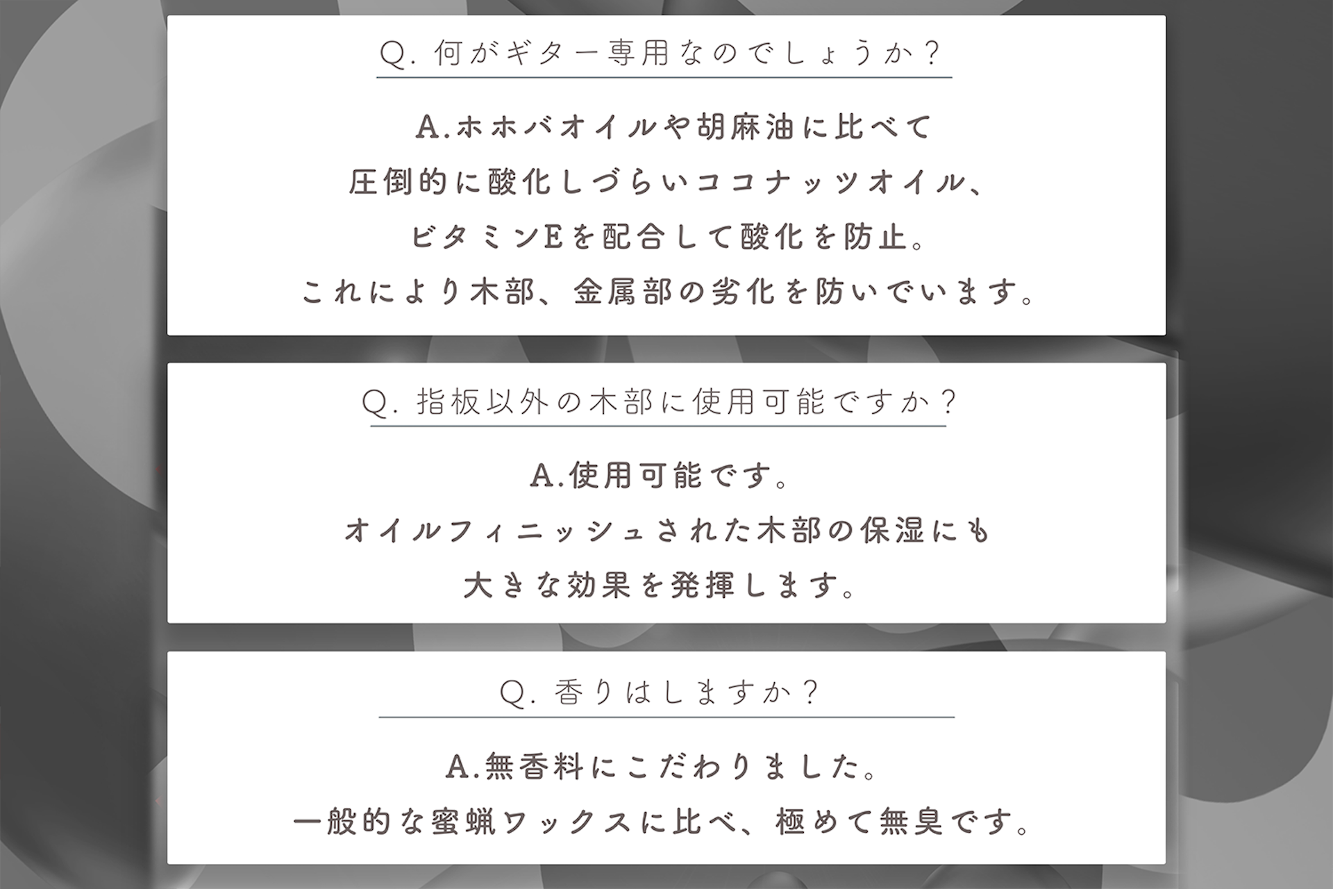 We have thoroughly researched existing beeswax waxes and aimed to create a product that provides the highest level of care just for guitars.