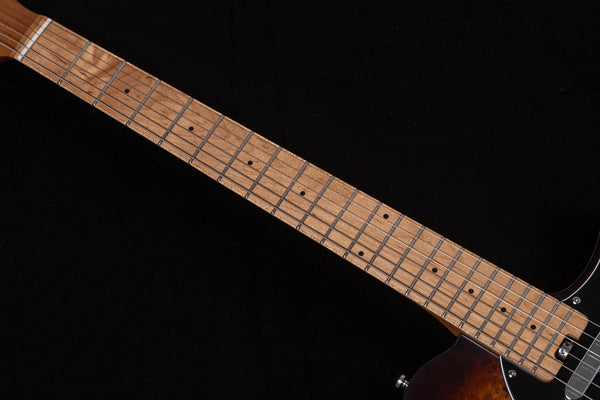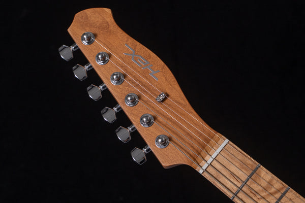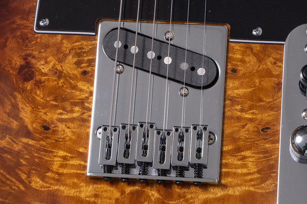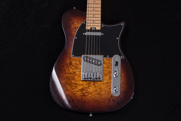 It incorporates many specifications typically found in high-end guitars, such as woods like Roasted Maple and Burl Maple, and compound radius fingerboards.
