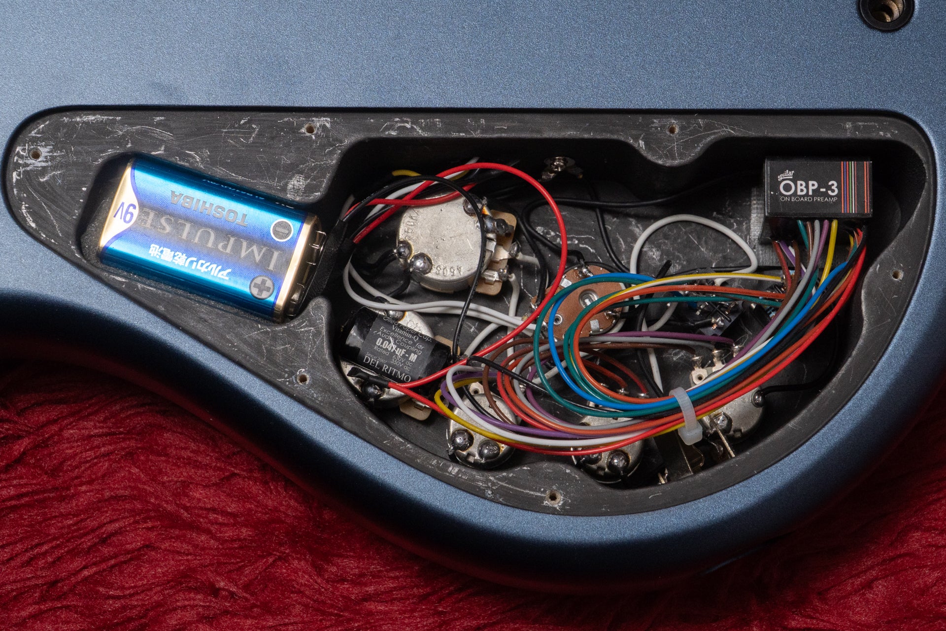 The pickups are Aguilar AG4J-HOT, and the preamp is also Aguilar OBP-3.