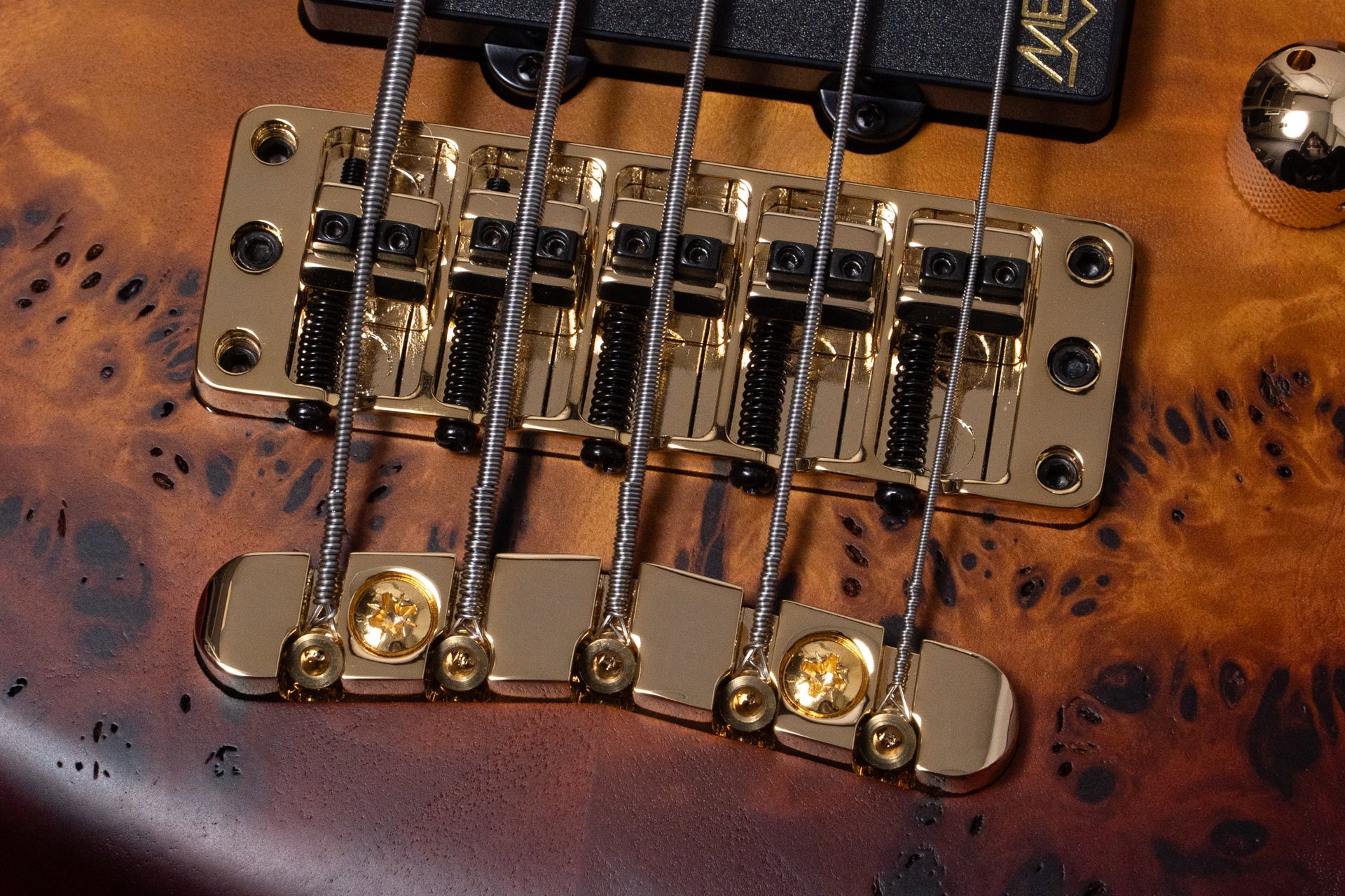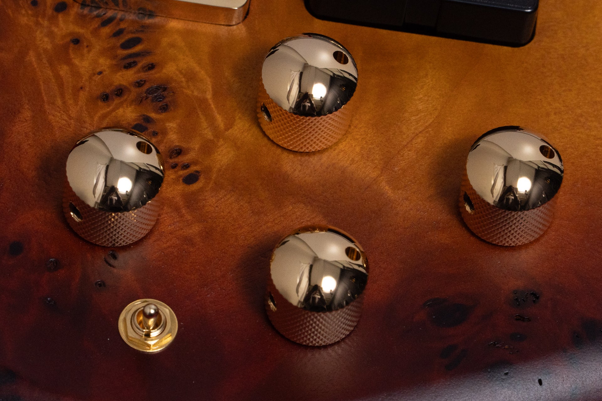 The hardware is gold, right down to the frets, and combined with the Poplar Burl top, it gives it a very luxurious look.