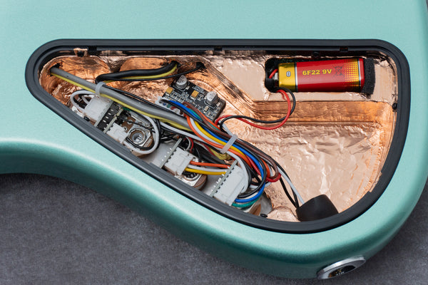 Looking inside the cavity, you'll see copper foil tape applied for shielding. Excellent.