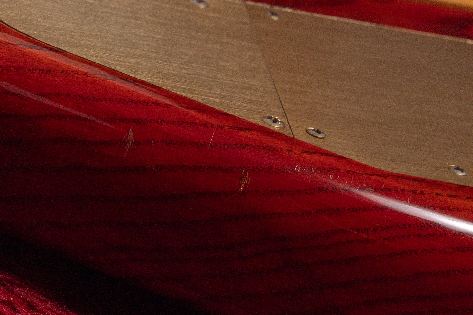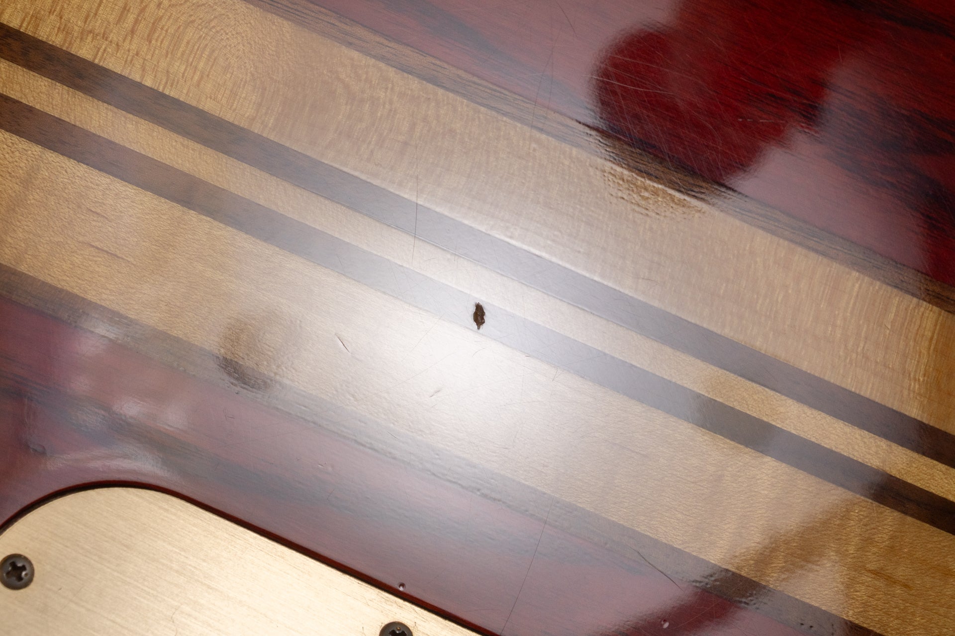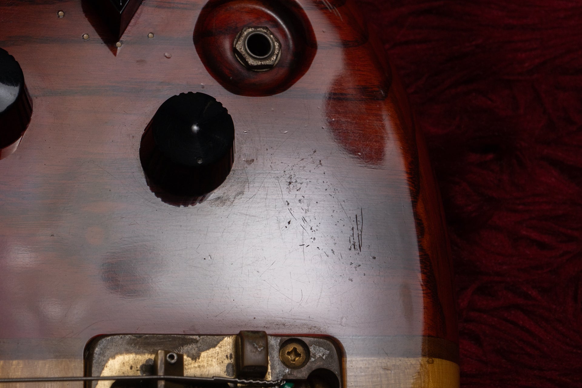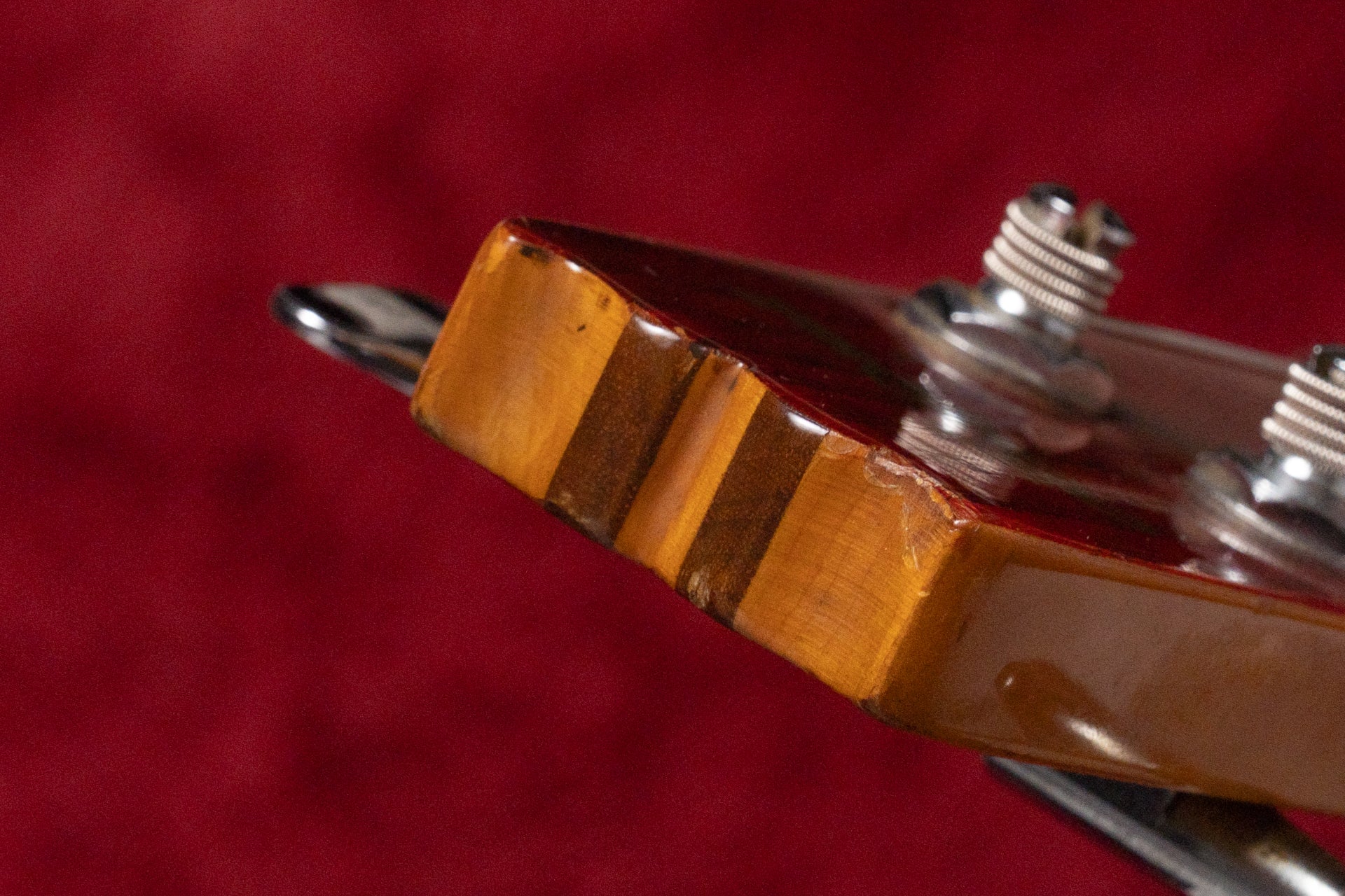 The body and finish show signs of use, with occasional dents, scratches, and peeling paint. A crack approximately 50.0mm long can be seen near the border between the back of the neck and the back of the headstock. It does not reach the wood, and does not affect playability. There is also some tarnish on the metal parts.
