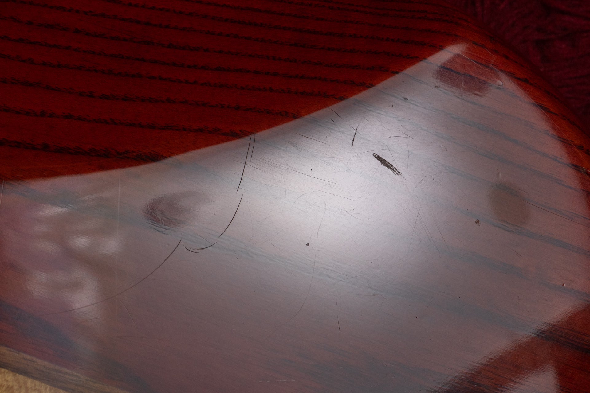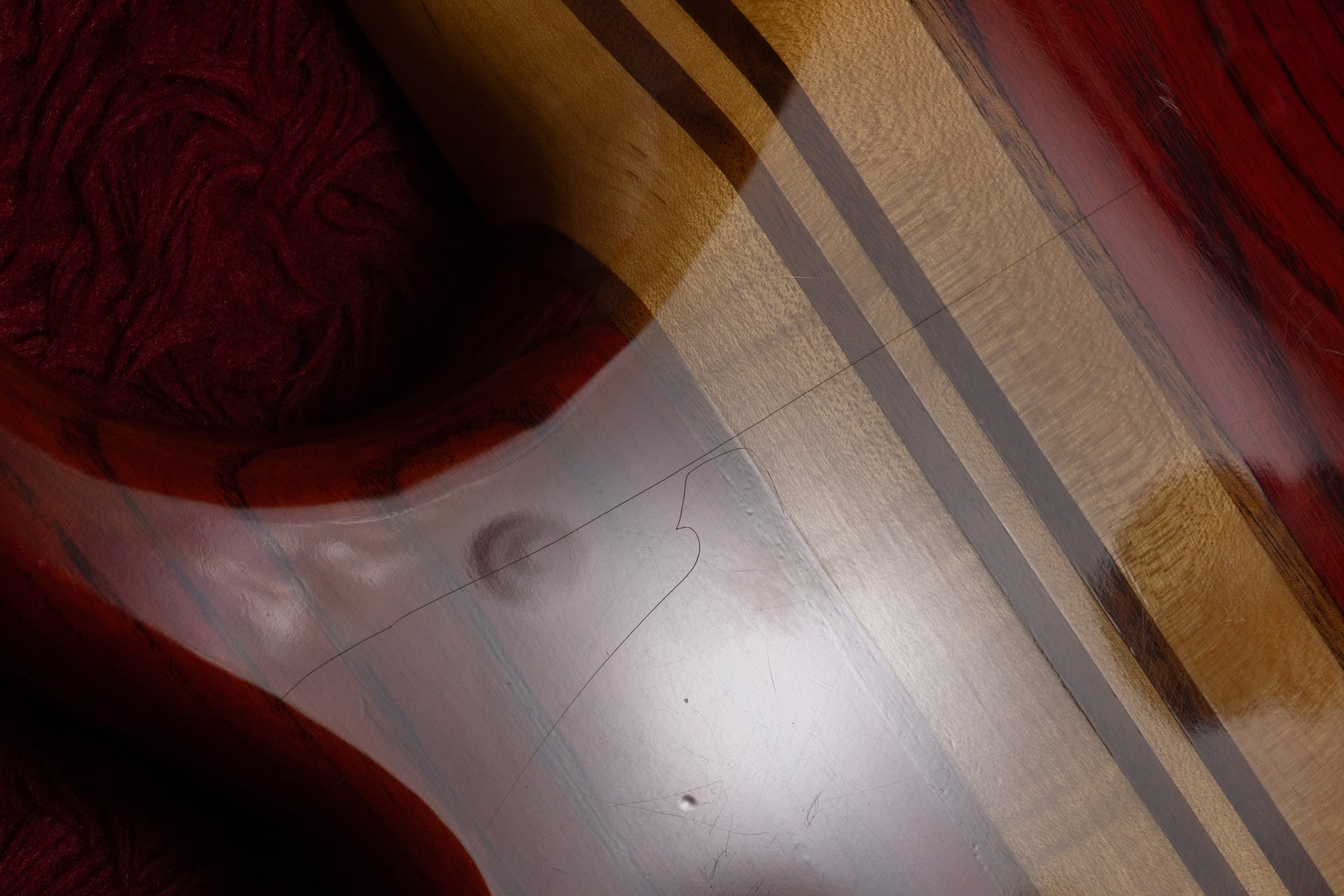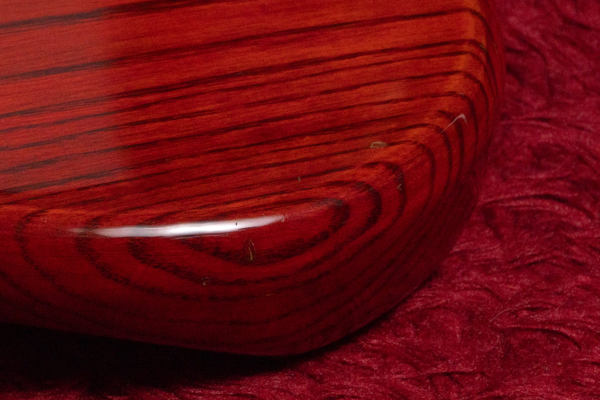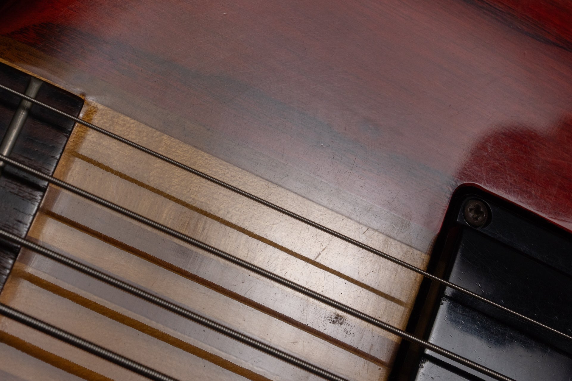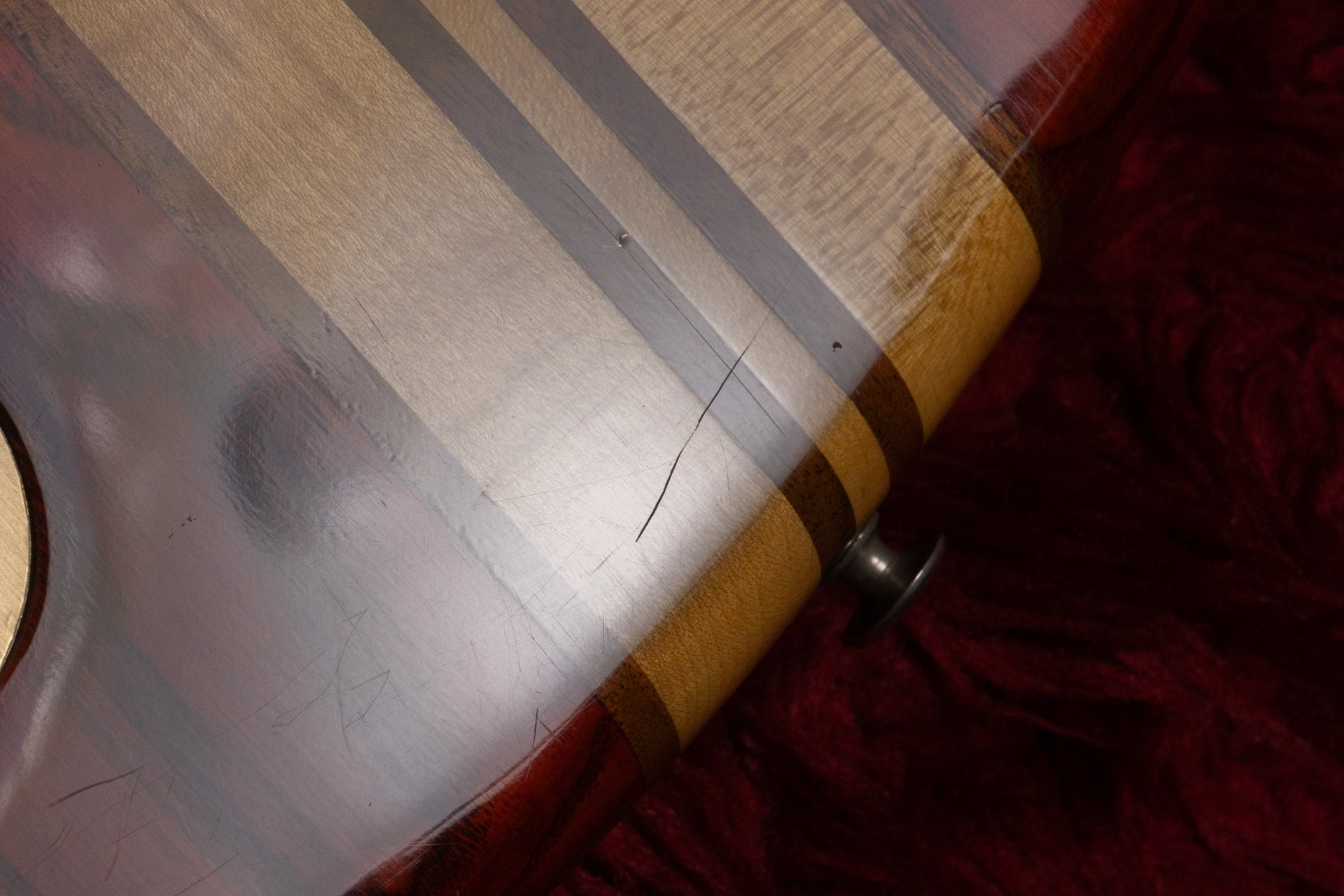 The body and finish show signs of use, with occasional dents, scratches, and peeling paint. A crack approximately 50.0mm long can be seen near the border between the back of the neck and the back of the headstock. It does not reach the wood, and does not affect playability. There is also some tarnish on the metal parts.