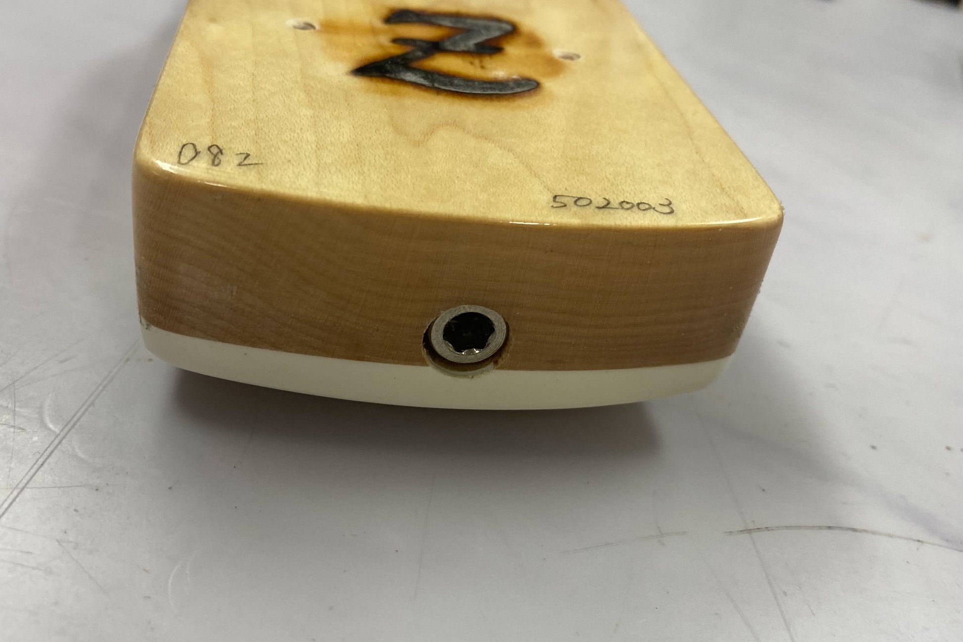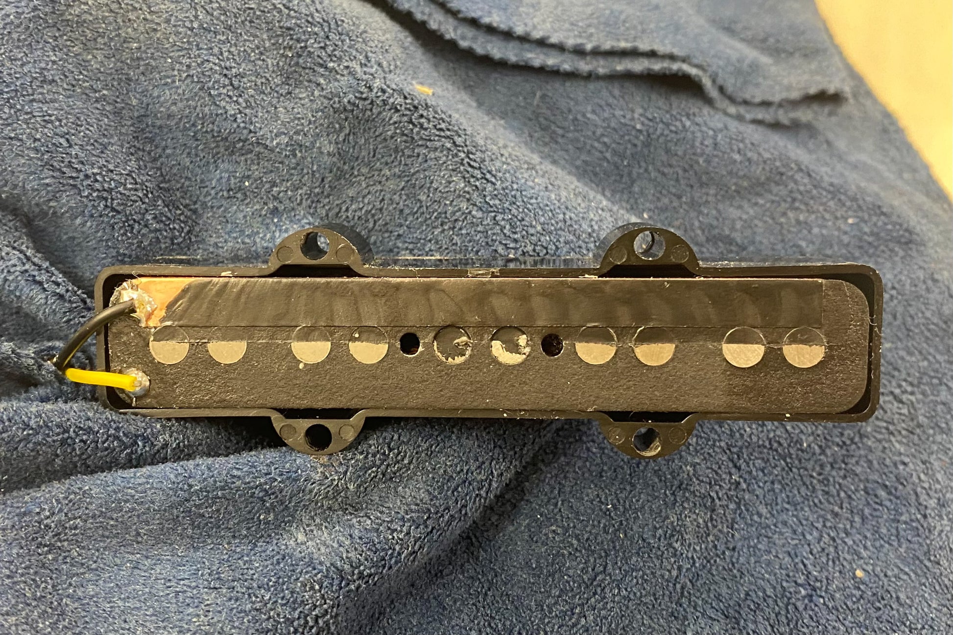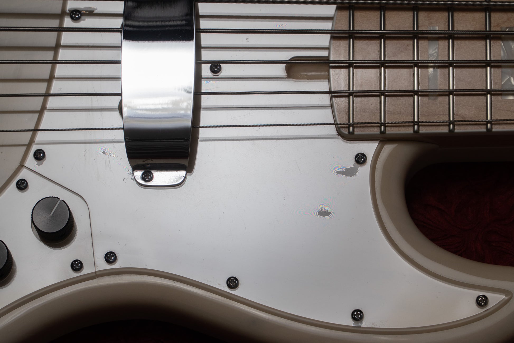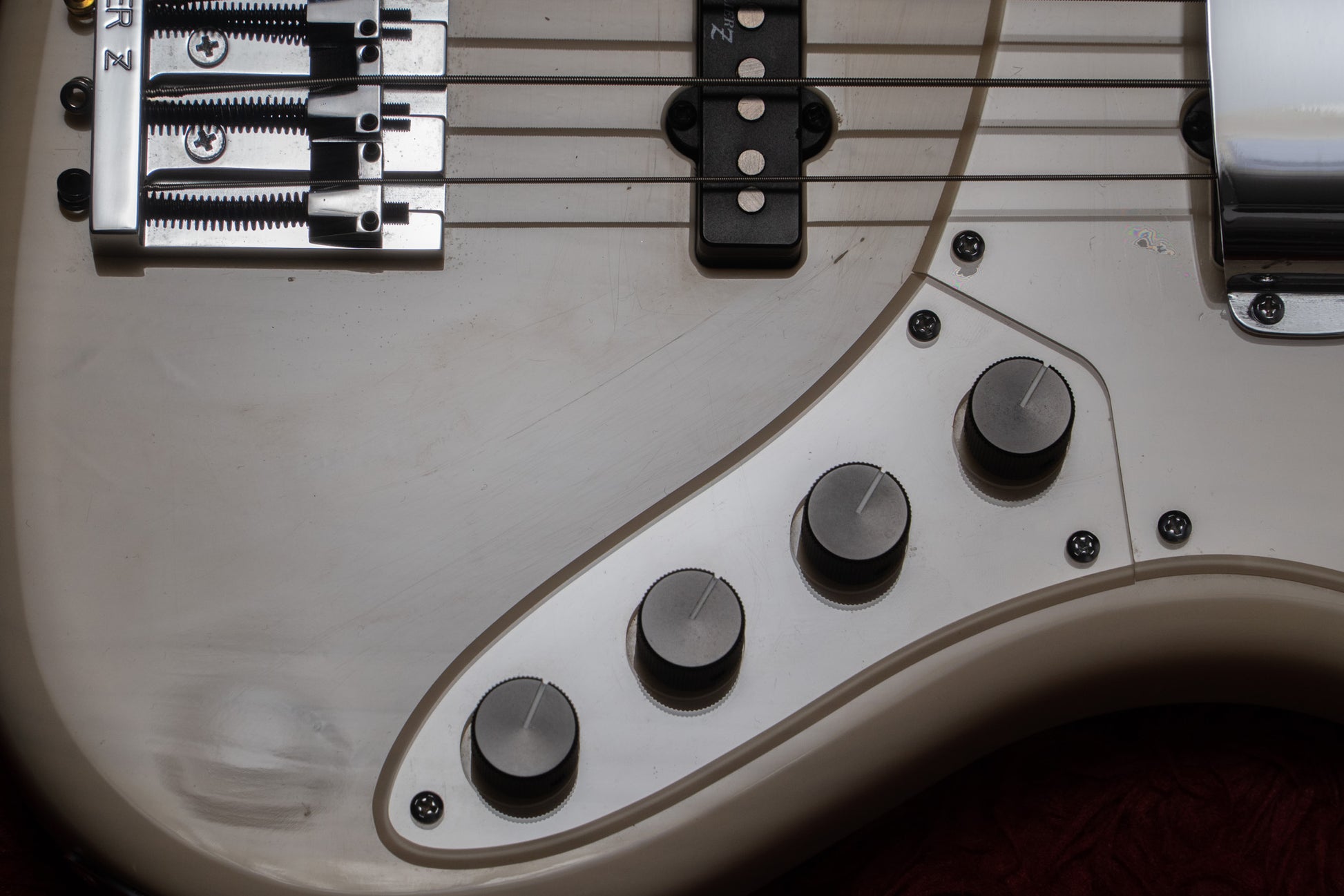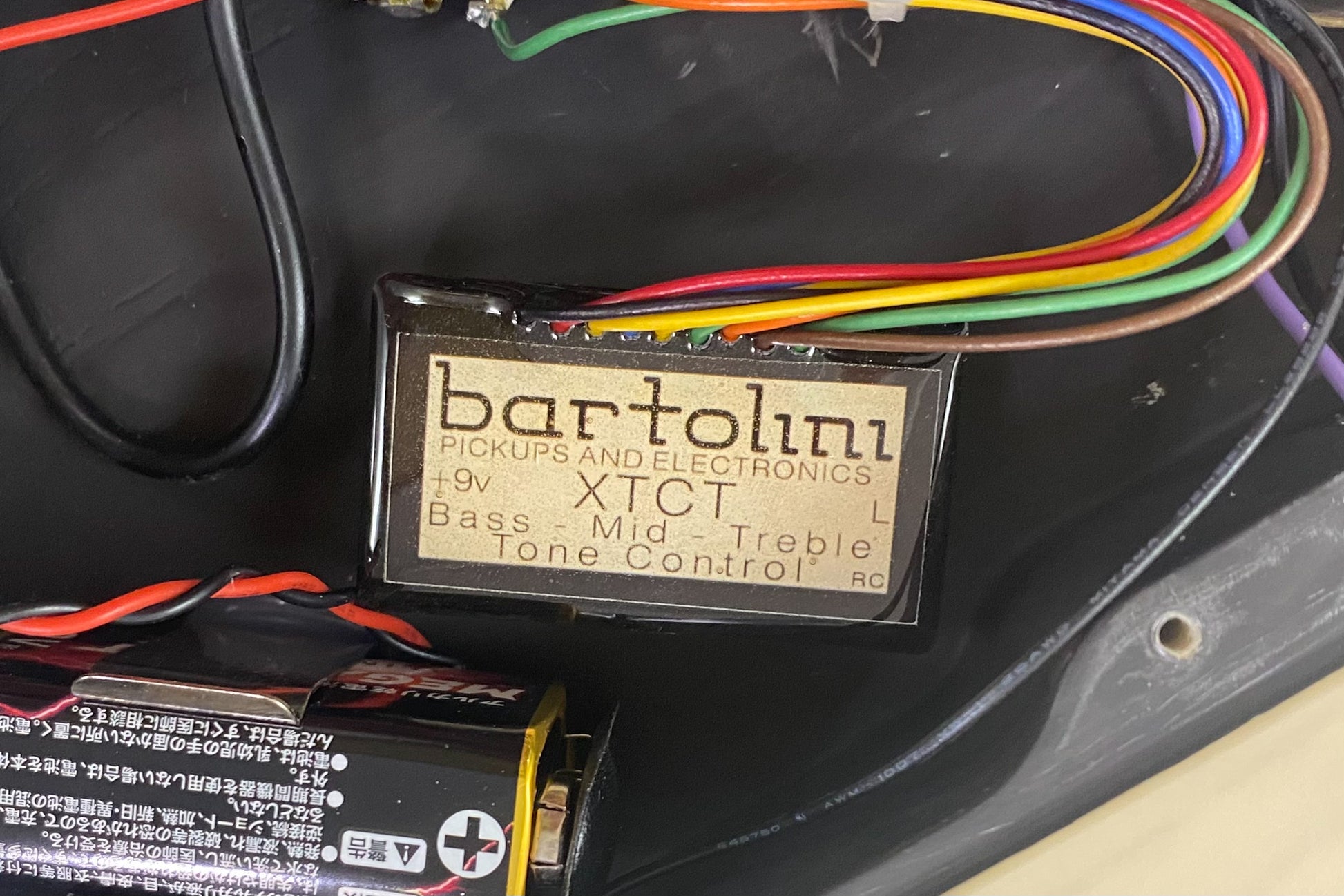 Controls: Neck pickup volume, bridge pickup volume, treble, bass, middle (in cavity)