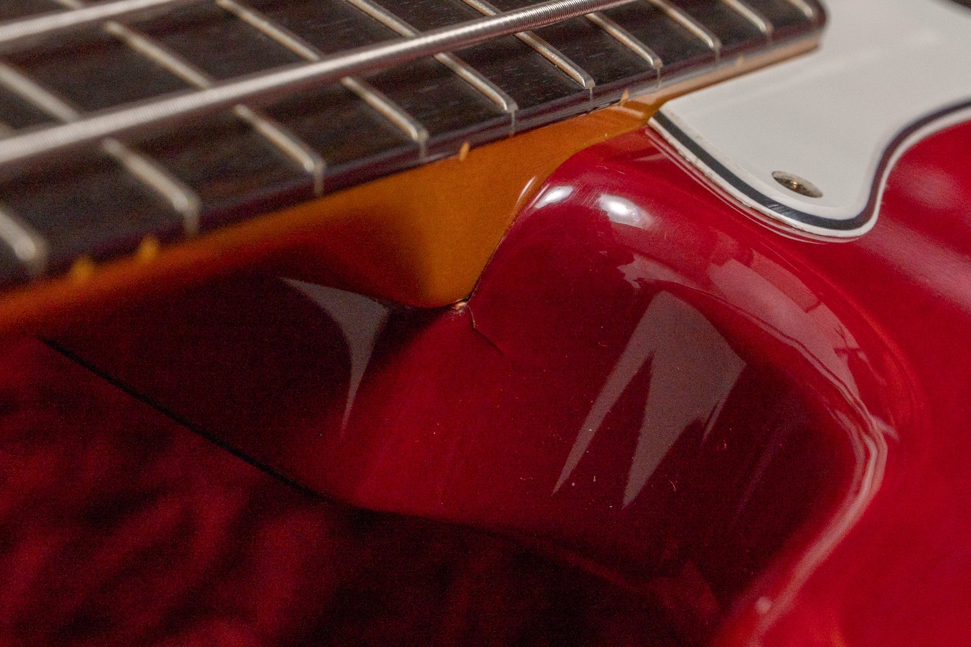 The neck has been adjusted with a shim due to the bridge structure which prevents the string height from being lowered, and it can be played without issue at a setting of 2.5-3.0mm at the 12th fret.