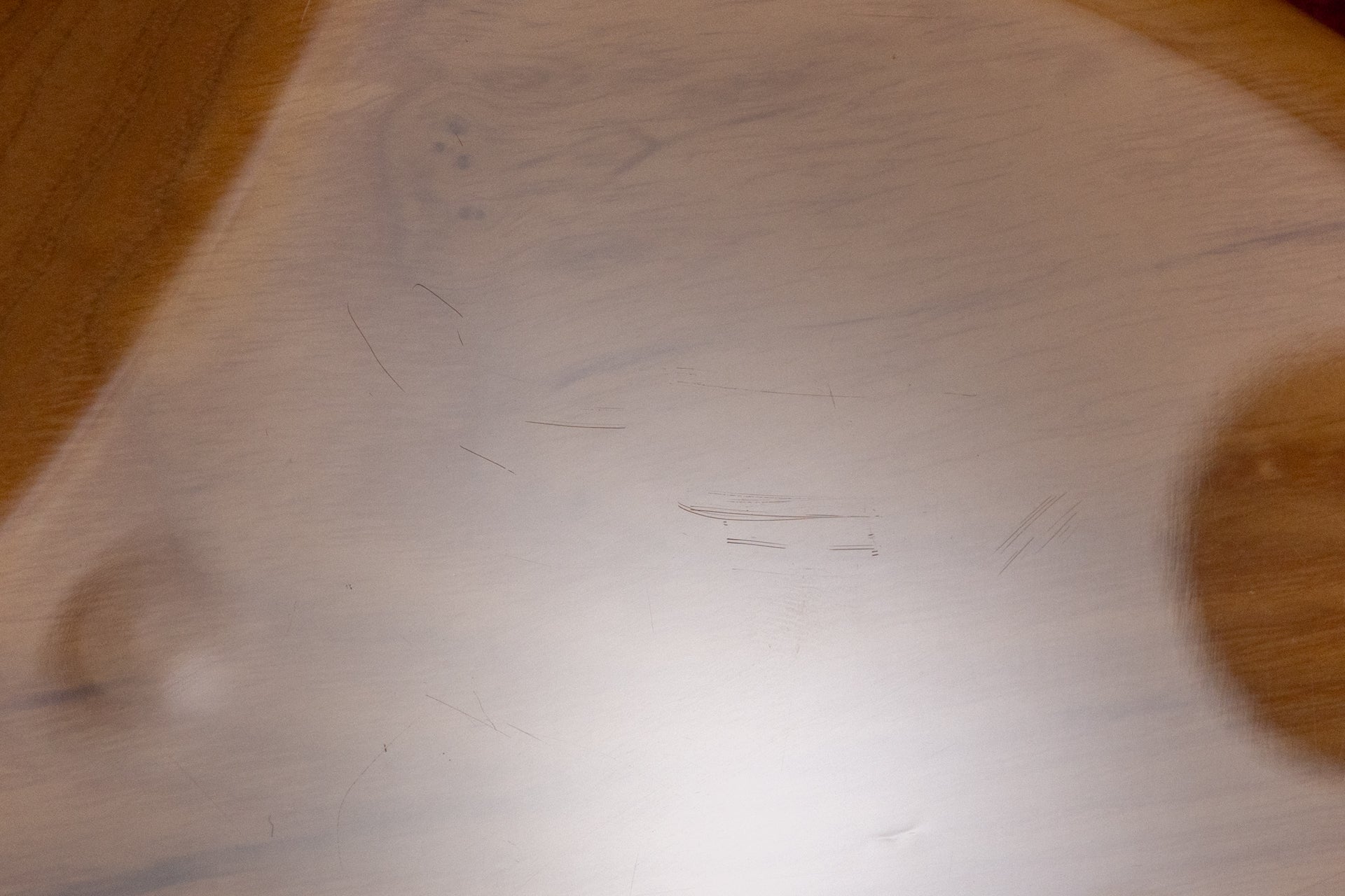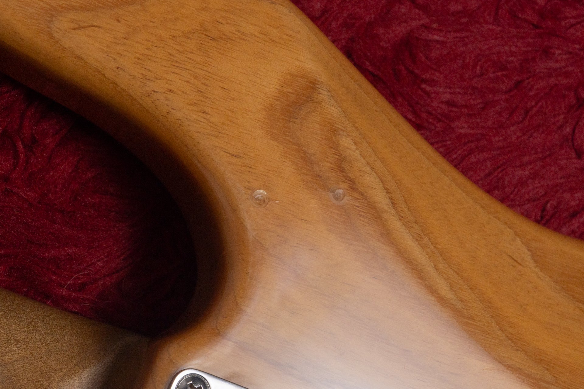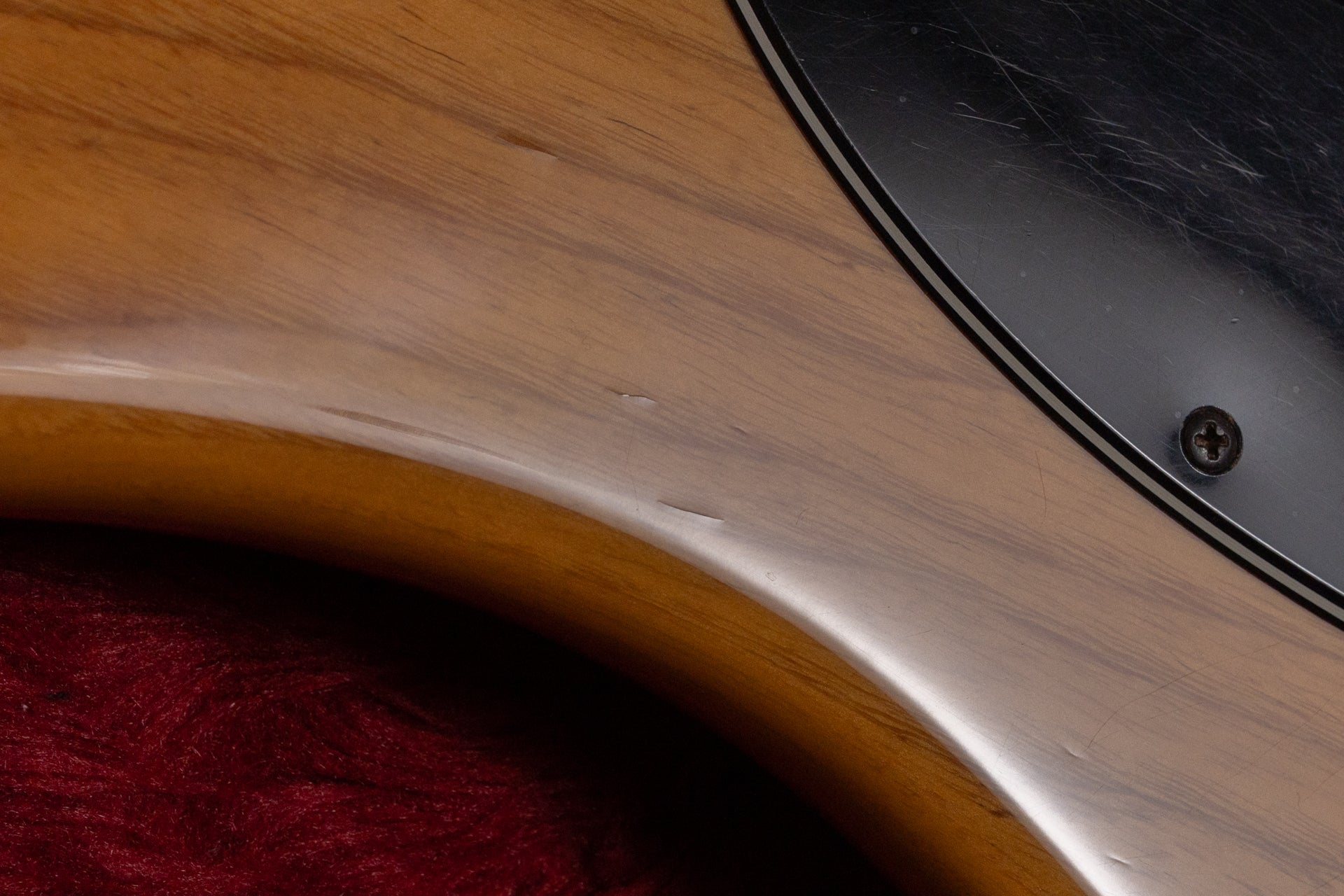 The body and finish show occasional dents and scratches. There is a noticeable dent measuring approximately 10.0mm on the side of the headstock. There is a paint crack on the body near the joint, but it does not penetrate the wood.