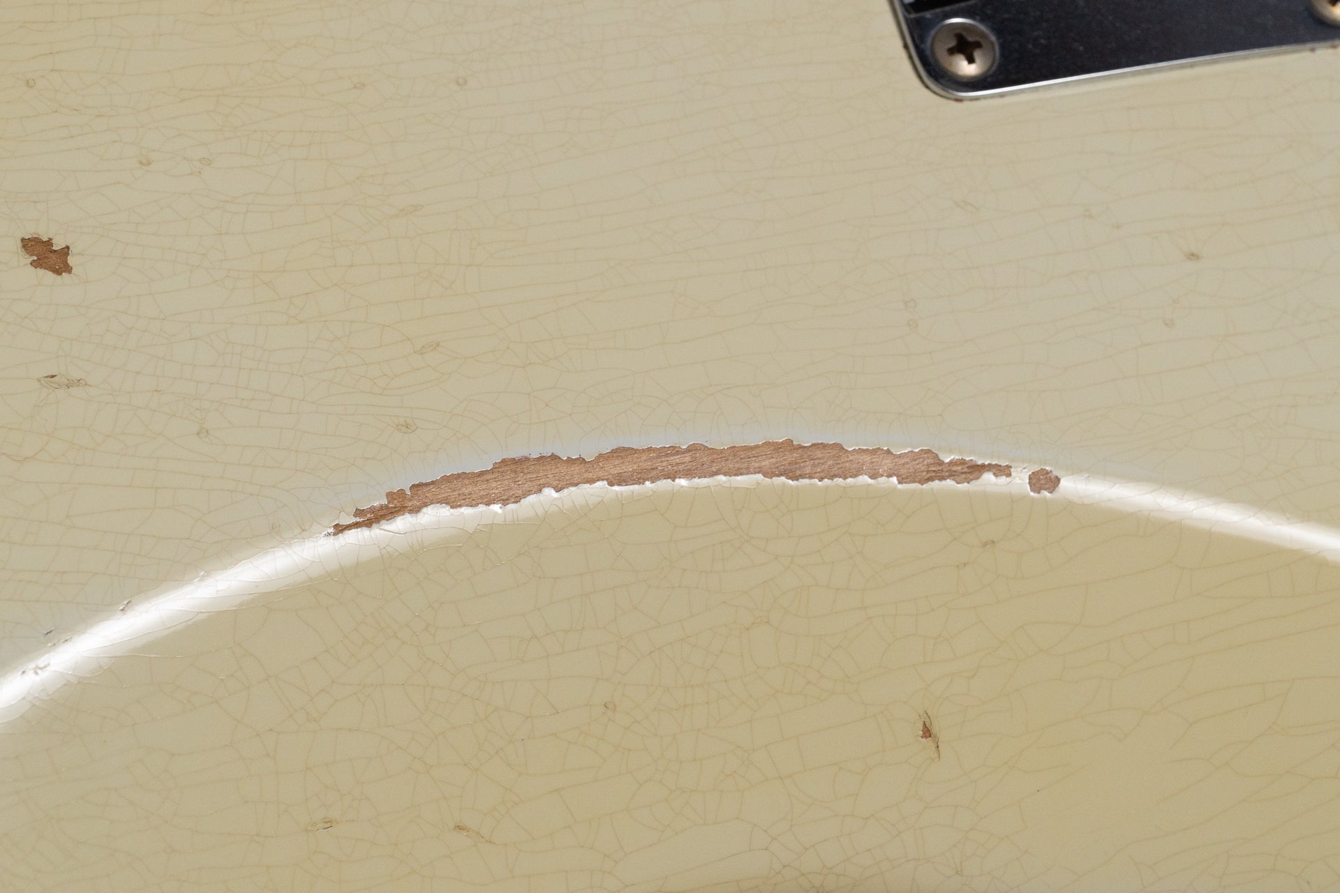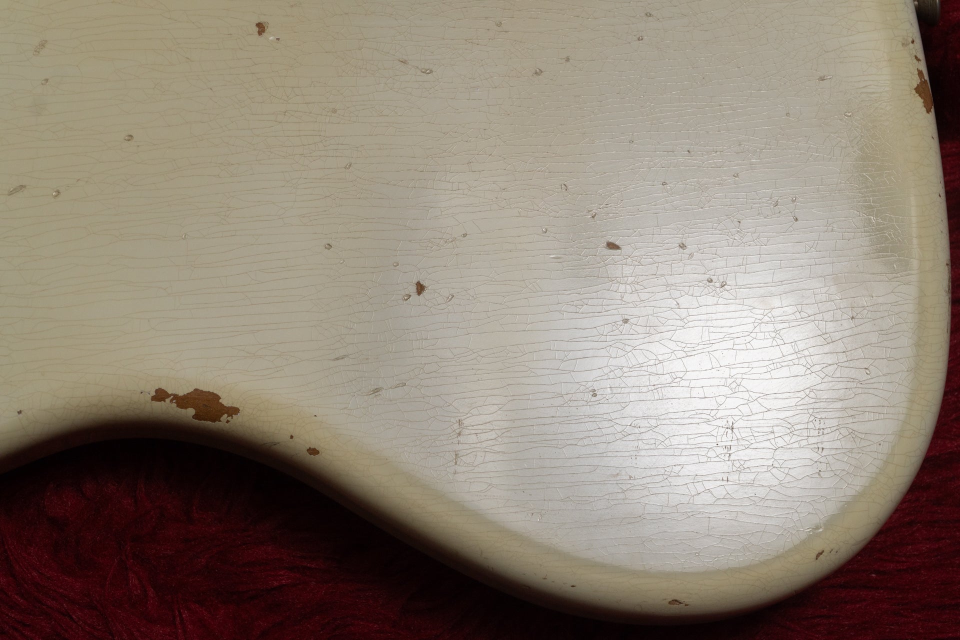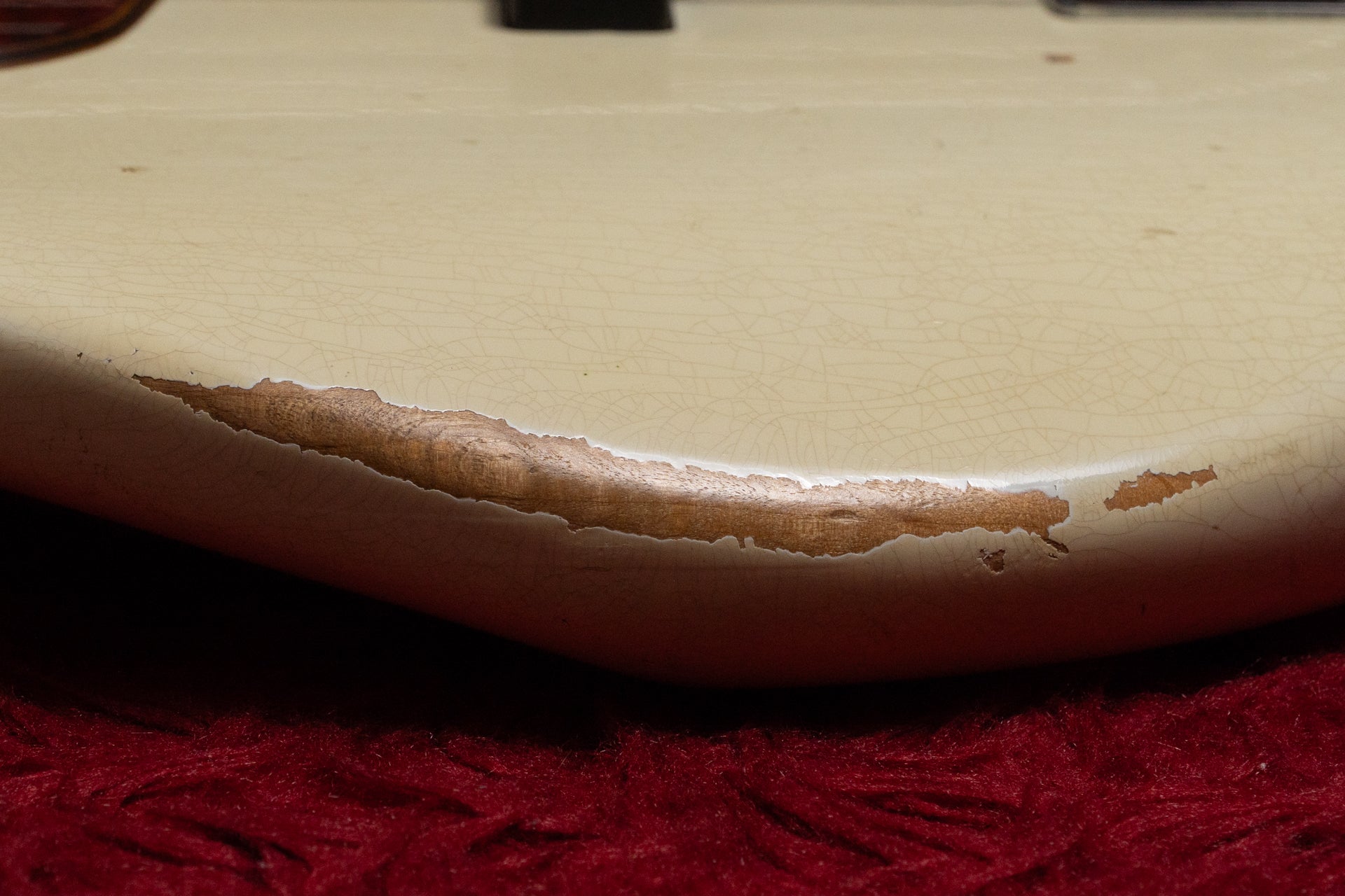 The body and paintwork show paint chipping, dents, and scratches, but it's impossible to determine if these are later-acquired due to the relic finish. There are screw holes that appear to be for the finger rest, pickup fence, and bridge cover.