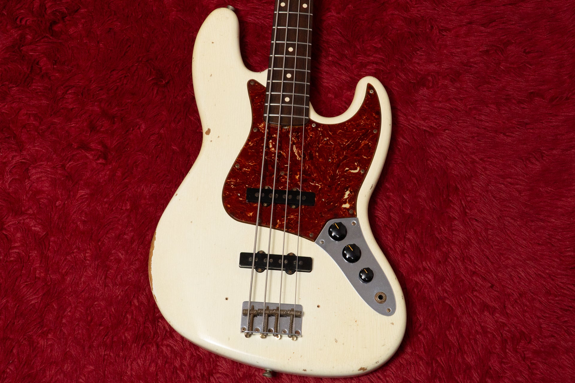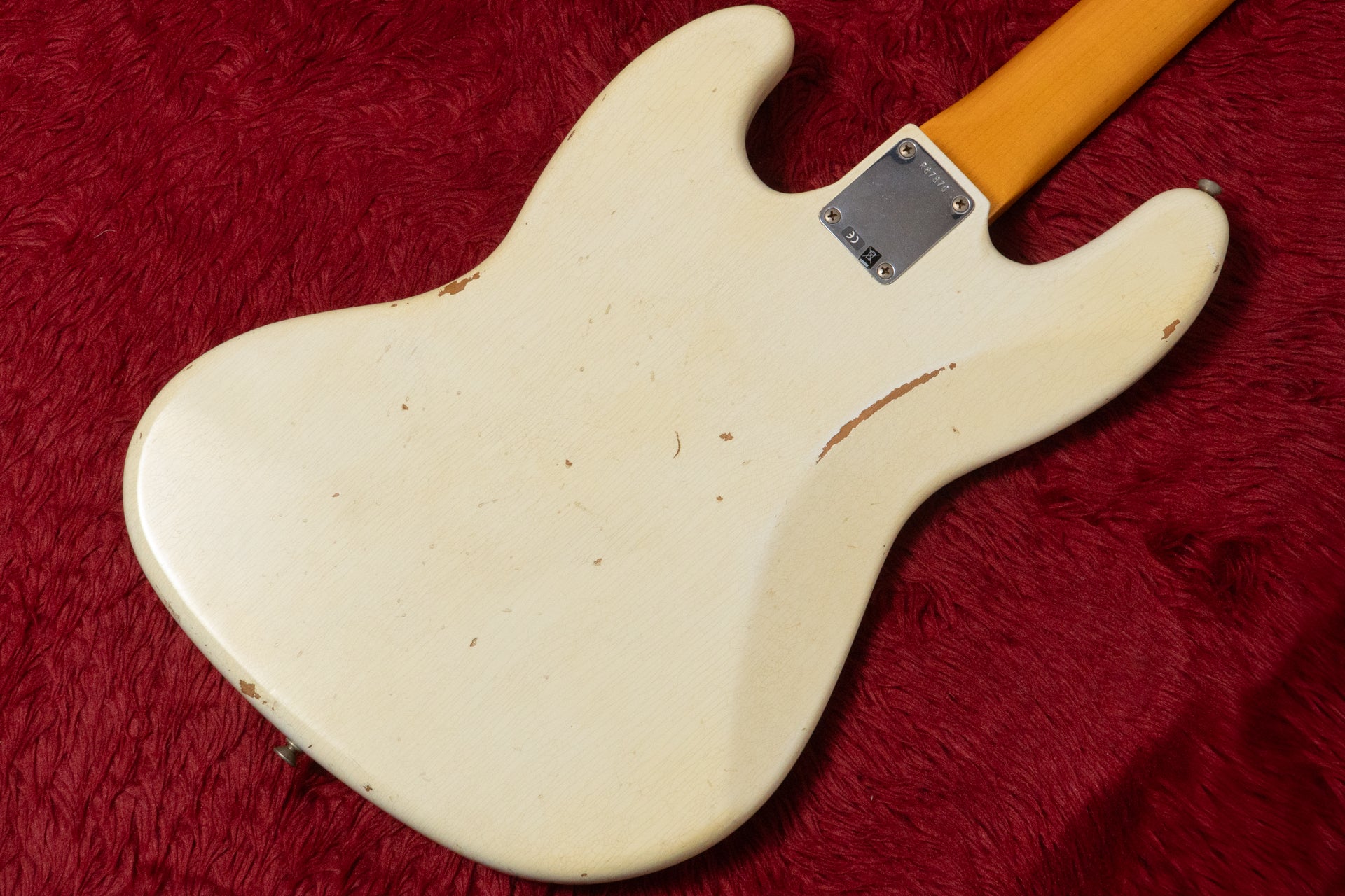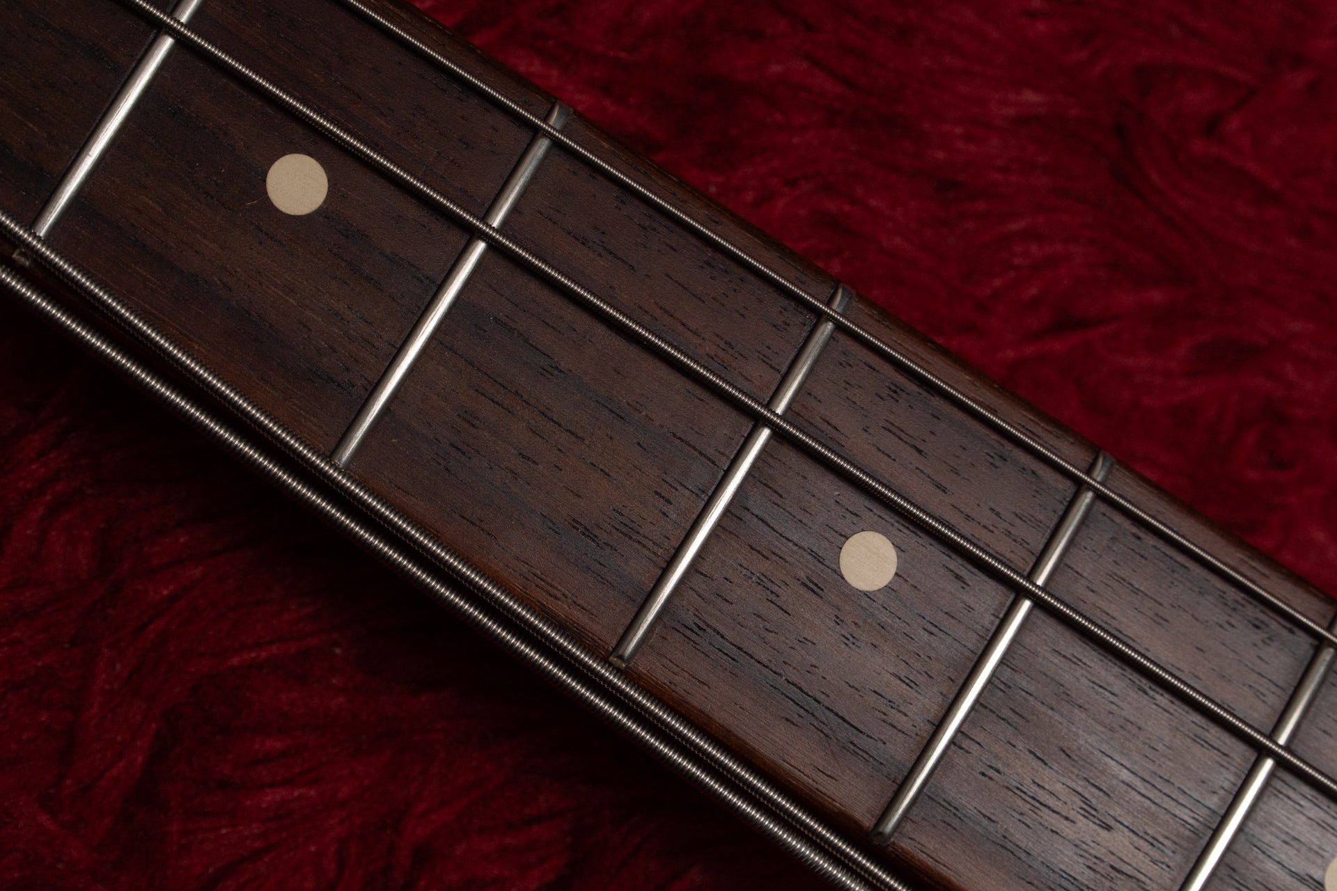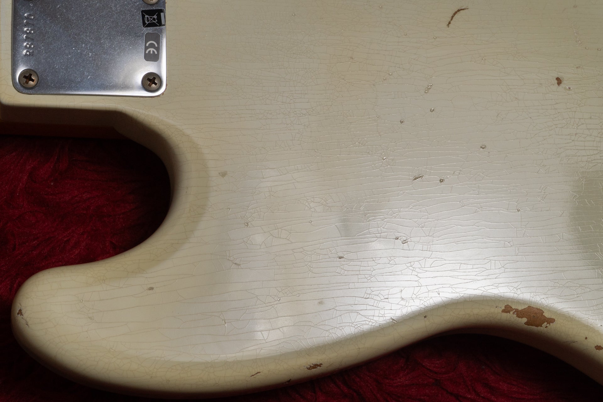 The body and paintwork show paint chipping, dents, and scratches, but it's impossible to determine if these are later-acquired due to the relic finish. There are screw holes that appear to be for the finger rest, pickup fence, and bridge cover.