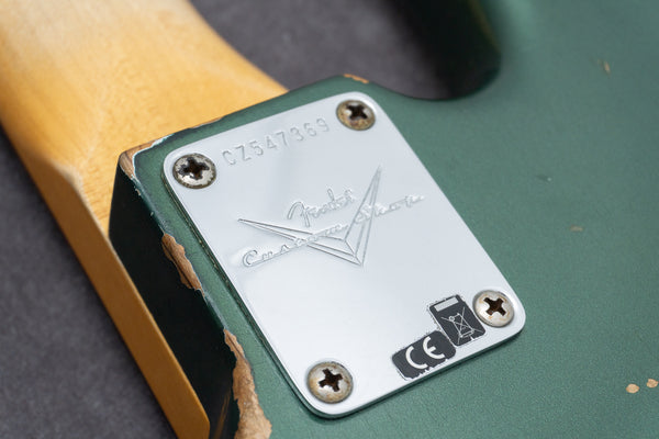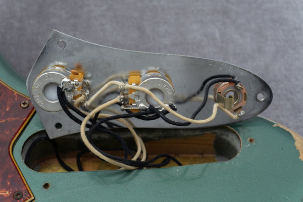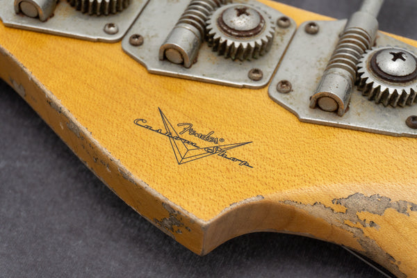 The body and finish show scratches and dents. Due to the relic finish, it is impossible to determine if these are post-production marks.