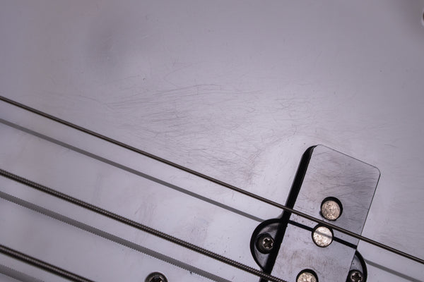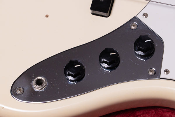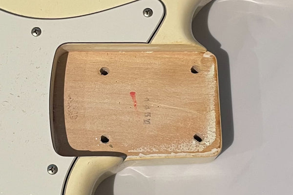 The body and finish have occasional dents and scratches. There is some sun fading due to age. There are screw holes that appear to be from where a bridge cover was installed. One of the neck pickup screws is slightly bent.
