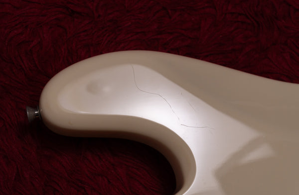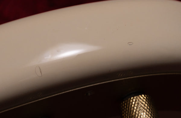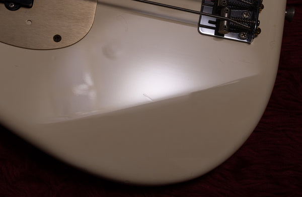 The pickguard has been replaced with an anodized one. The finger rest position has also been changed accordingly. The tone pot has been replaced.