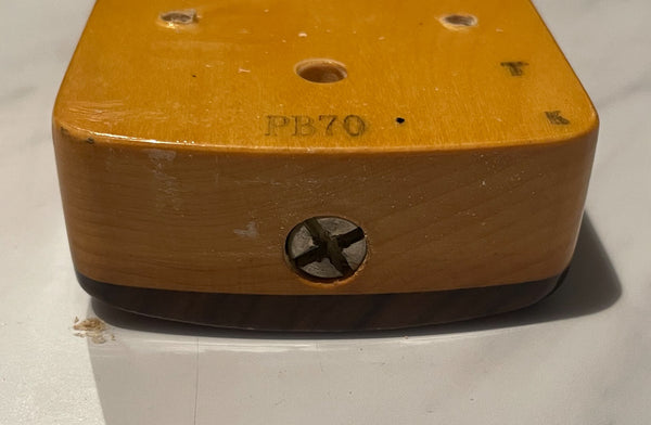 The body and finish show minor dents and scratches. There are screw holes from the 1970s finger rest under the pickguard. There is also some tarnish on the metal parts.
