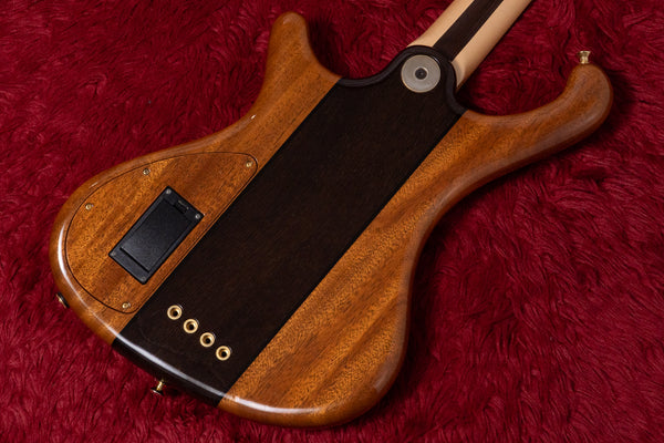 The neck is a 3-ply laminate of maple and wenge, and the fingerboard is Indian rosewood.