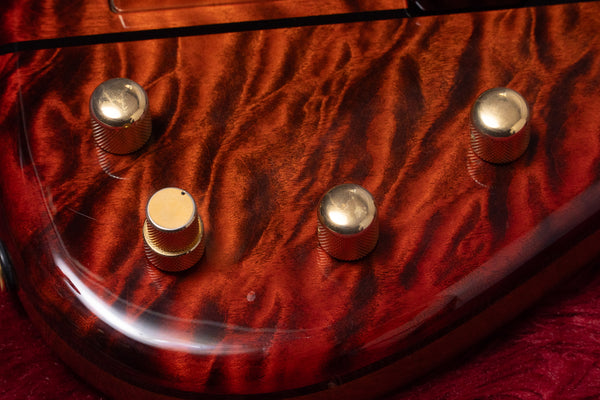 The body top is a figured maple and wenge laminate.