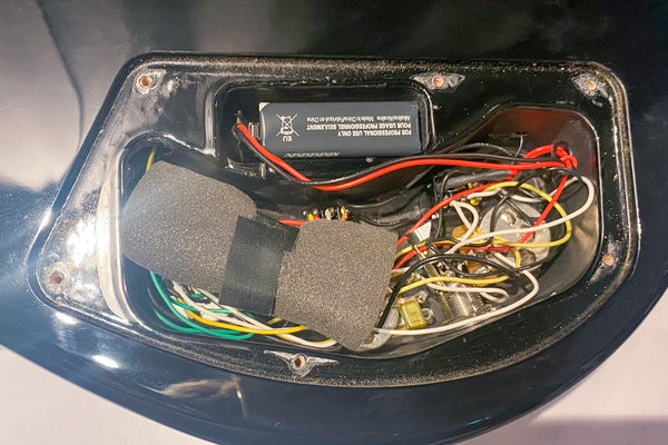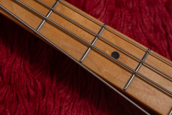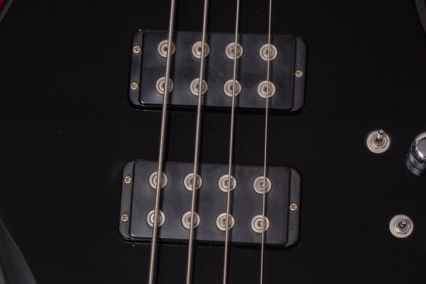 Controls: Master volume, treble, bass, pickup select switch, pickup wiring switch (series/tap/parallel), preamp switch (treble booster/active/passive)