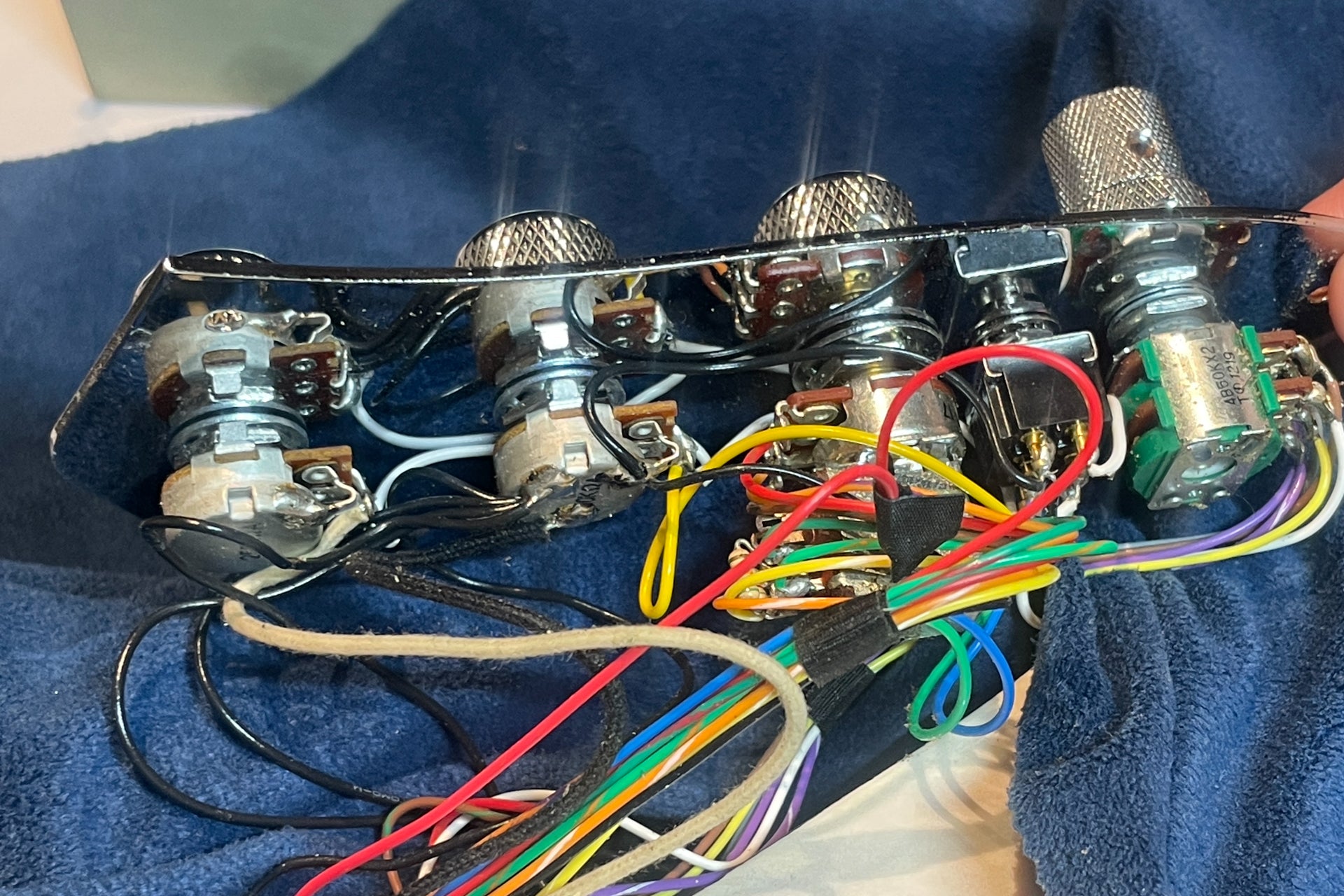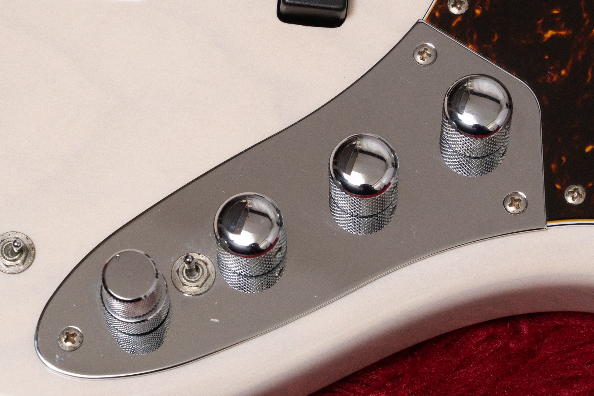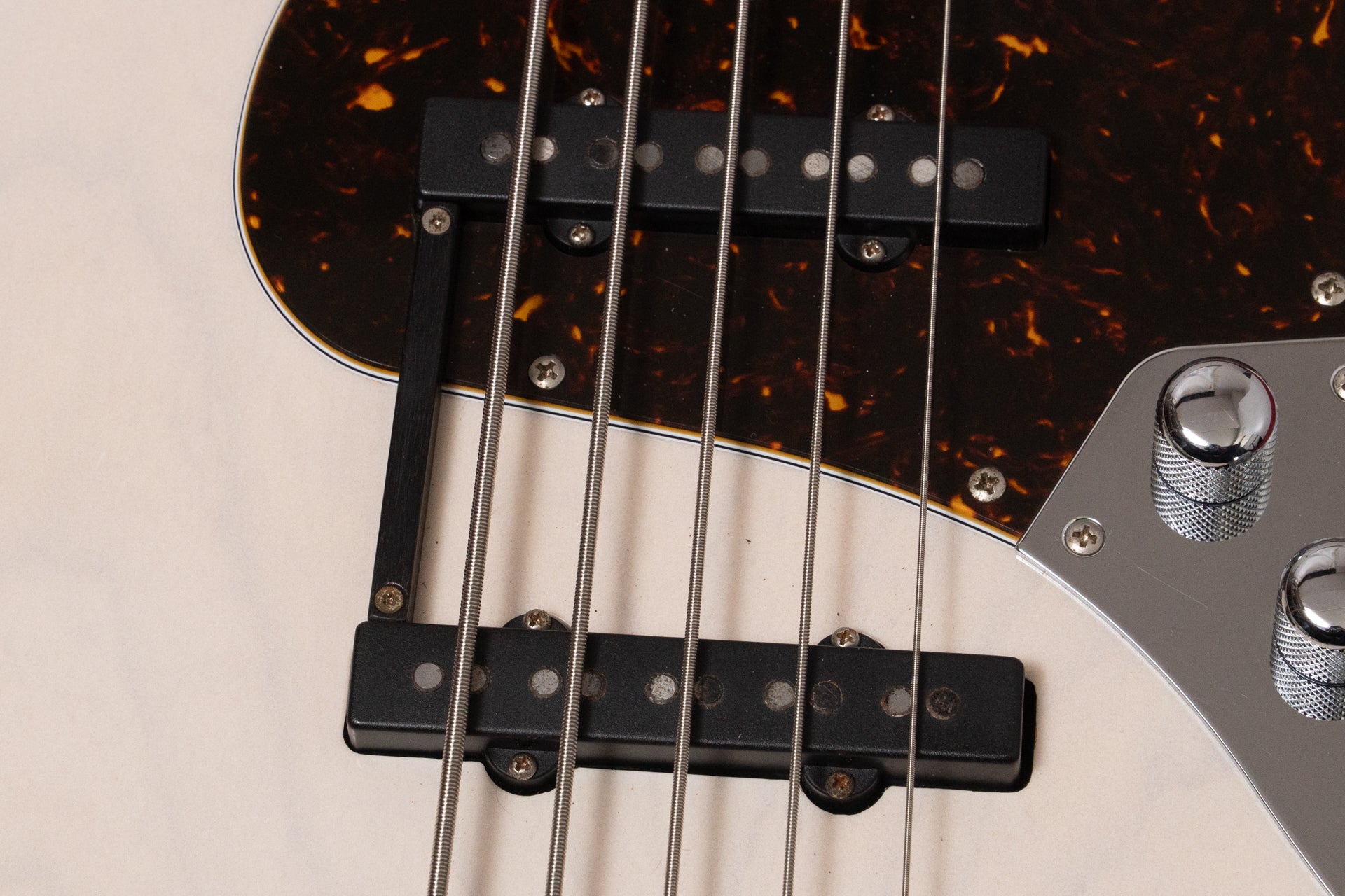 Controls: Neck pickup volume, bridge pickup volume, middle pickup (push/pull frequency selector - 400Hz/800Hz), treble/bass, active/passive switch, series/parallel switch