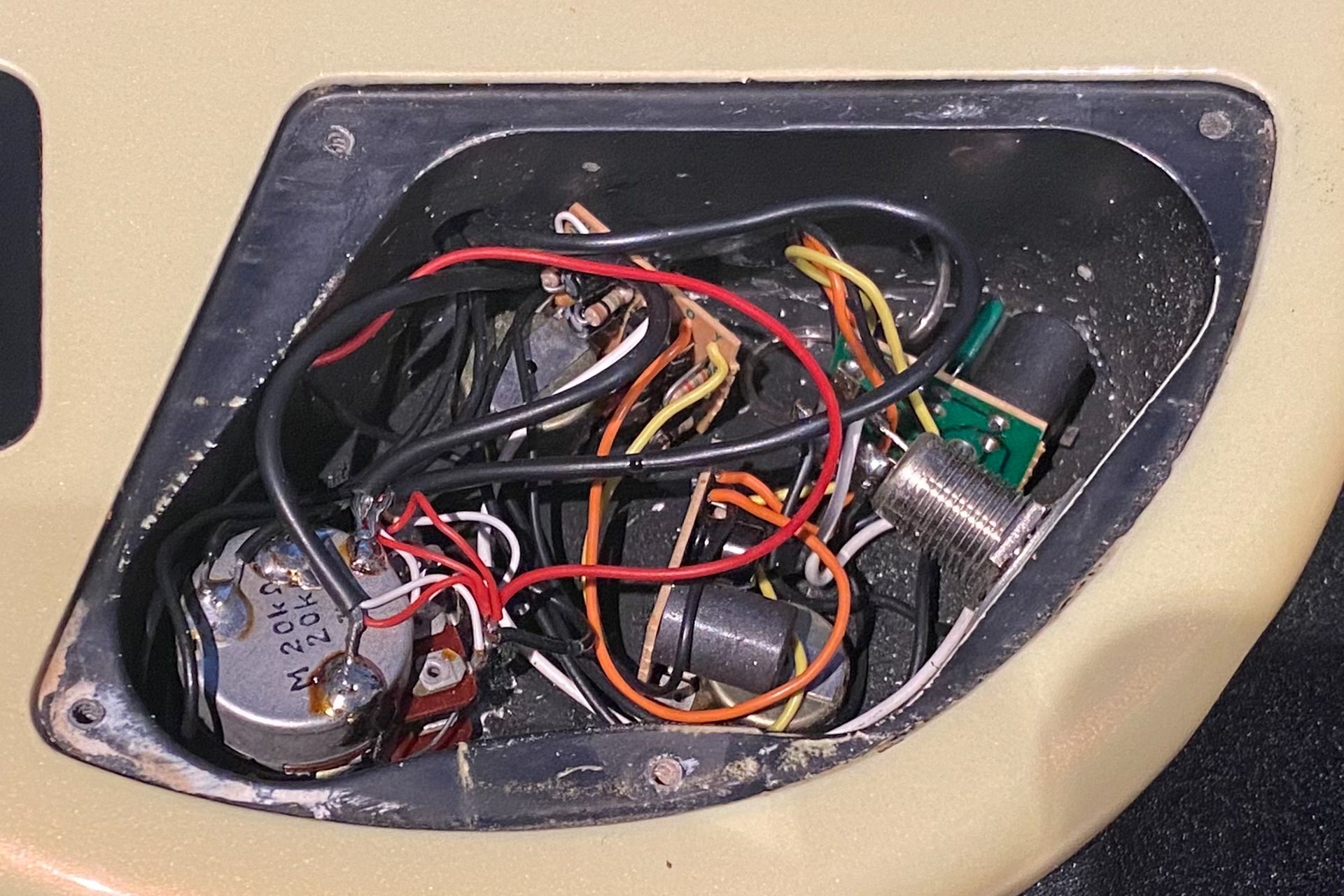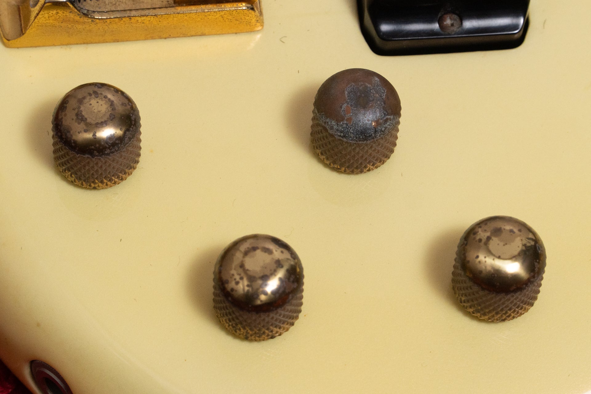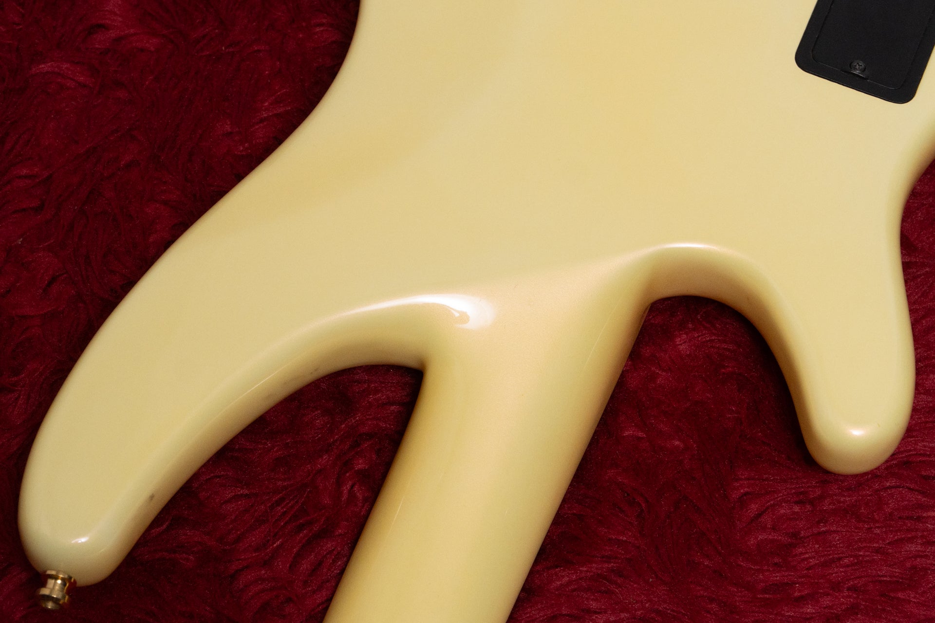 The body and finish have occasional dents and scratches. Approximately 10.0mm of paint peeling can be seen on the side of the body. The headstock has discoloration and paint peeling. Some metal parts are also dull.