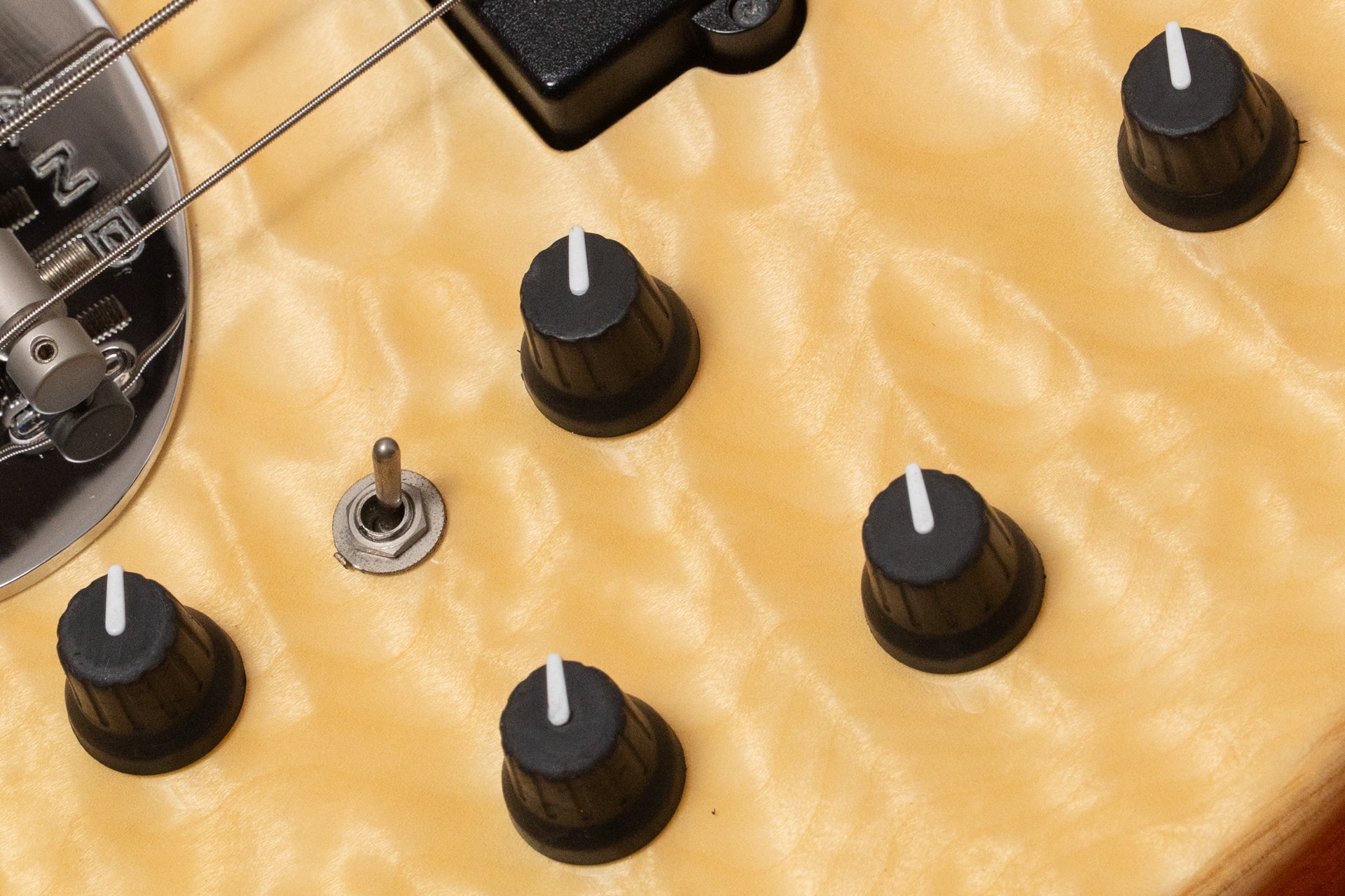 Controls: Master Volume (Push/Pull - Active/Passive), Balancer, Pickup Wiring Switch (Series, Tap, Parallel), Treble, Middle, Bass