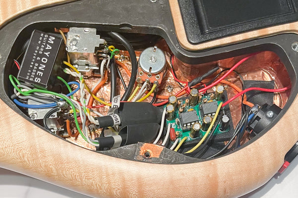 The magnetic pickups are Delano SBC 5 HE/S, the piezo pickups are RMC Piezo, and the preamp is the original Mayones M-PB1.