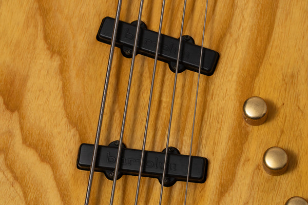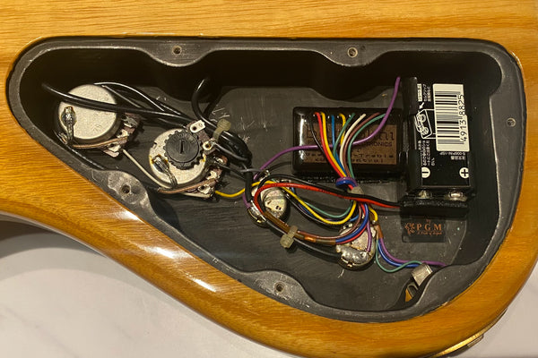 Controls: Neck PU volume, bridge PU volume, bass, treble, mid-cut (inside cavity)