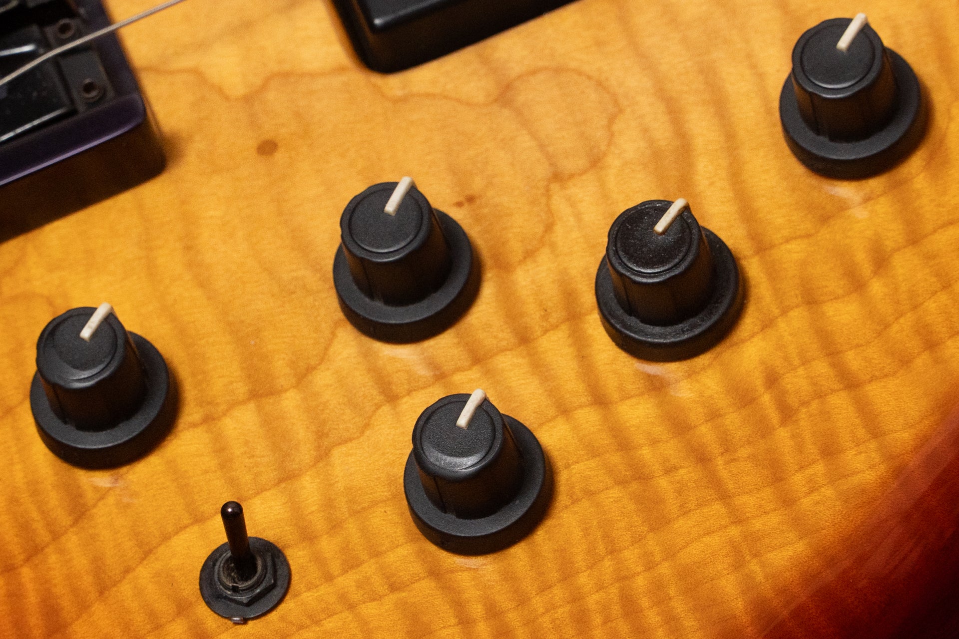 The logo on the headstock is faded. The knobs are somewhat loose when pulled, although there is some resistance. There are no issues with normal playability.