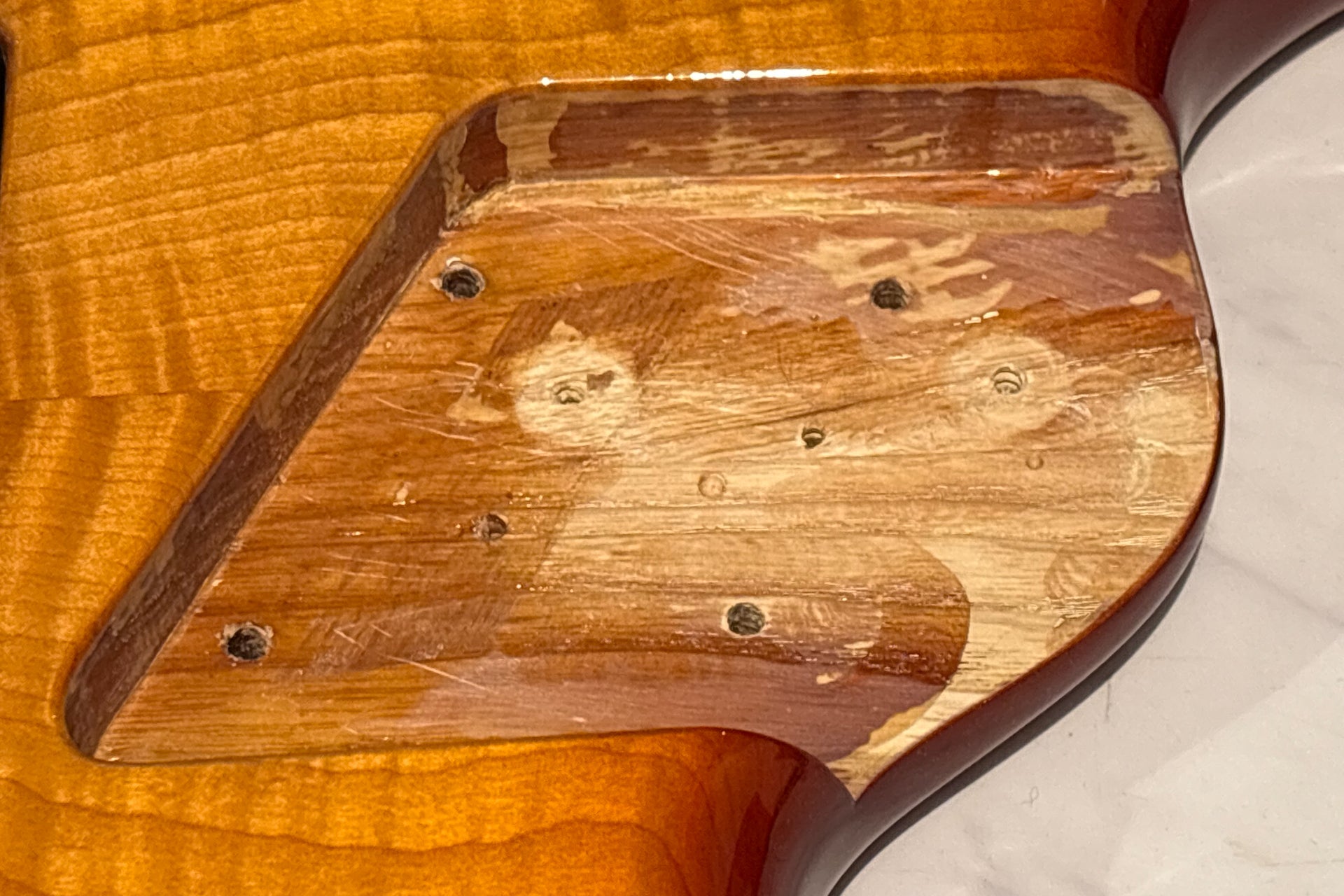 Furthermore, we refinished the guitar in our shop to fill in paint scratches and screw holes.