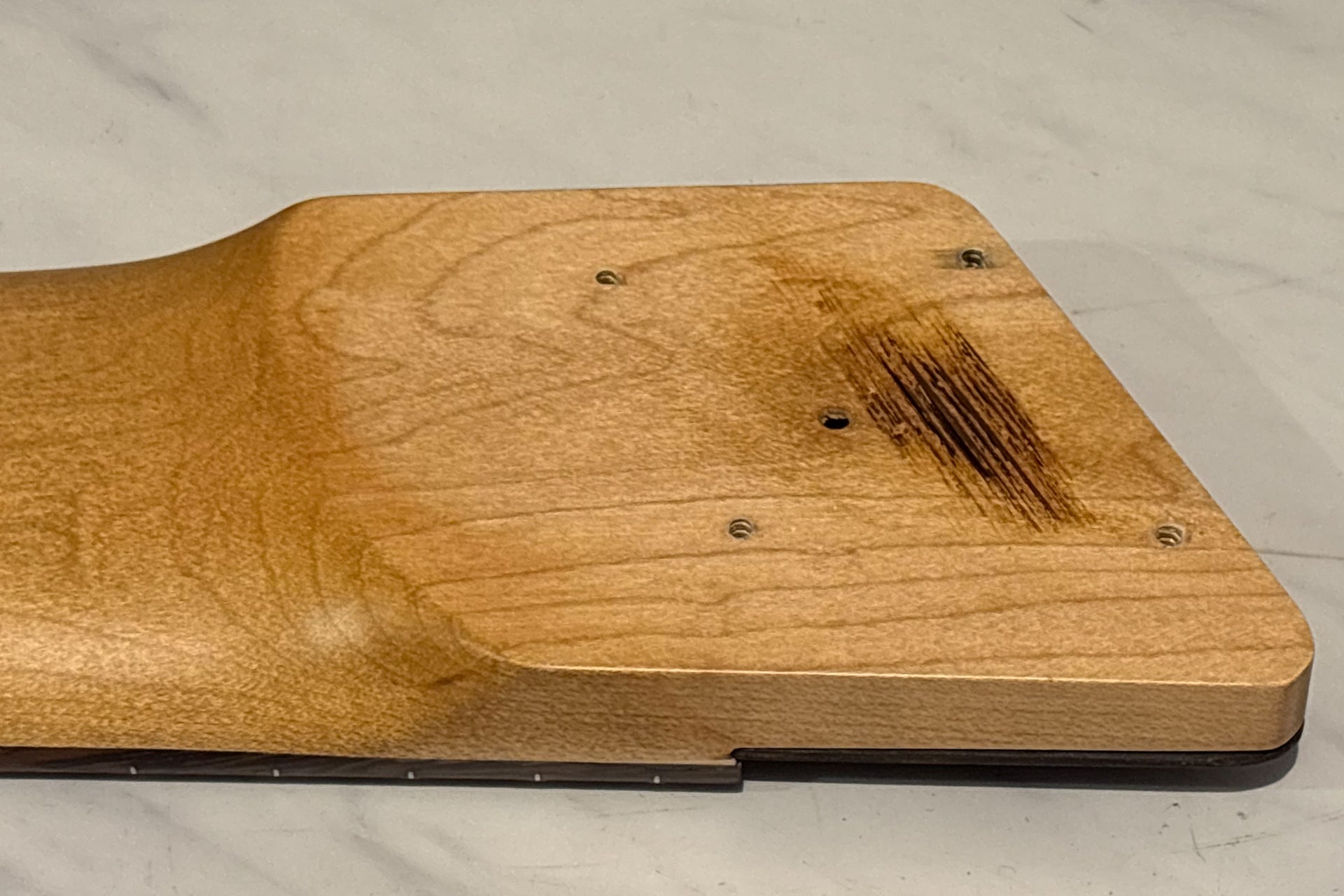 Due to a problem with the truss rod, we replaced the rod and consequently replaced the fingerboard at our shop.