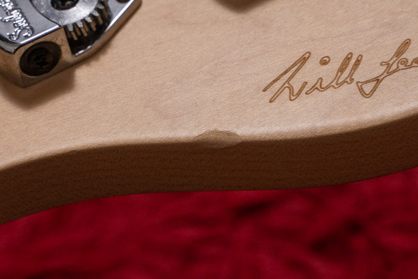 The body is made of swamp ash and the fingerboard is maple, a classic configuration.