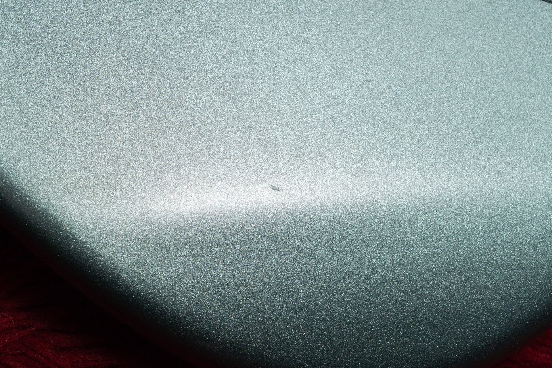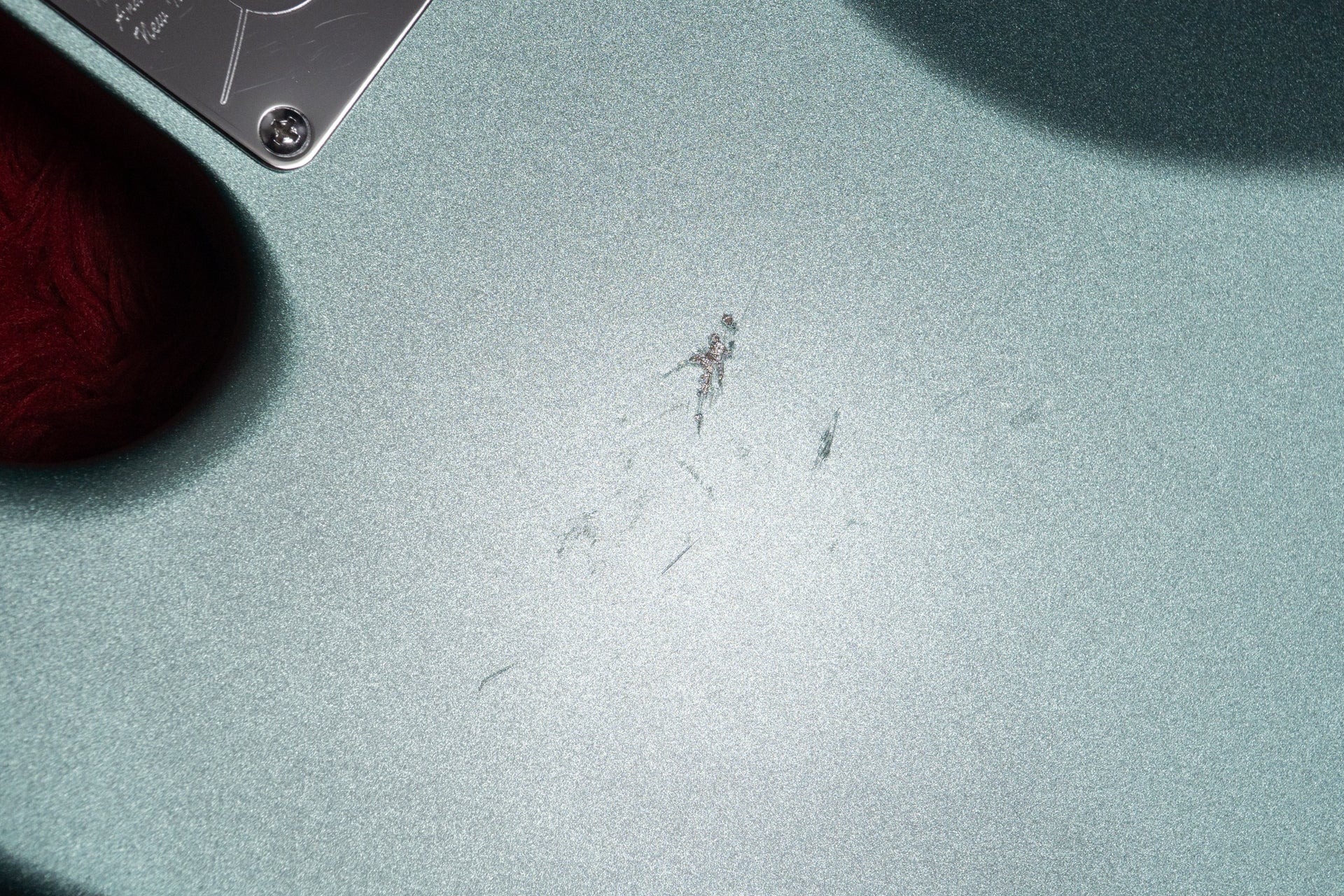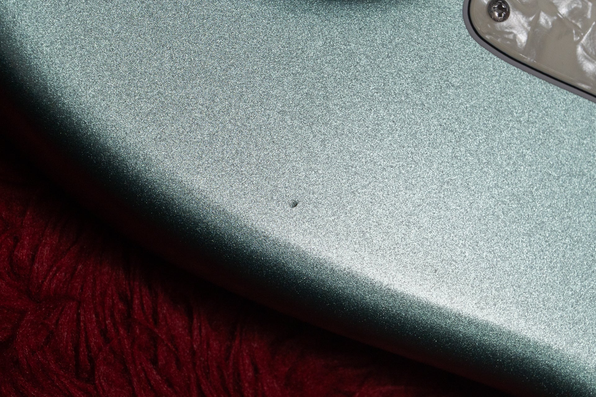 The body and finish show scattered minor scratches and dents. There is a noticeable dent measuring approximately 15.0mm on the back of the body. There are also scattered dents and paint peeling on the headstock.