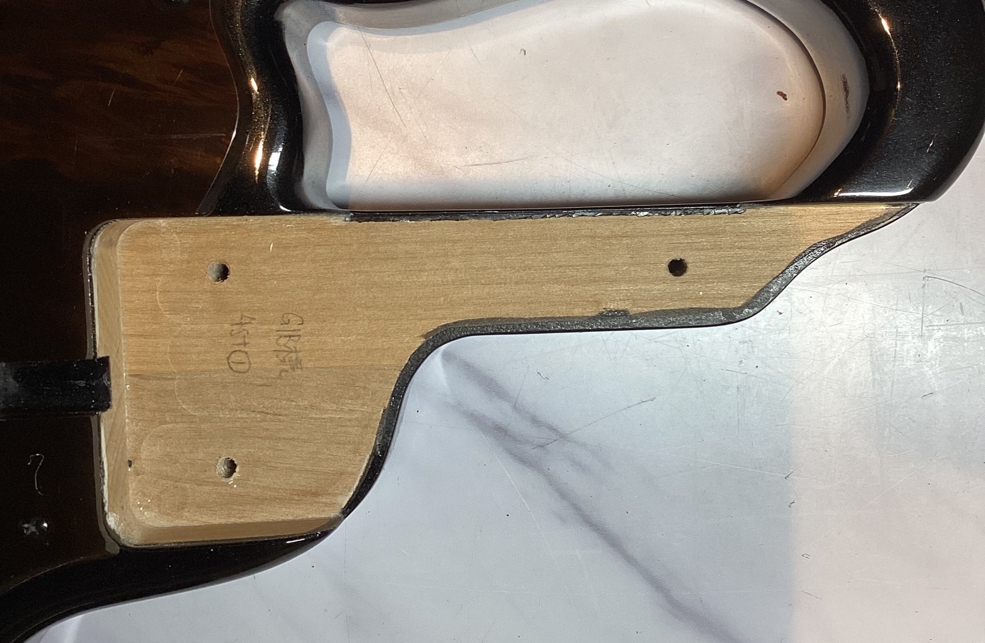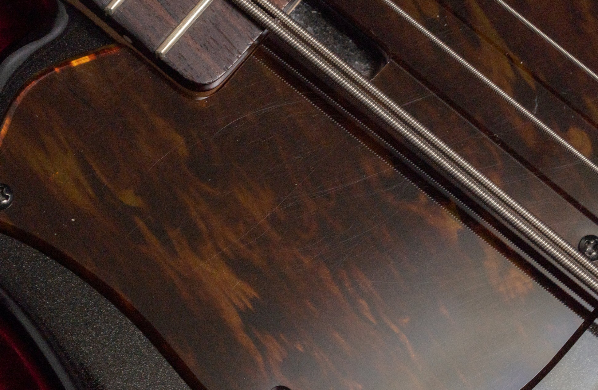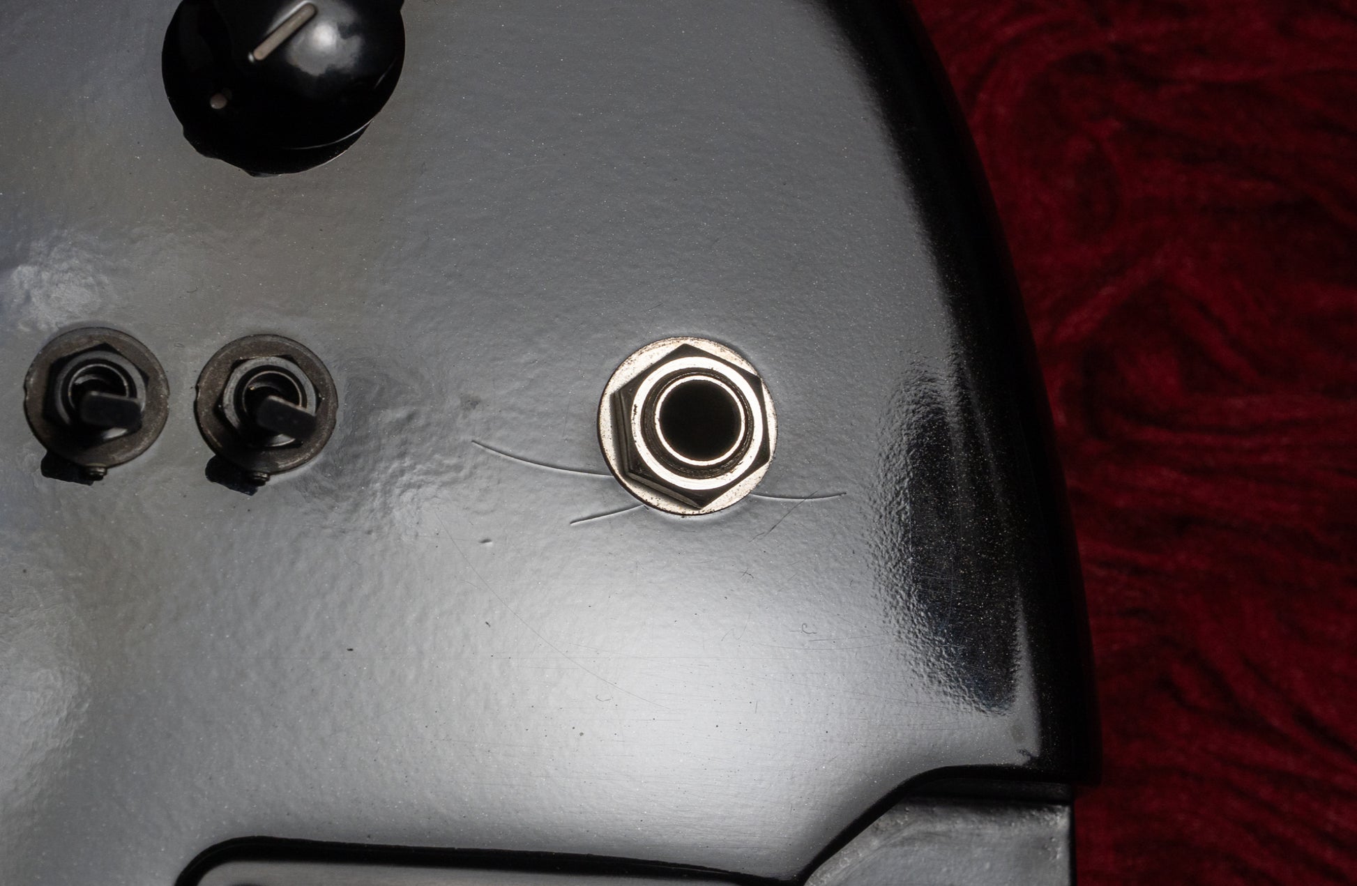 There are some minor scratches on the body and paintwork. There is a paint chip near the indentation at the body end.