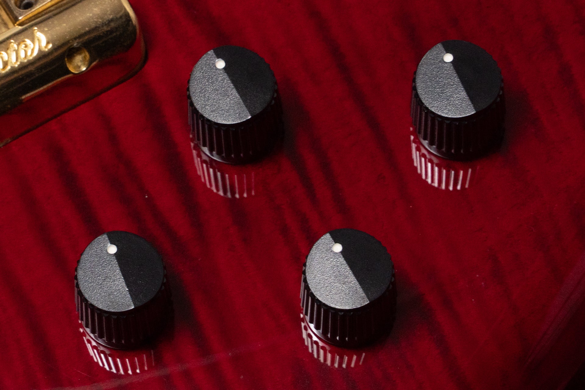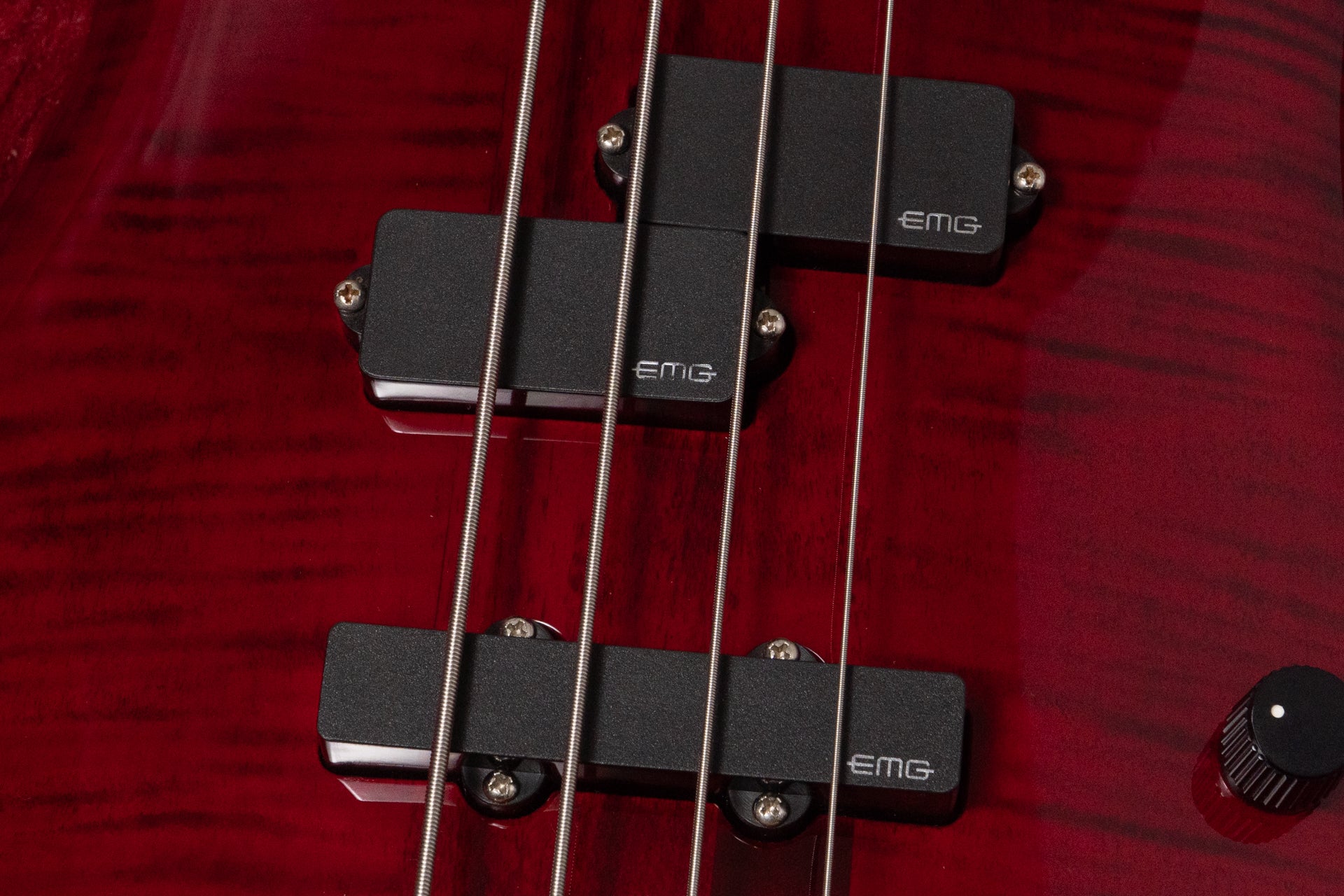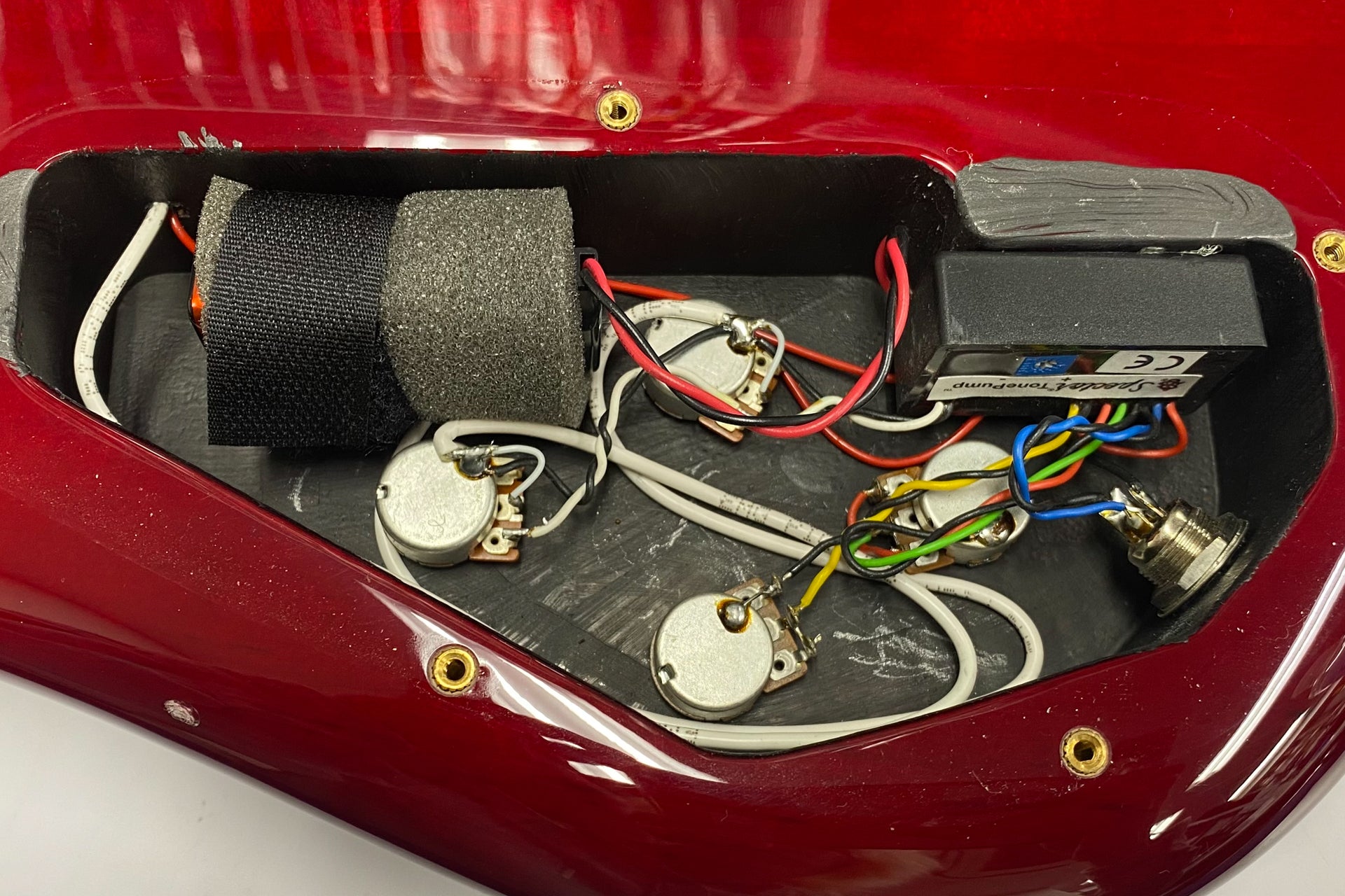 Controls: Neck PU volume, bridge PU volume, treble, bass, preamp gain (inside cavity)