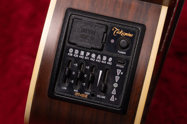 The pickups are under-saddle piezo types, and the preamp is a Takamine PTU CT-4BII.