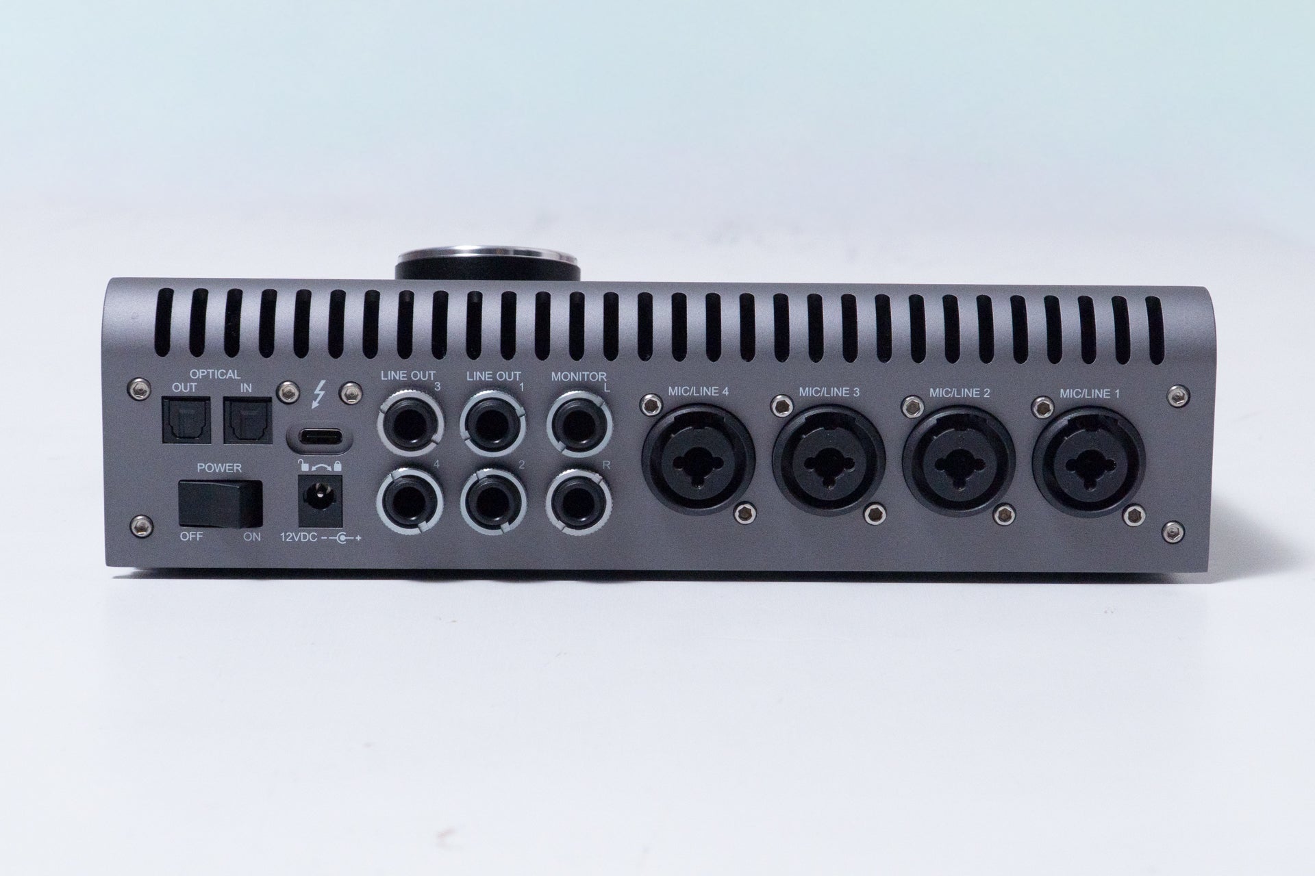 In addition to 4 inputs and 6 outputs on the rear panel, it features two Hi-Z inputs and two headphone outputs on the front panel.